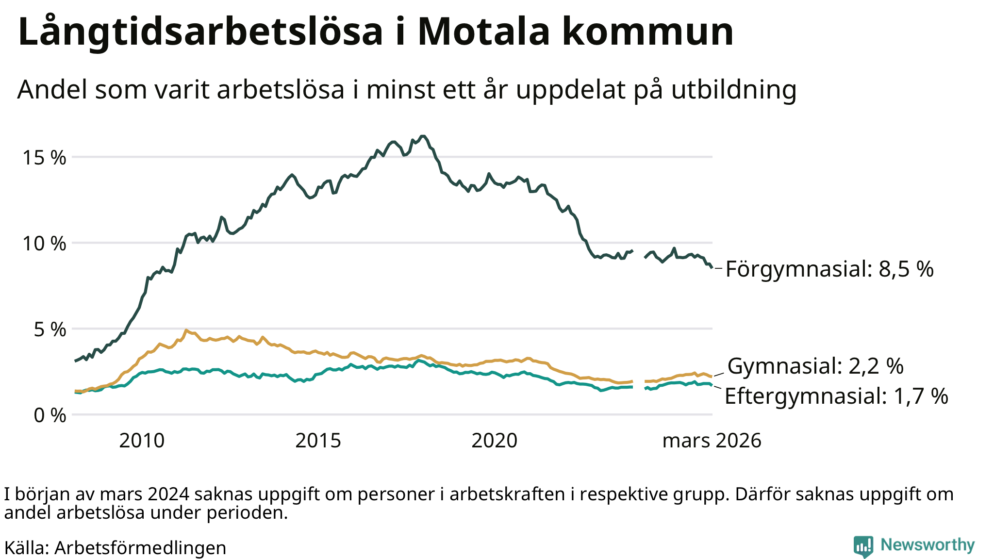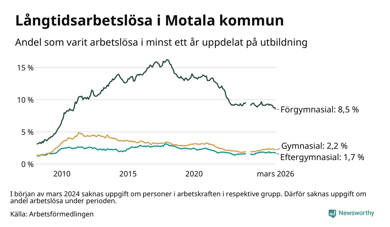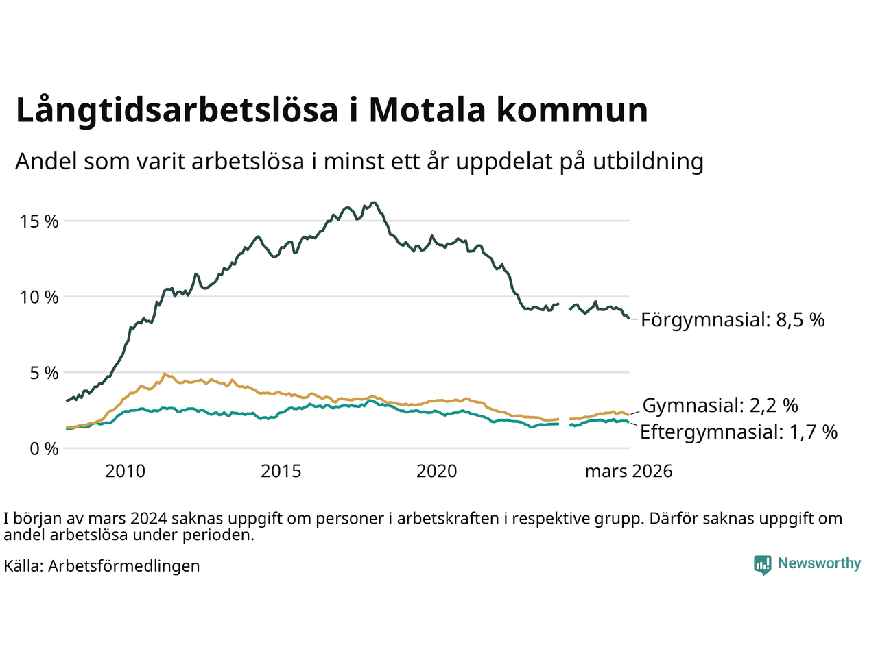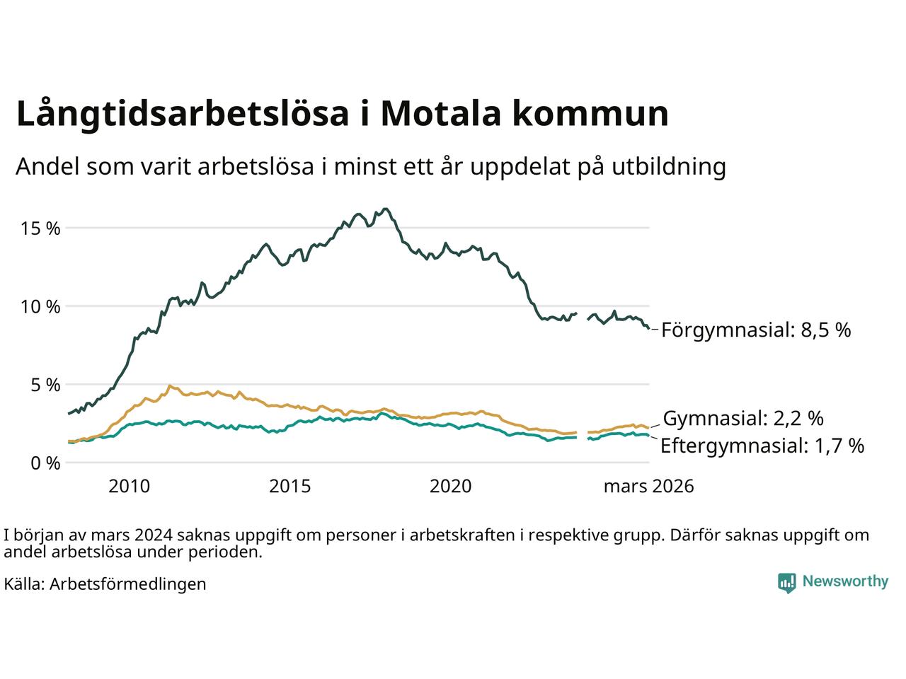 I mars hade 602 Motalabor varit arbetslösa i minst ett år, vilket är 21 färre än månaden innan. 602 personer motsvarar 2,9 procent av arbetskraften i kommunen – andelen långtidsarbetslösa är ungefär på samma nivå som för ett år sedan.