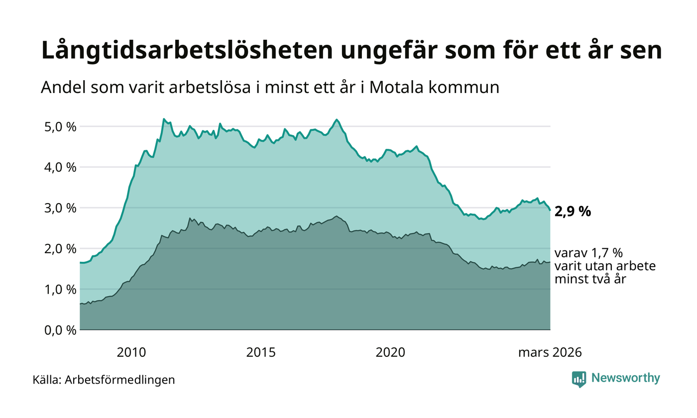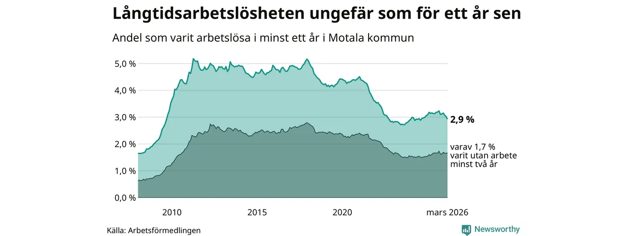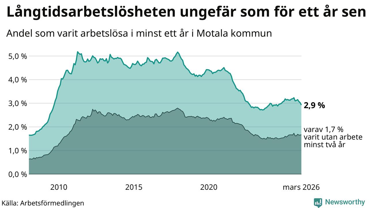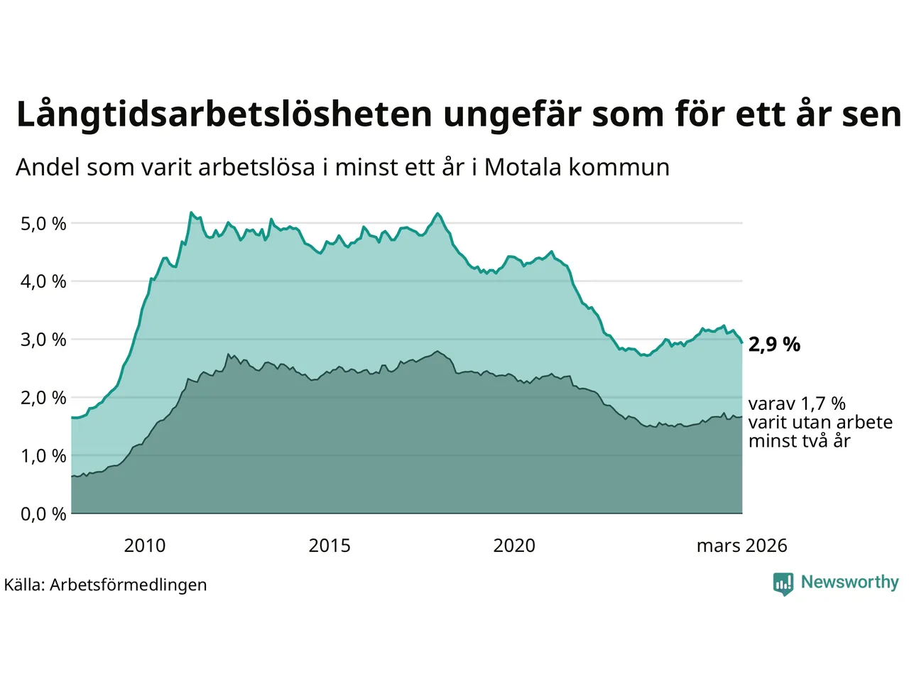 Andelen som varit utan arbete i minst ett år i Motala var ungefär lika stor i mars jämfört med samma månad för ett år sedan. Det visar Arbetsfömedlingens senaste månadsstatistik.