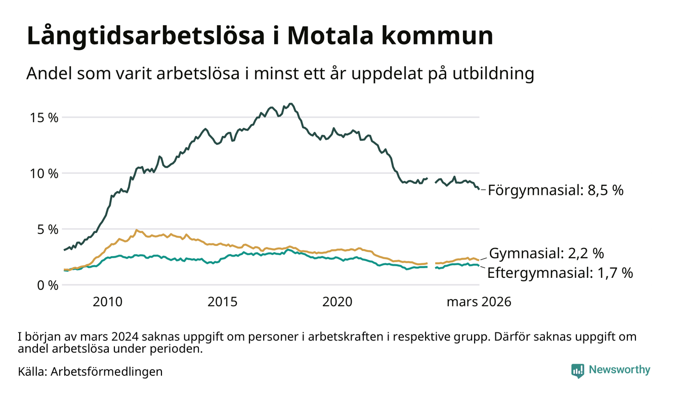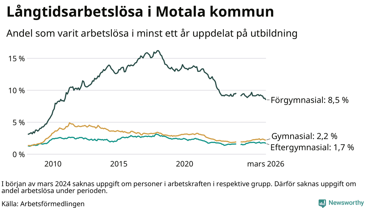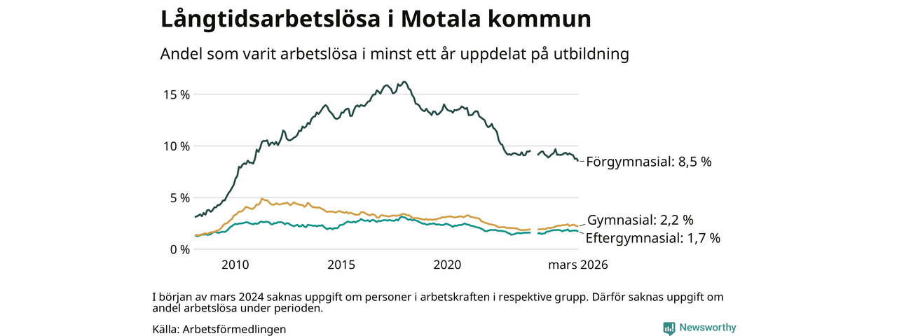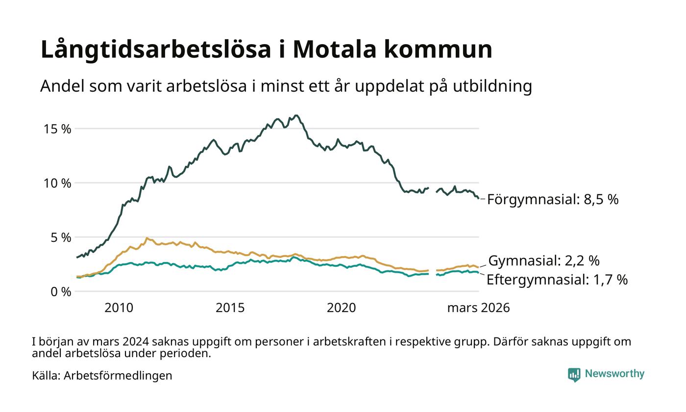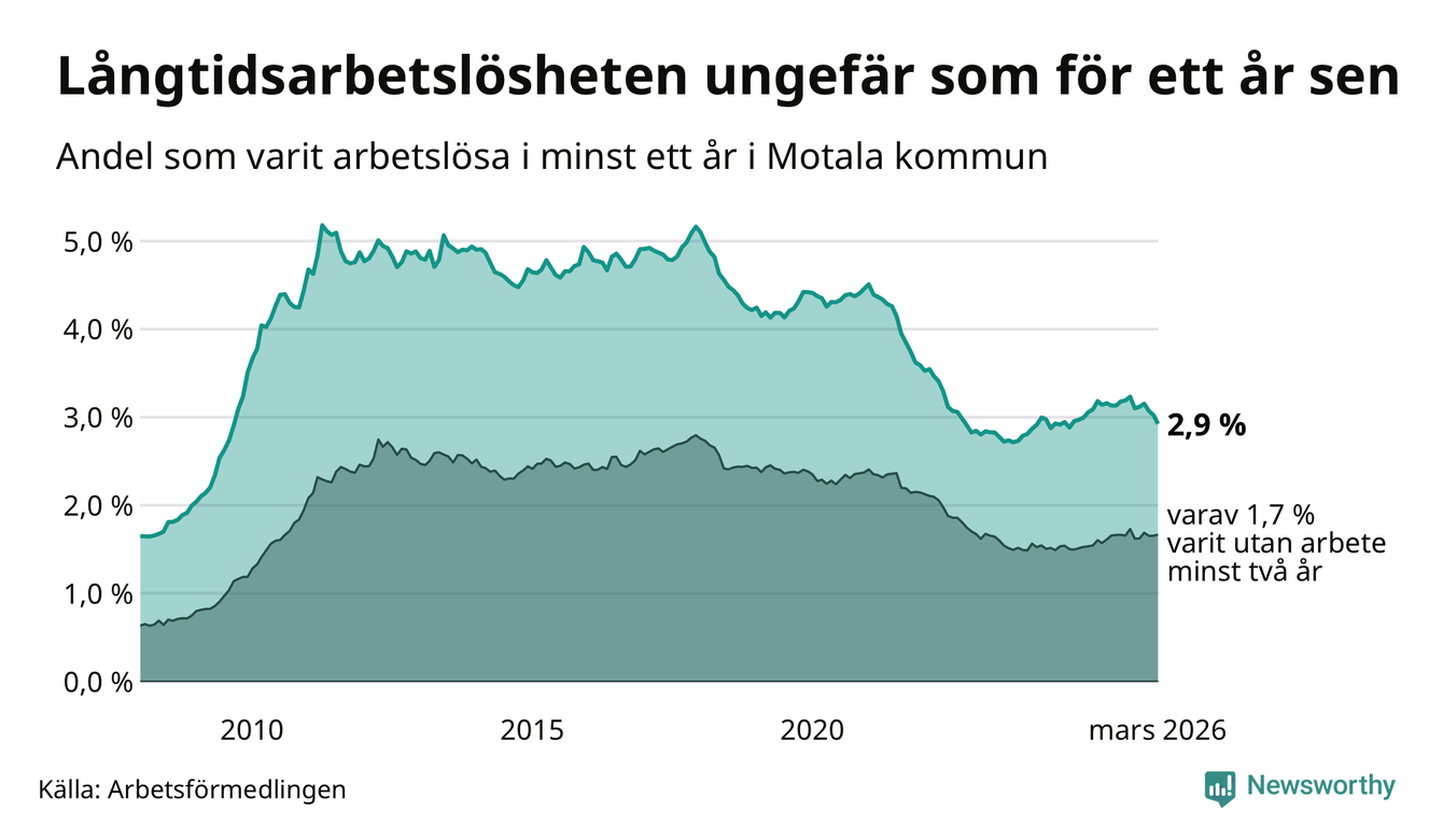 Andelen som varit utan arbete i minst ett år i Motala var ungefär lika stor i mars jämfört med samma månad för ett år sedan. Det visar Arbetsfömedlingens senaste månadsstatistik.