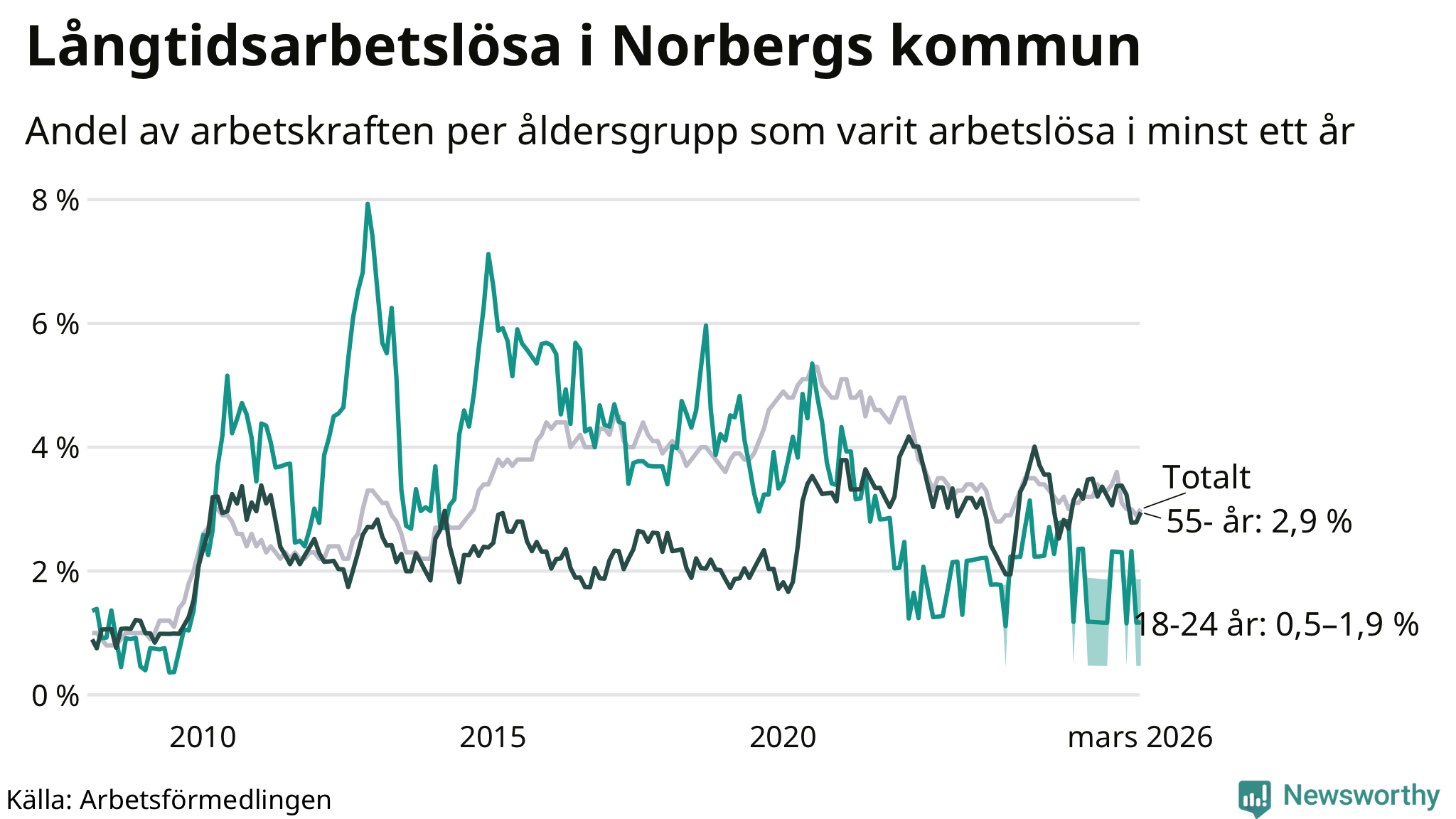 Graf: Andel arbetslösa uppdelat i åldersgrupper i Norberg