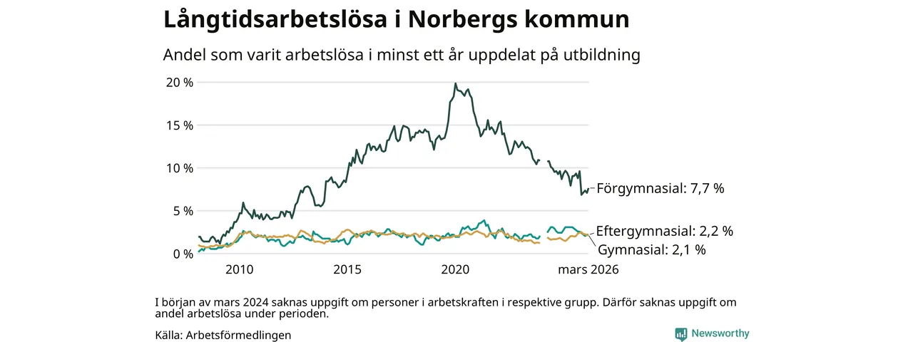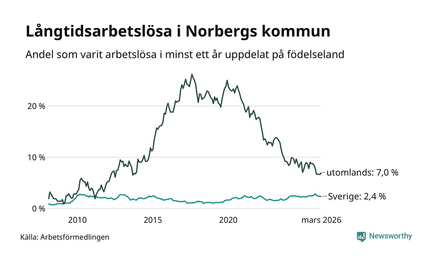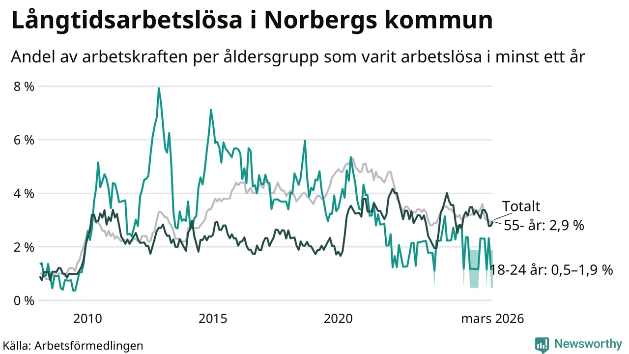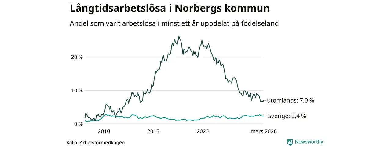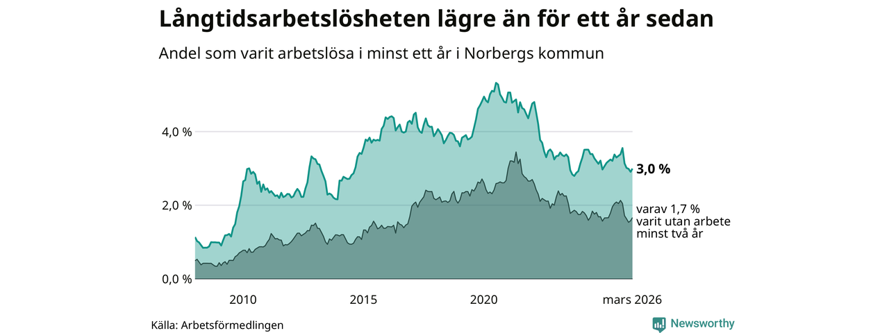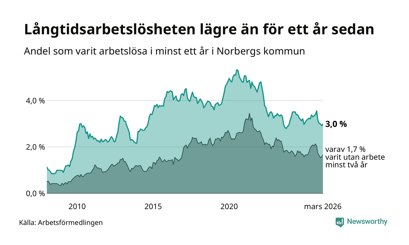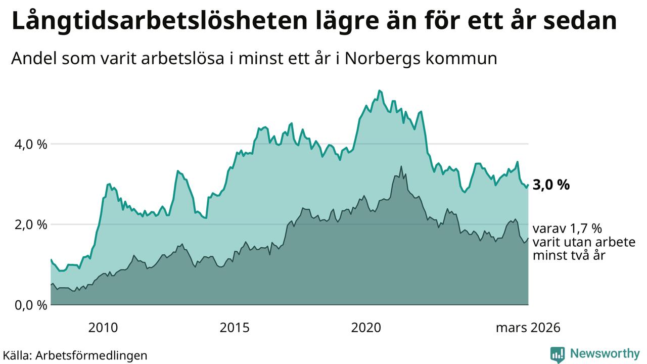 I mars hade 72 Norbergsbor varit arbetslösa i minst ett år, vilket är två fler än månaden innan. Det är den första månaden sedan oktober 2025 som antalet arbetslösa ökar. 72 personer motsvarar 3,0 procent av arbetskraften i kommunen – andelen långtidsarbetslösa är 0,2 procentenheter lägre än samma månad för ett år sedan.