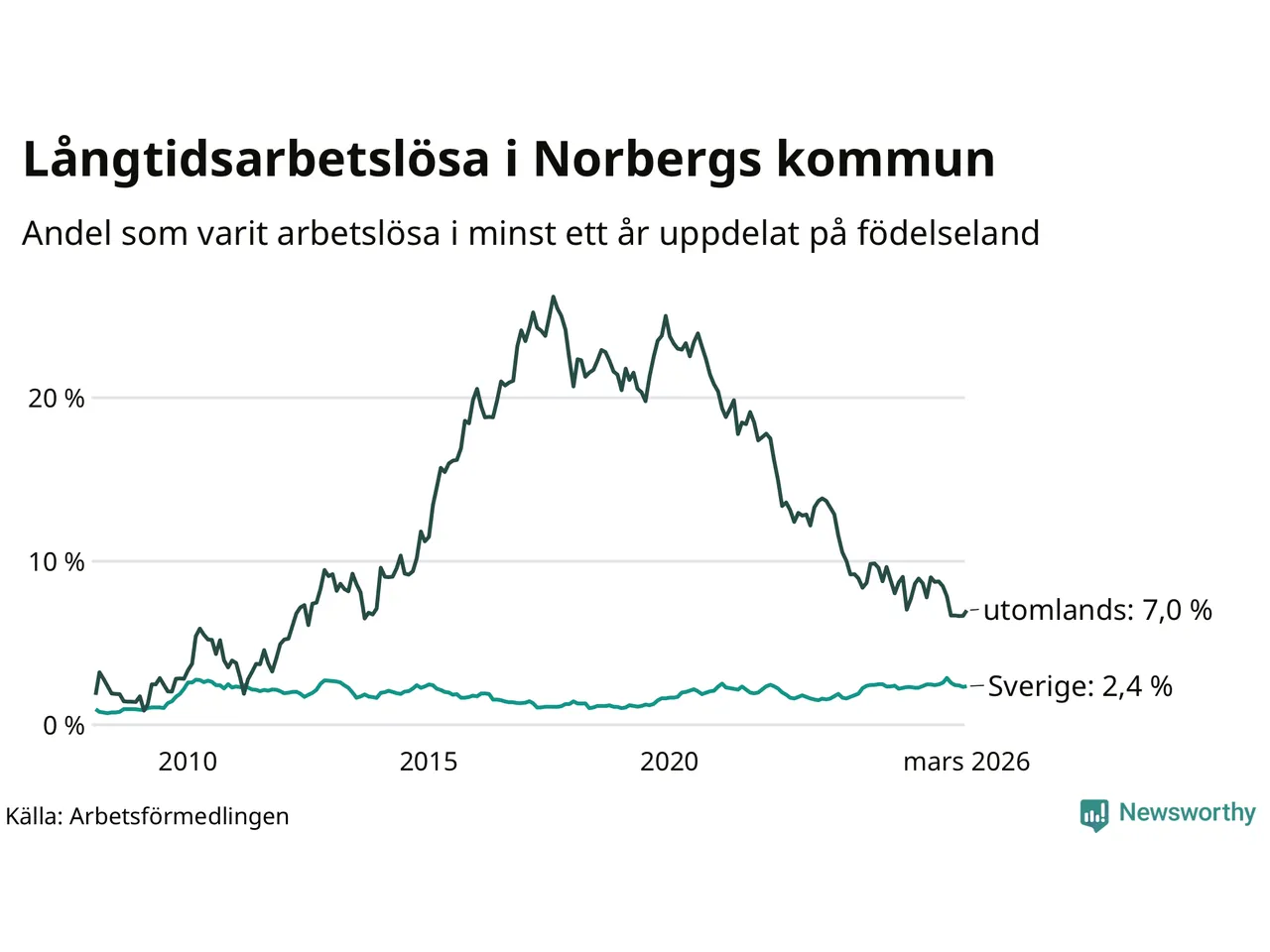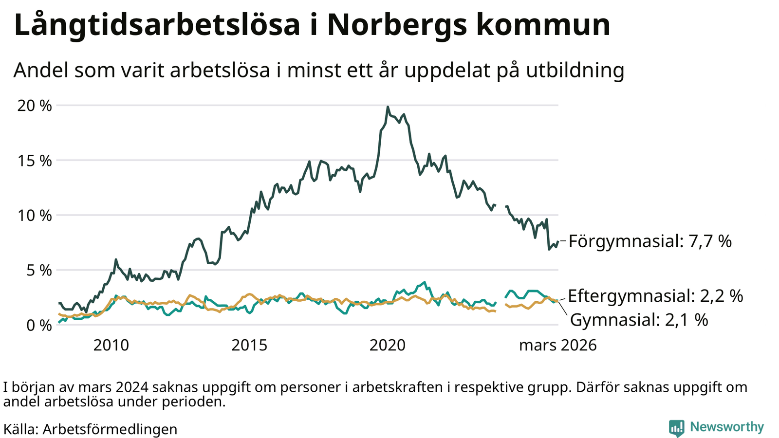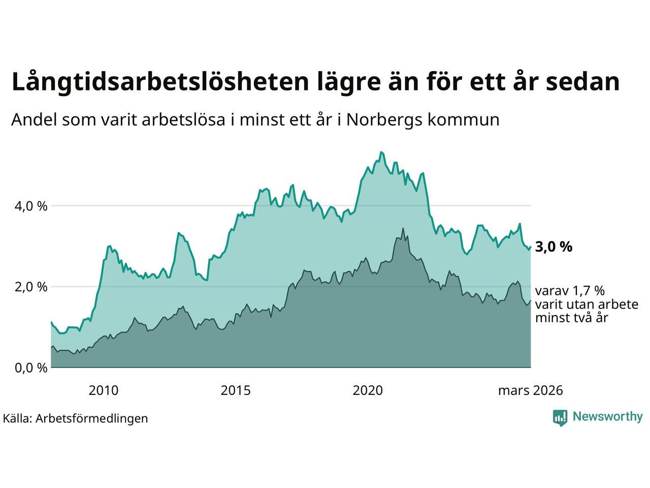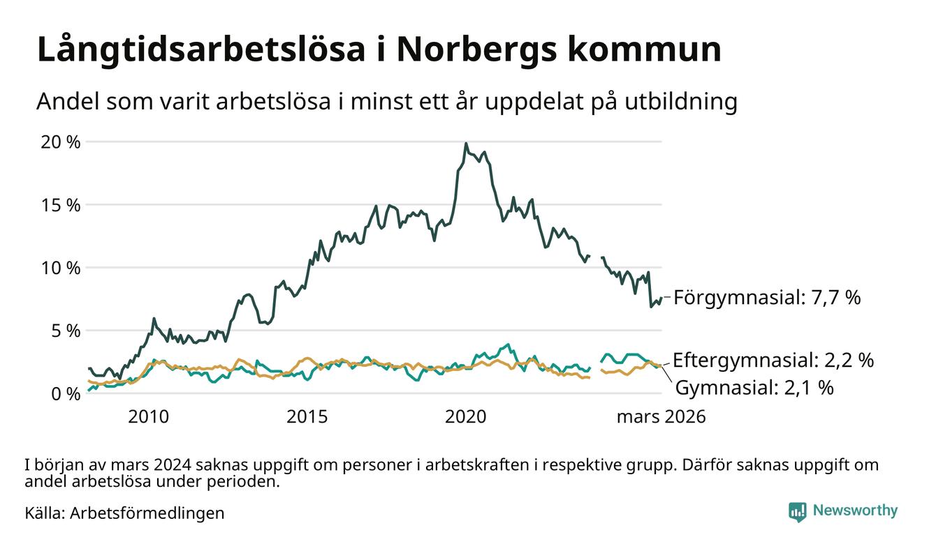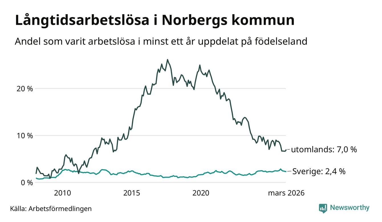 I mars hade 72 Norbergsbor varit arbetslösa i minst ett år, vilket är två fler än månaden innan. Det är den första månaden sedan oktober 2025 som antalet arbetslösa ökar. 72 personer motsvarar 3,0 procent av arbetskraften i kommunen – andelen långtidsarbetslösa är 0,2 procentenheter lägre än samma månad för ett år sedan.