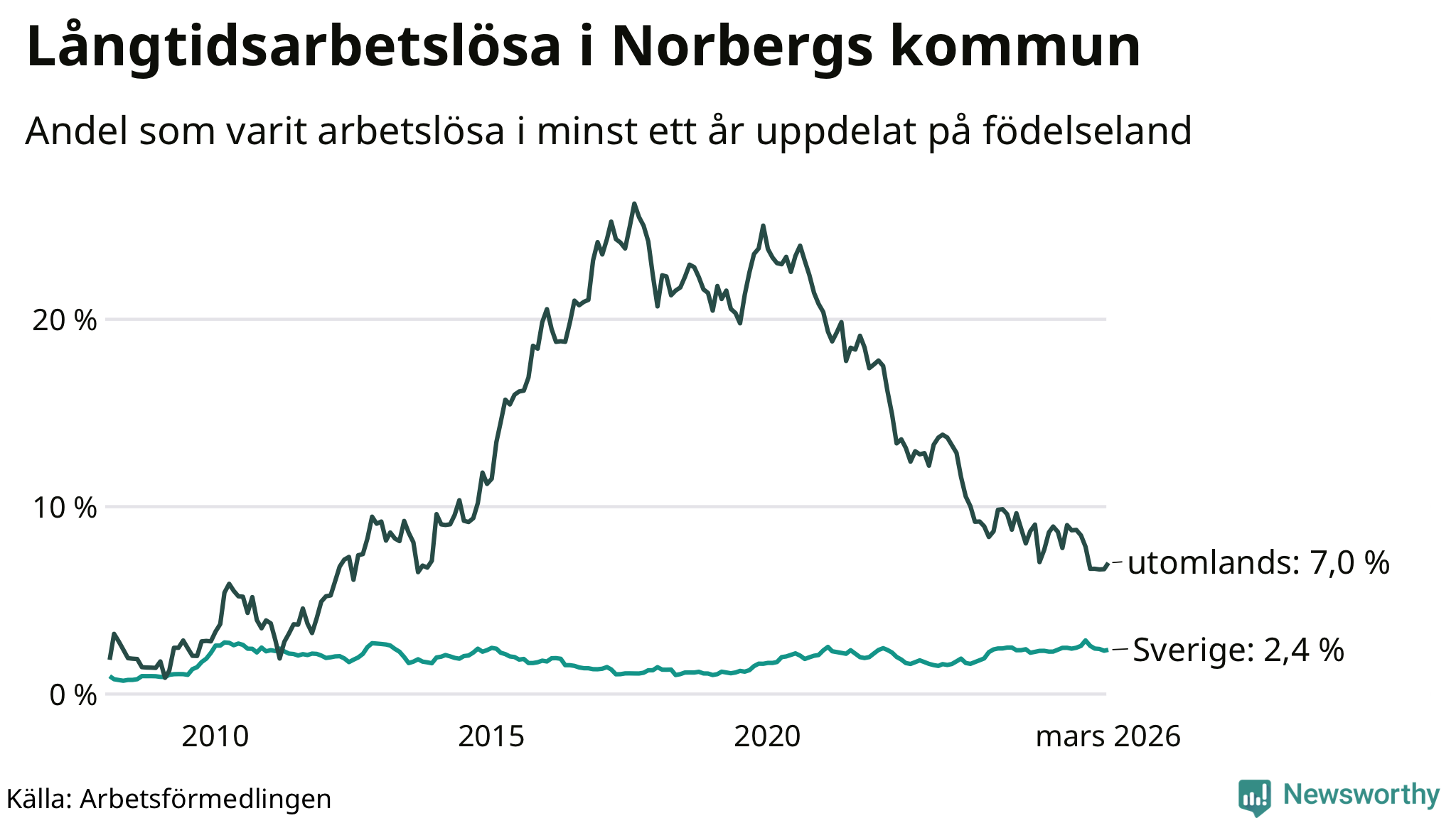 Graf: Andel arbetslösa i Norberg som varit utan arbete i minst 12 månader