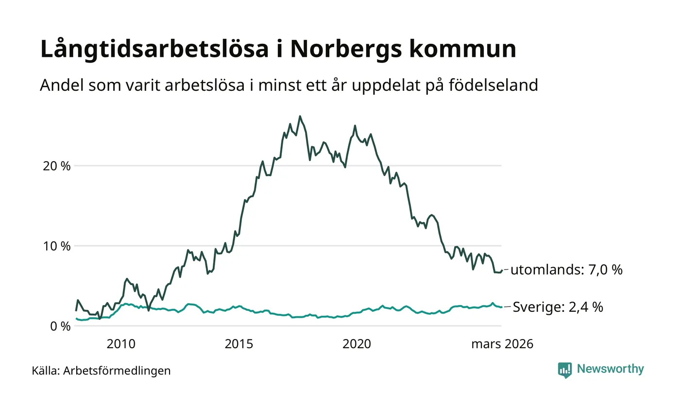 49 av de långtidsarbetslösa i Norberg är födda i Sverige, medan 23 är födda utomlands. Det innebär att långtidsarbetslösheten bland Sverigefödda är 2,4 procent, medan den är tre gånger så hög – 7,0 procent – bland födda utomlands. Även i riket som helhet är arbetslösheten högre bland utrikesfödda.
