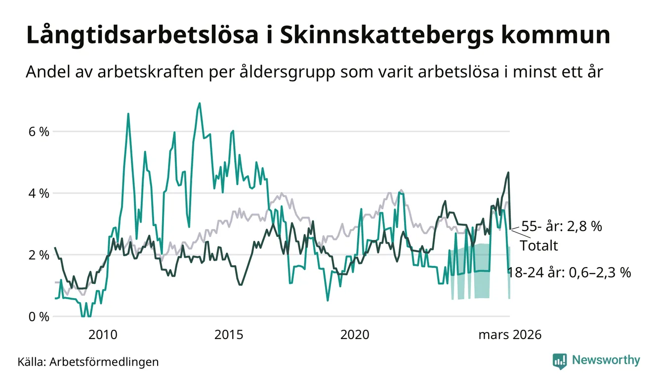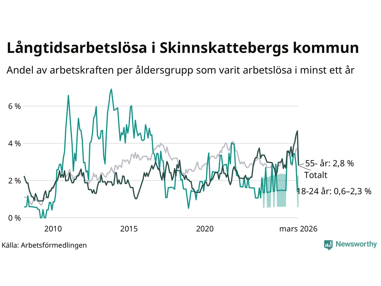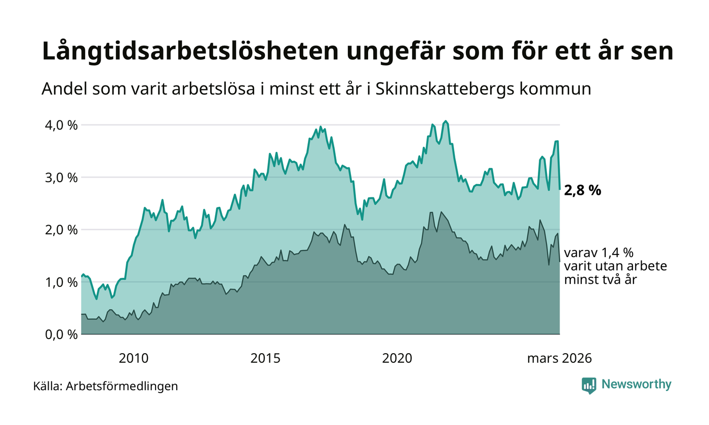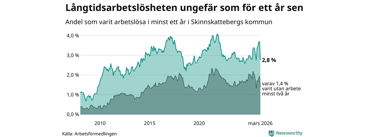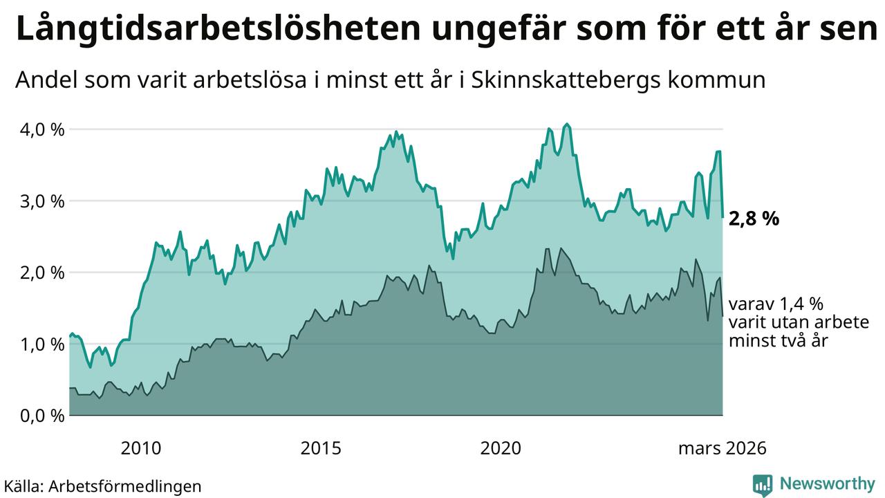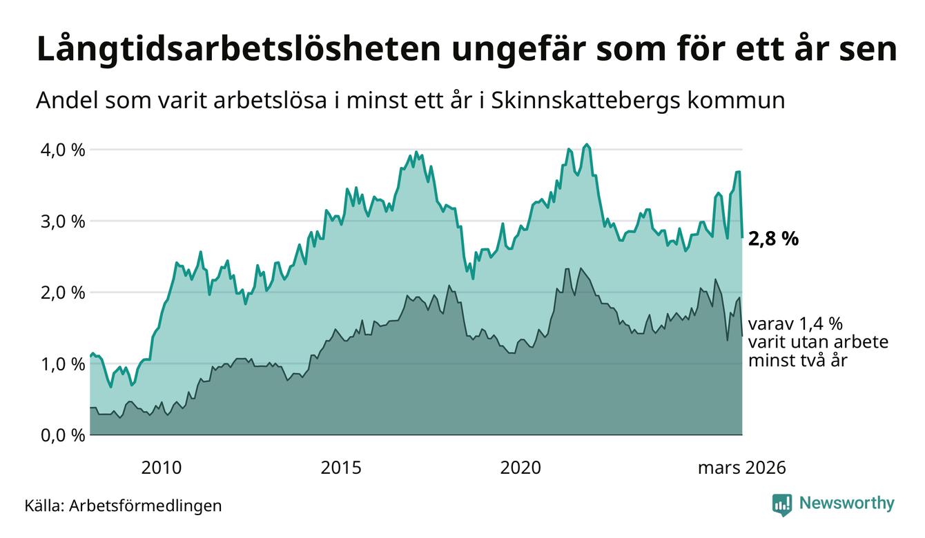 I mars hade 50 Skinnskattebergsbor varit arbetslösa i minst ett år, vilket är 17 färre än månaden innan. Det är den första månaden sedan oktober 2025 som antalet arbetslösa minskar. 50 personer motsvarar 2,8 procent av arbetskraften i kommunen – andelen långtidsarbetslösa är ungefär på samma nivå som för ett år sedan.