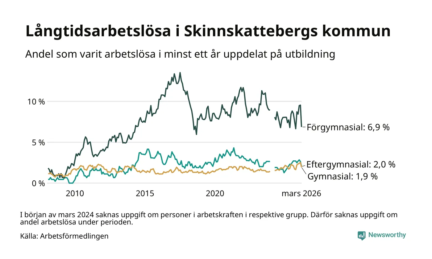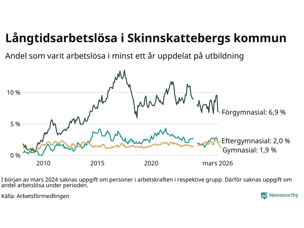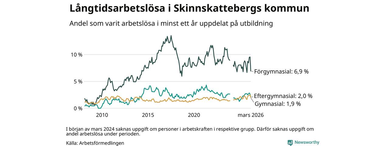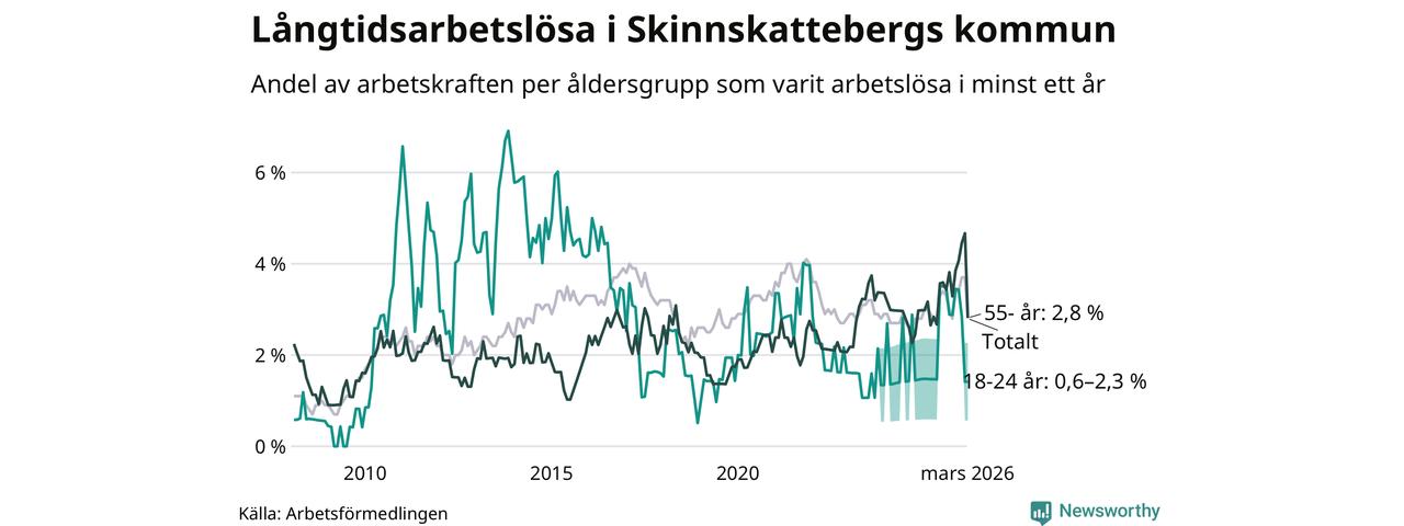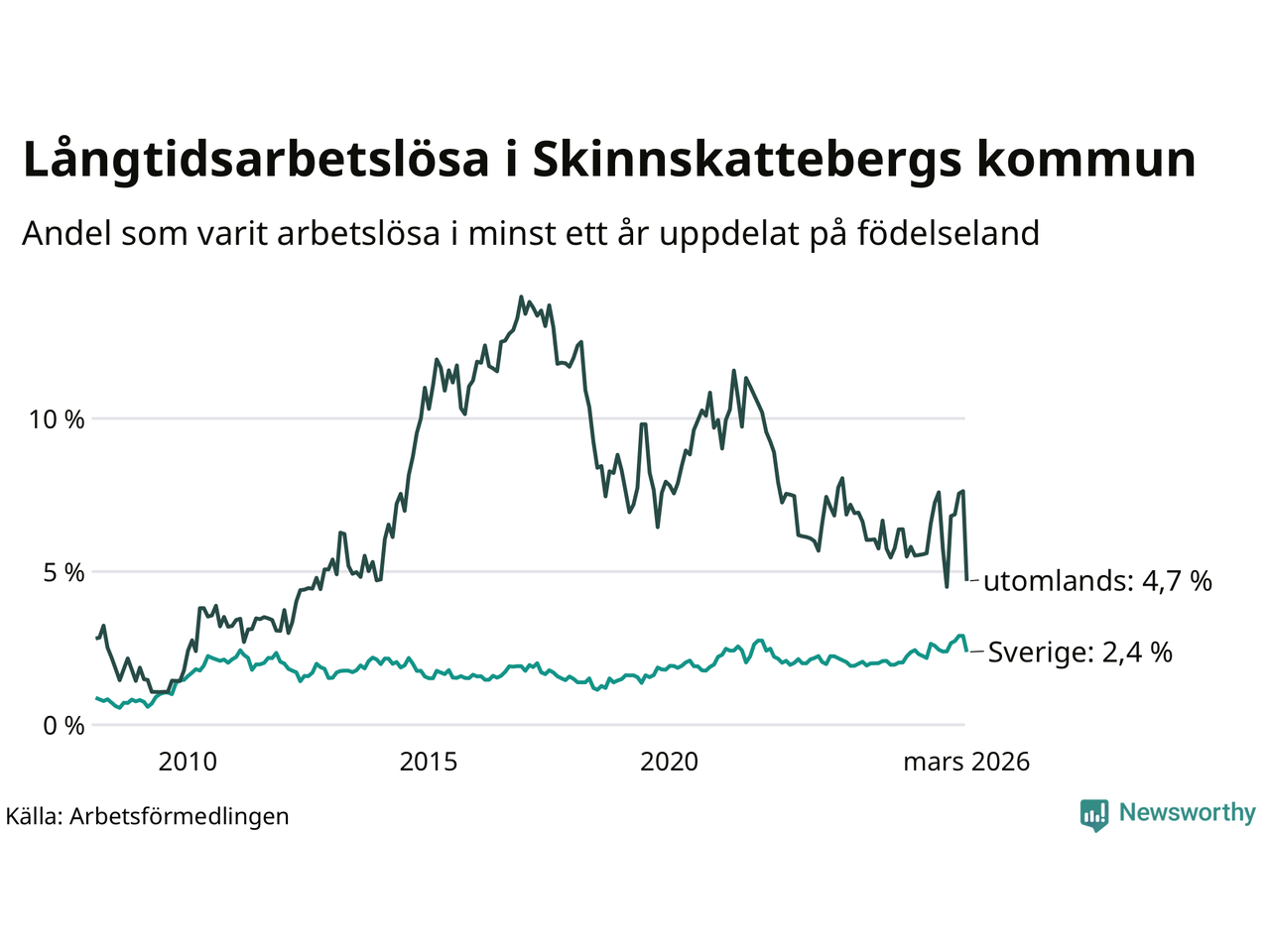 I mars hade 50 Skinnskattebergsbor varit arbetslösa i minst ett år, vilket är 17 färre än månaden innan. Det är den första månaden sedan oktober 2025 som antalet arbetslösa minskar. 50 personer motsvarar 2,8 procent av arbetskraften i kommunen – andelen långtidsarbetslösa är ungefär på samma nivå som för ett år sedan.