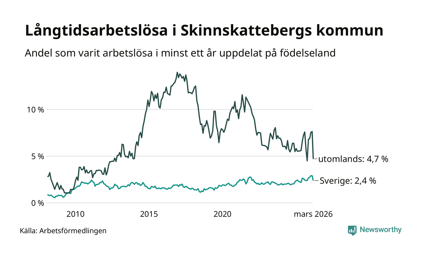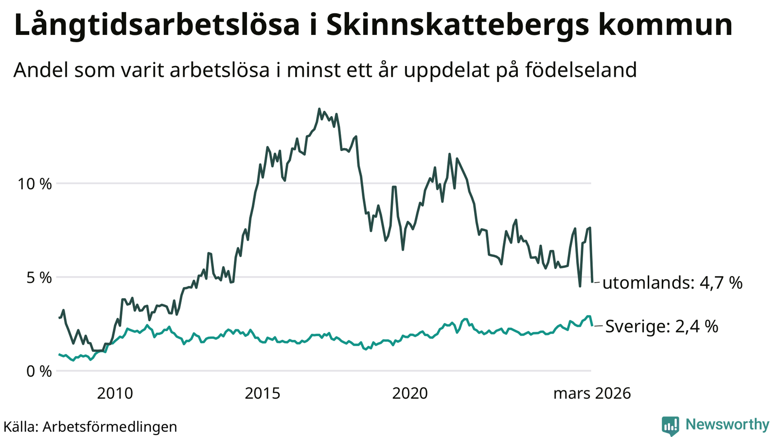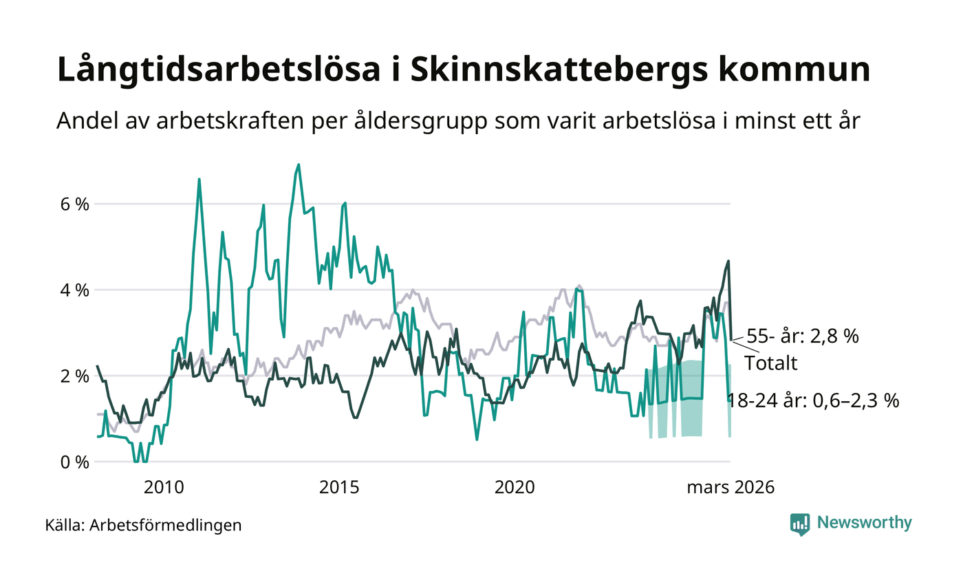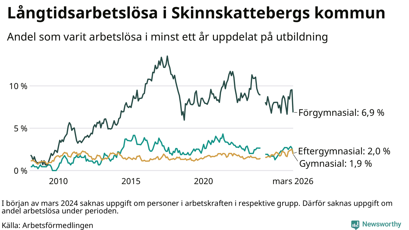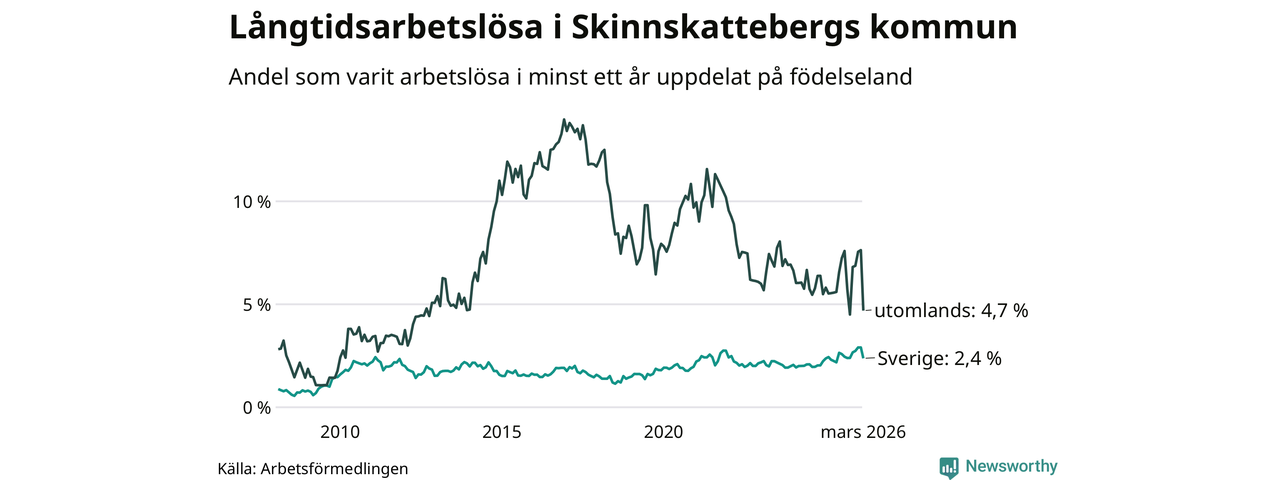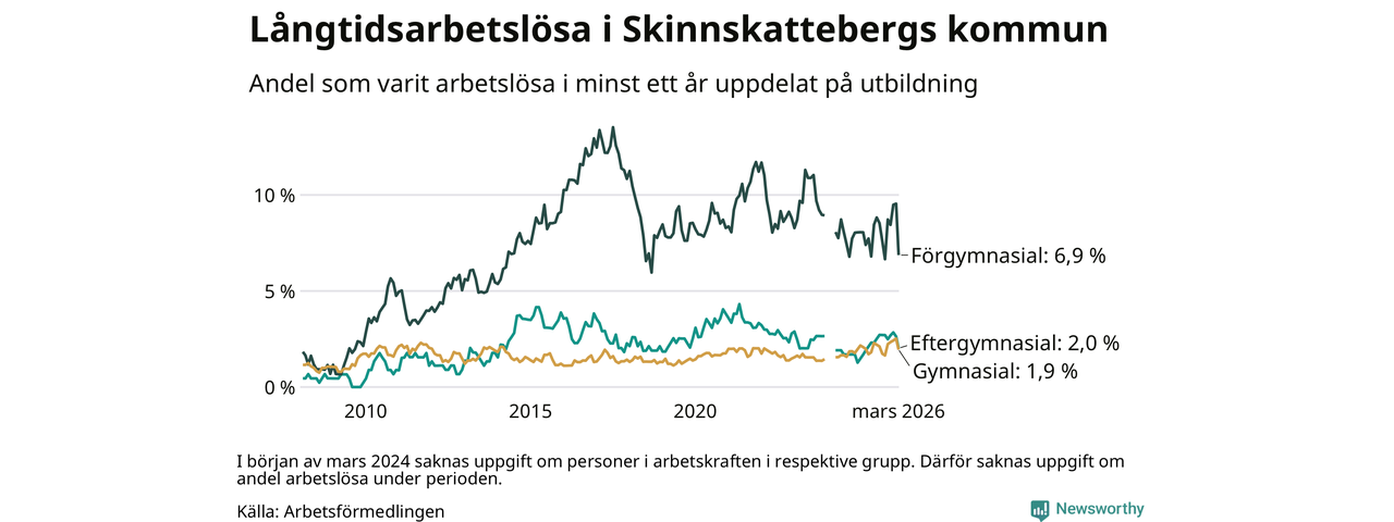 I mars hade 50 Skinnskattebergsbor varit arbetslösa i minst ett år, vilket är 17 färre än månaden innan. Det är den första månaden sedan oktober 2025 som antalet arbetslösa minskar. 50 personer motsvarar 2,8 procent av arbetskraften i kommunen – andelen långtidsarbetslösa är ungefär på samma nivå som för ett år sedan.