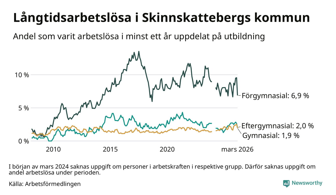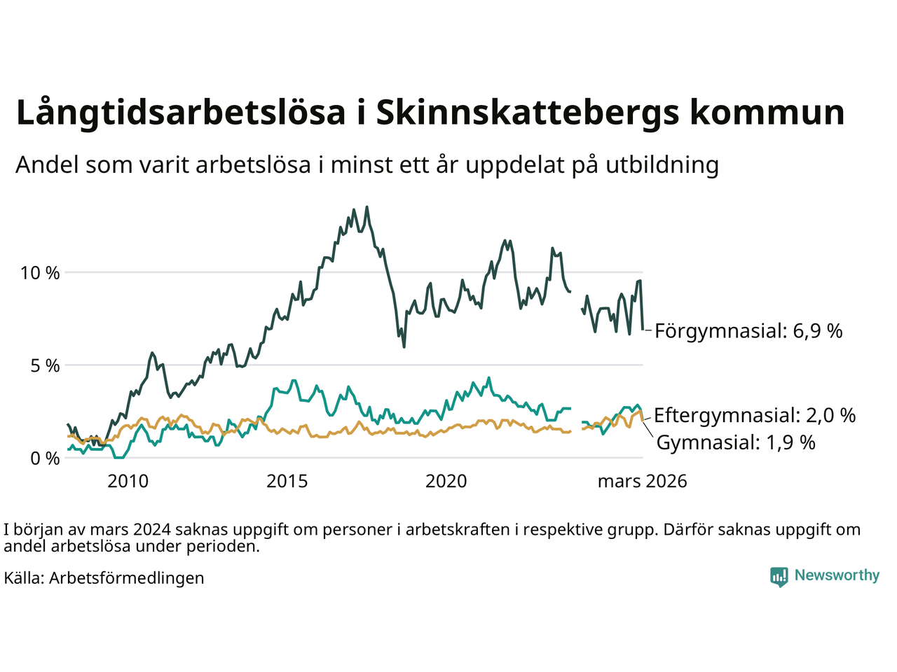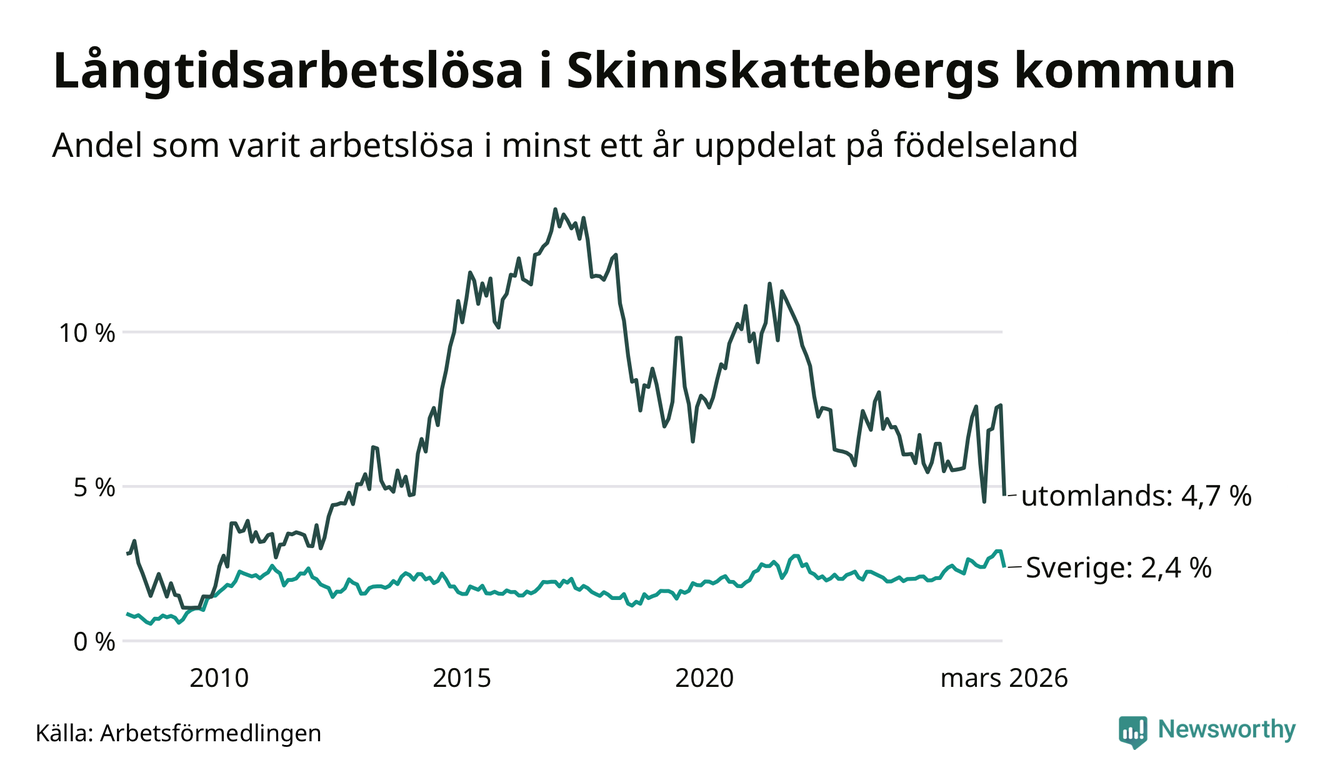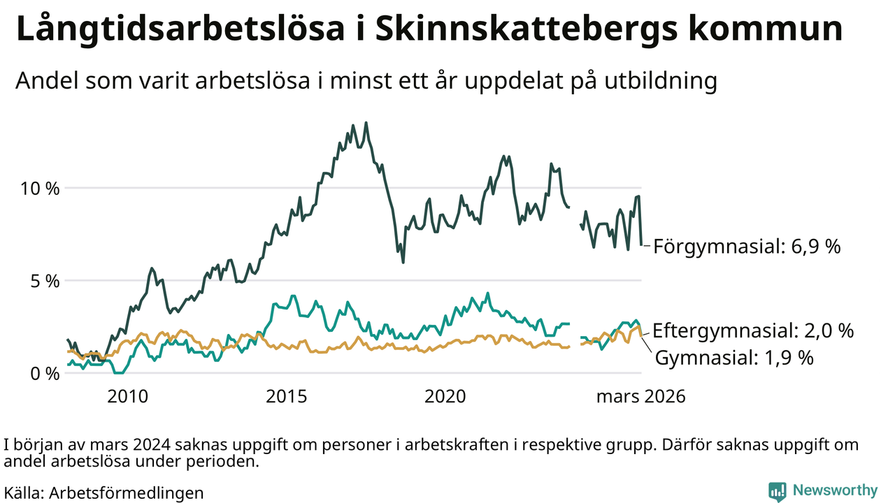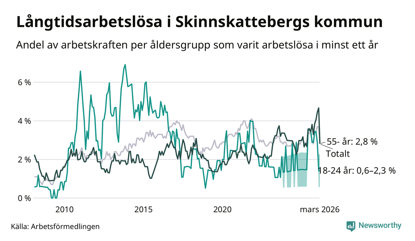 I mars hade 50 Skinnskattebergsbor varit arbetslösa i minst ett år, vilket är 17 färre än månaden innan. Det är den första månaden sedan oktober 2025 som antalet arbetslösa minskar. 50 personer motsvarar 2,8 procent av arbetskraften i kommunen – andelen långtidsarbetslösa är ungefär på samma nivå som för ett år sedan.