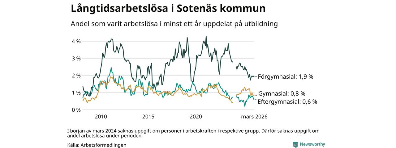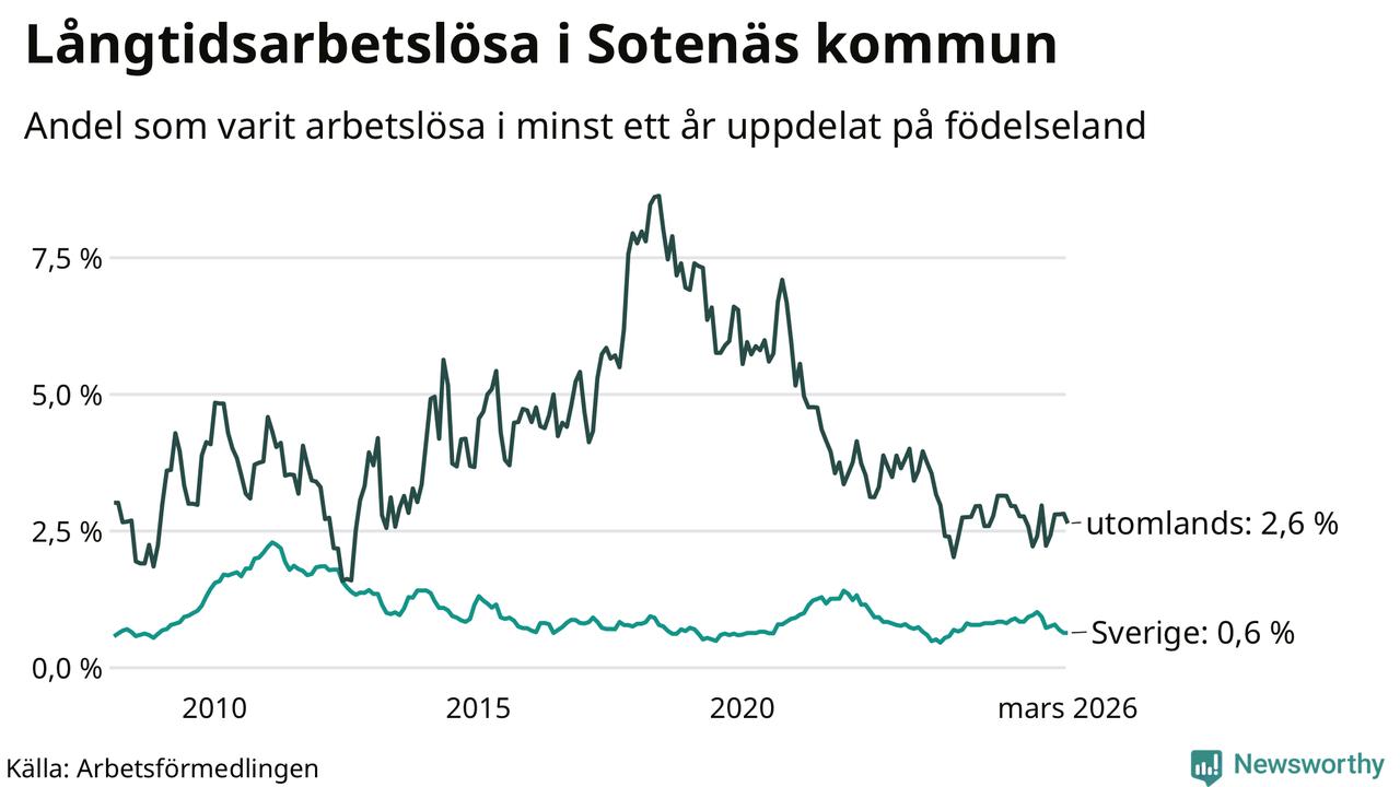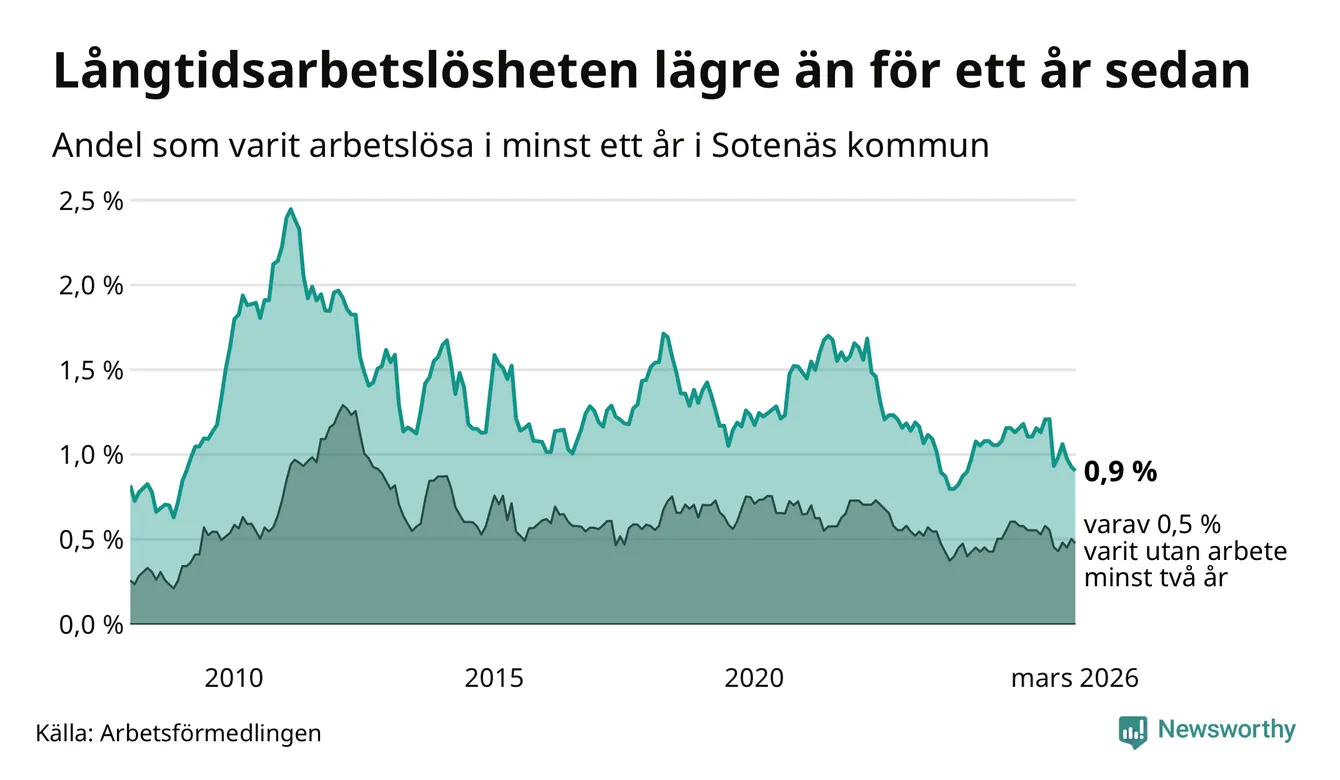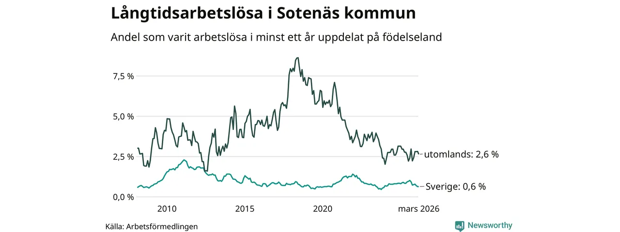 I mars hade 36 Sotenäsbor varit arbetslösa i minst ett år, vilket är en färre än månaden innan. 36 personer motsvarar 0,9 procent av arbetskraften i kommunen – andelen långtidsarbetslösa är 0,3 procentenheter lägre än samma månad för ett år sedan. Sotenäs tillhör de kommuner som har lägst andel långtidsarbetslösa i hela landet just nu.