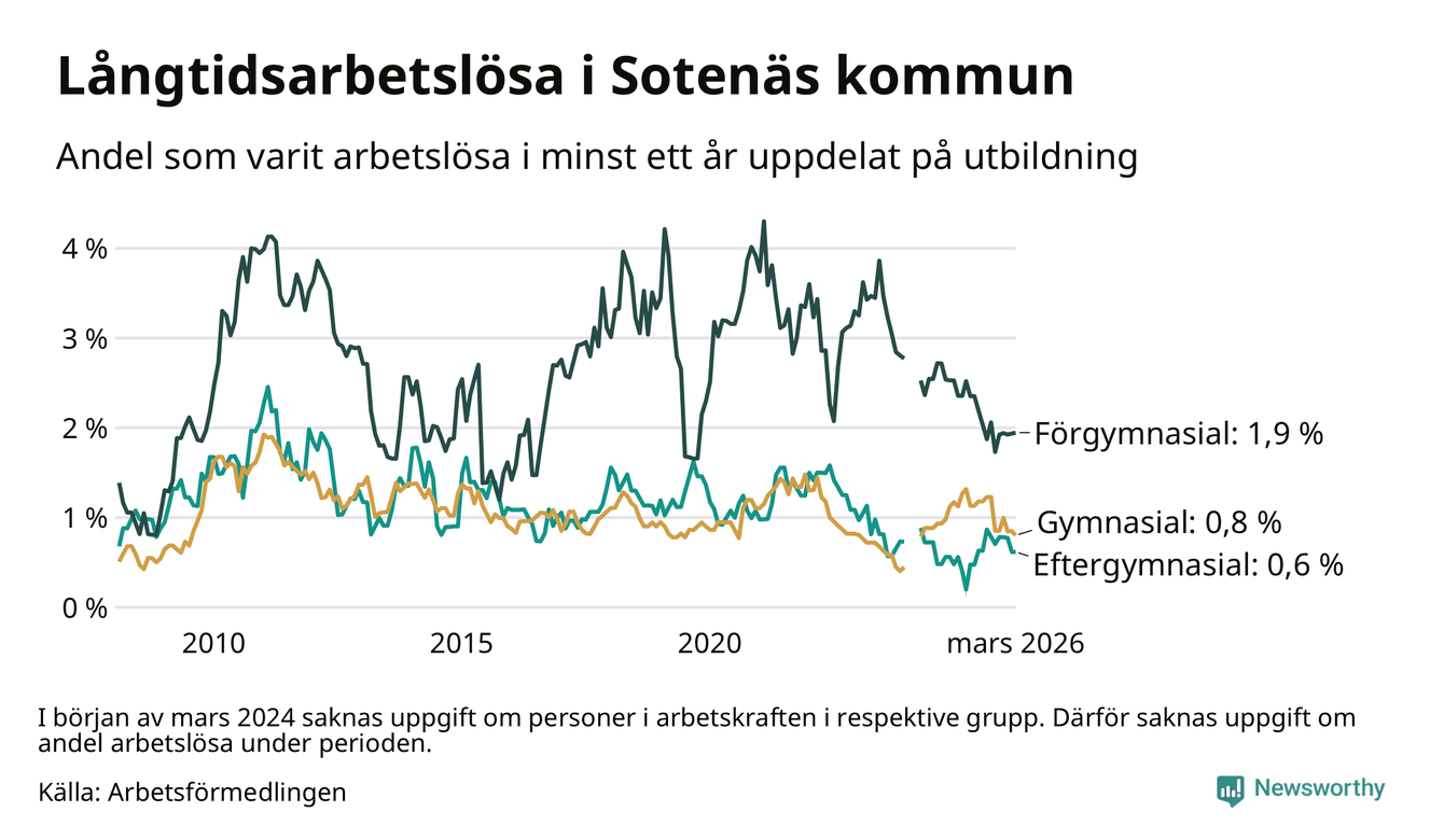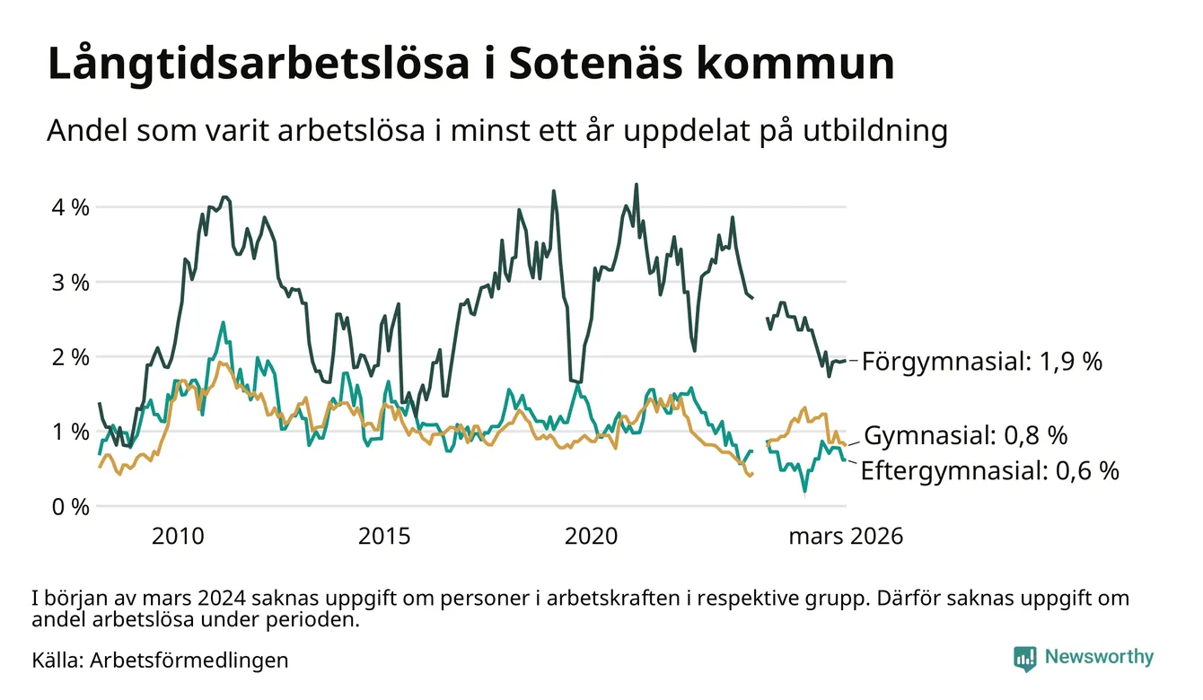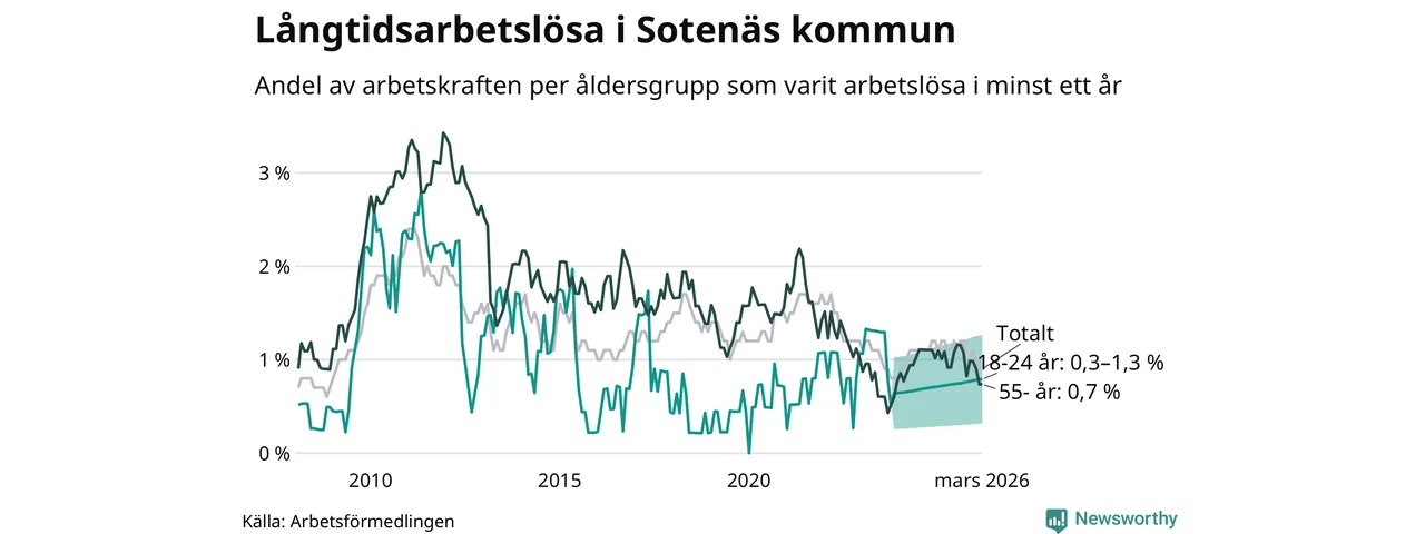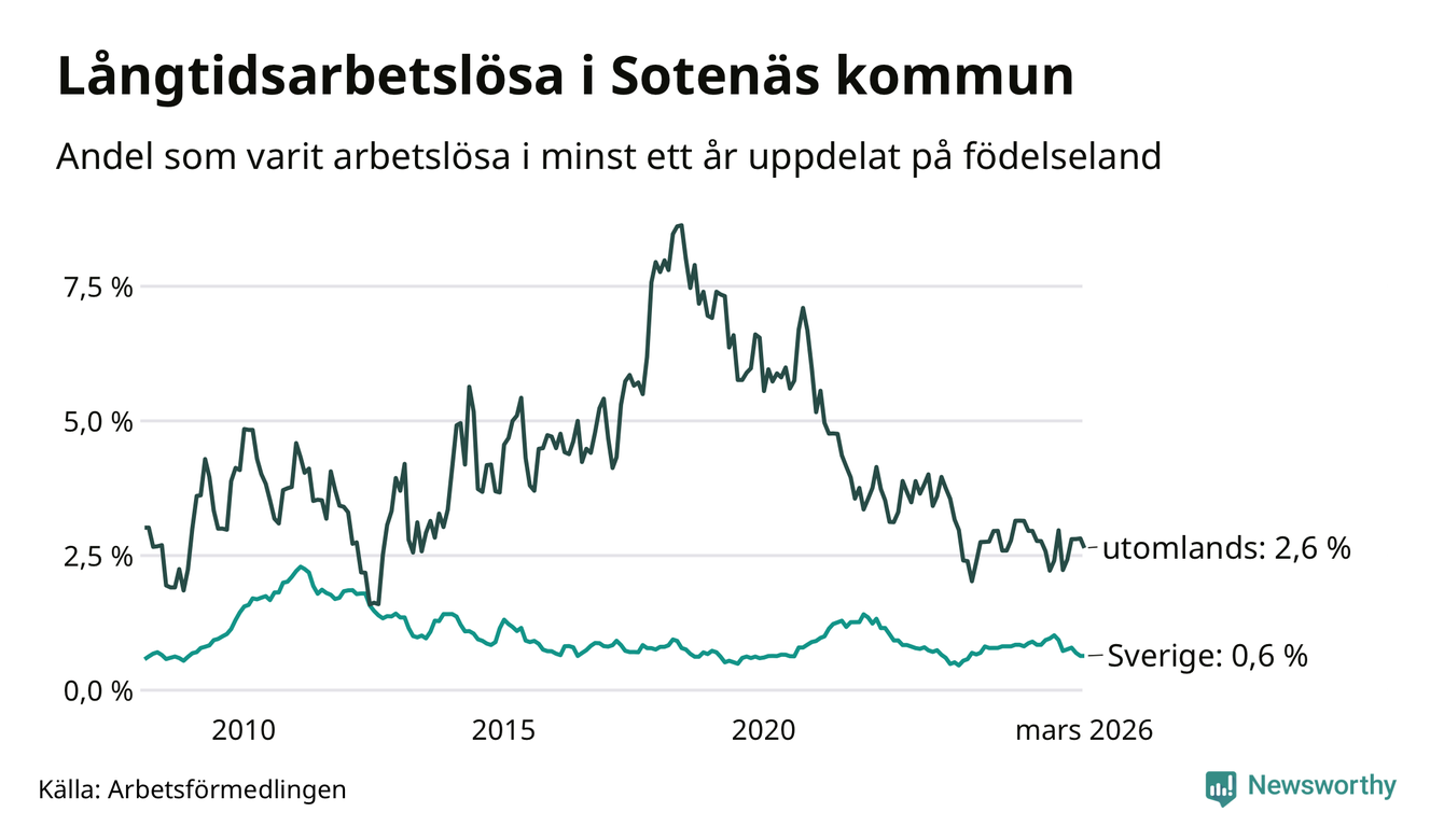 I mars hade 36 Sotenäsbor varit arbetslösa i minst ett år, vilket är en färre än månaden innan. 36 personer motsvarar 0,9 procent av arbetskraften i kommunen – andelen långtidsarbetslösa är 0,3 procentenheter lägre än samma månad för ett år sedan. Sotenäs tillhör de kommuner som har lägst andel långtidsarbetslösa i hela landet just nu.