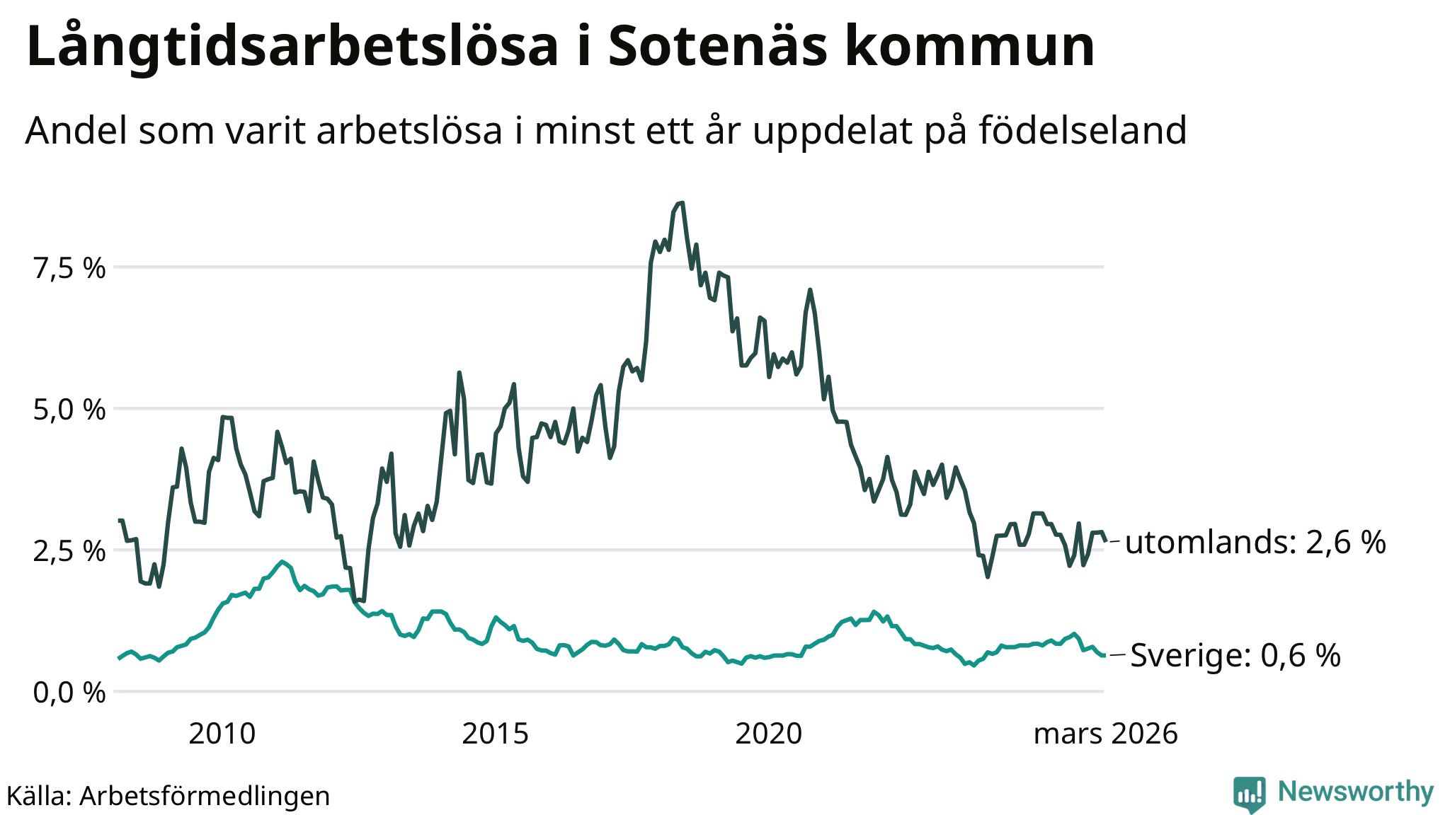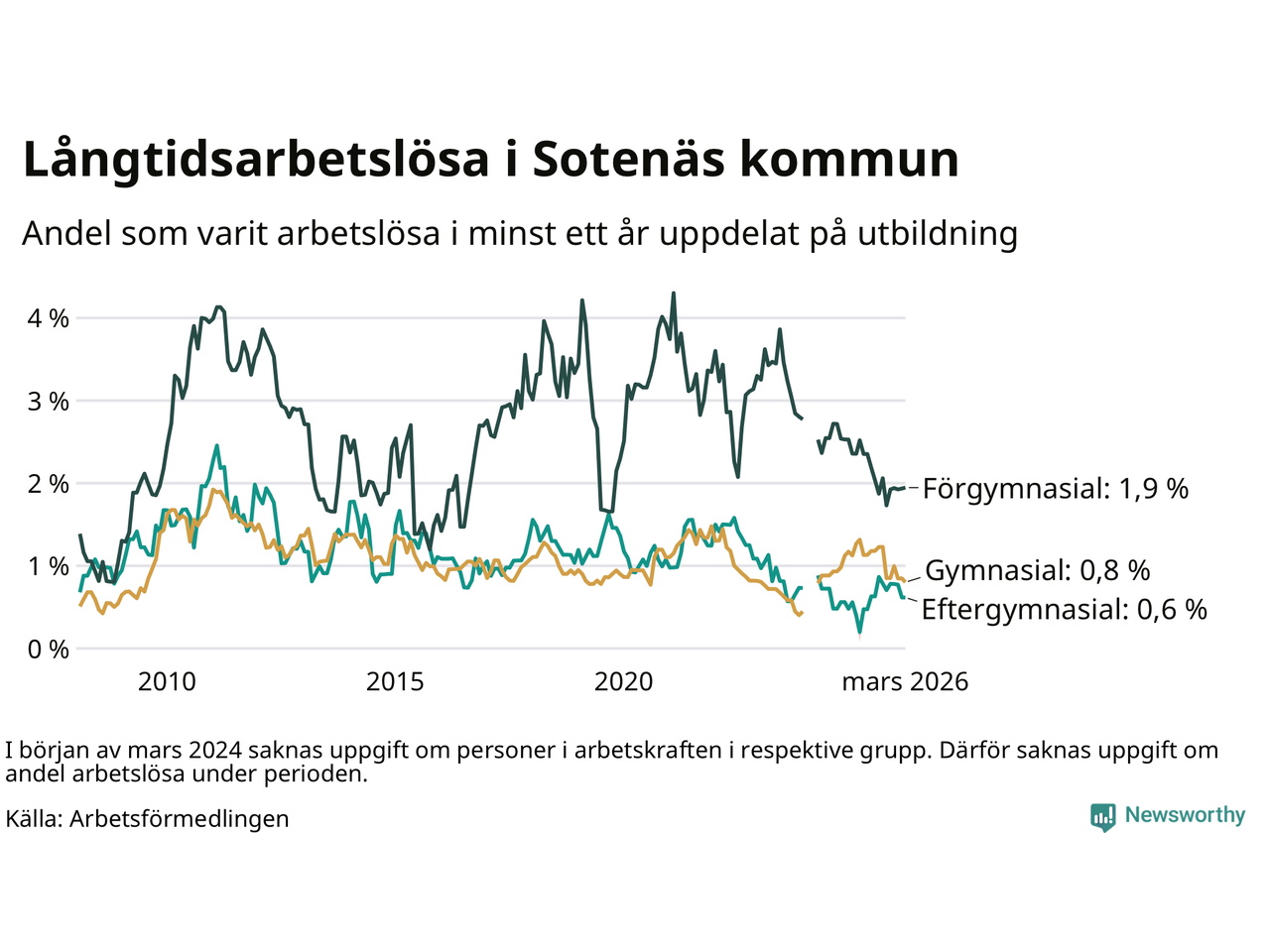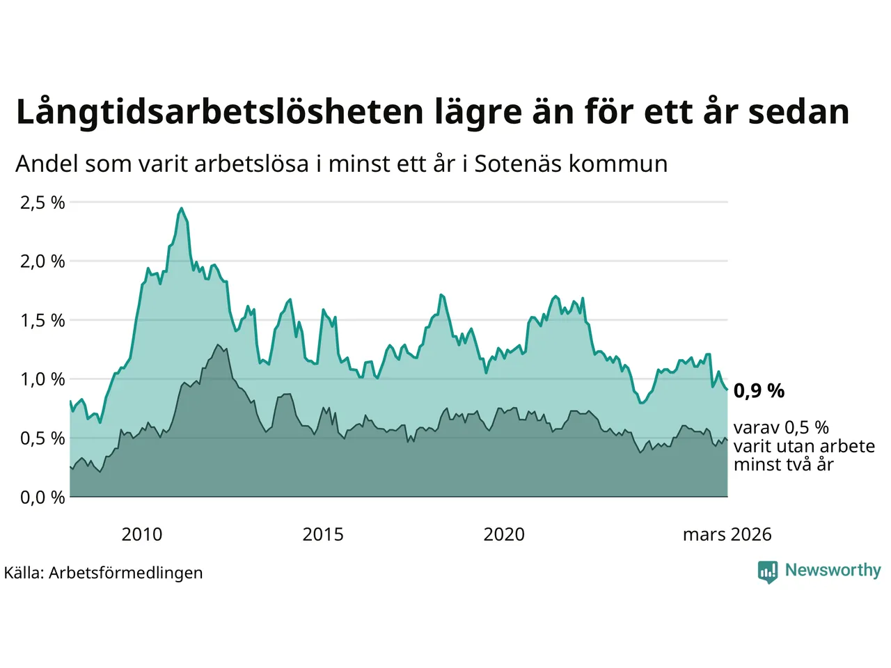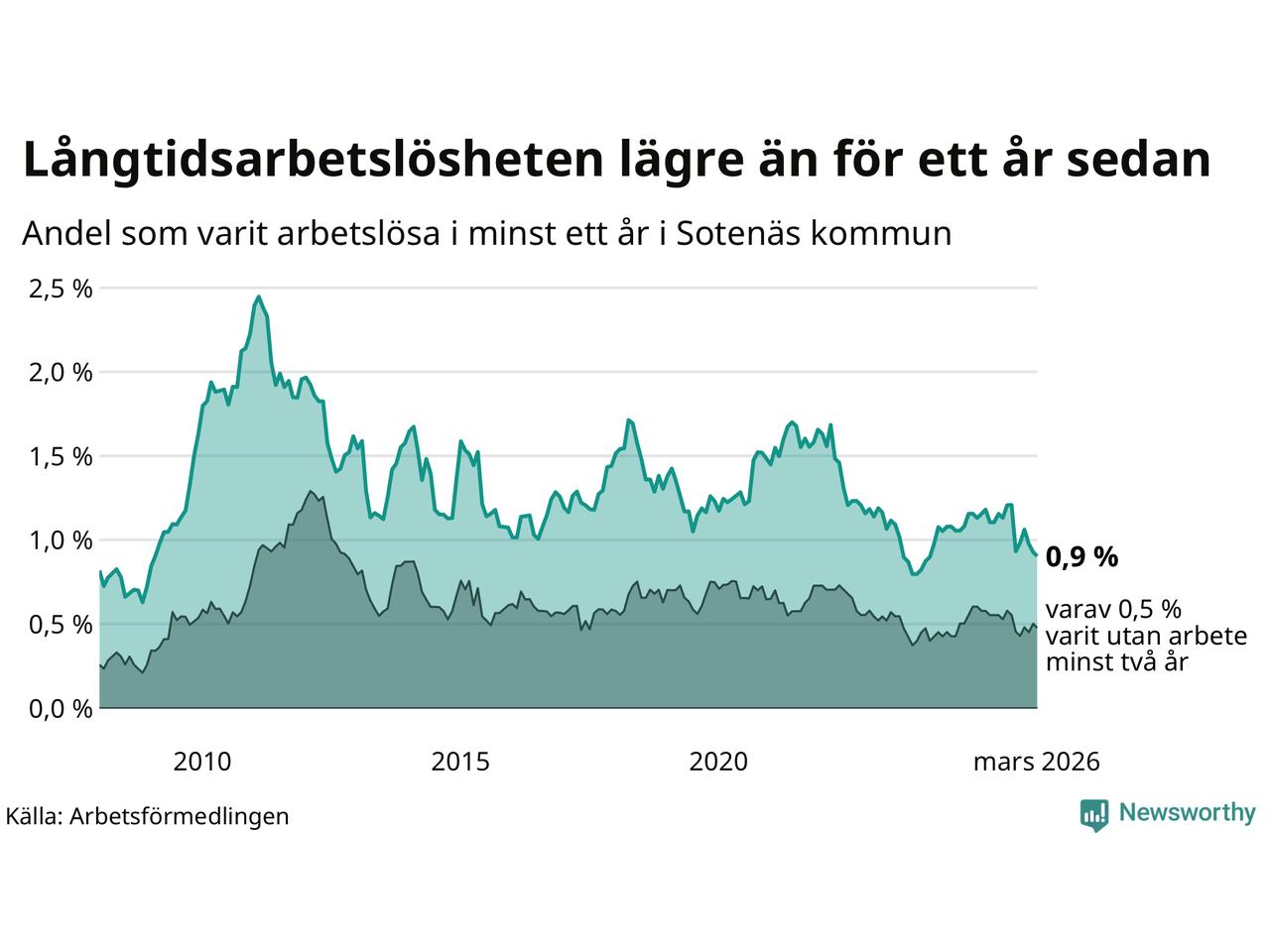 | Andel arbetslösa i minst två år | 0,5 % | 1,3 % | 1,6 % |