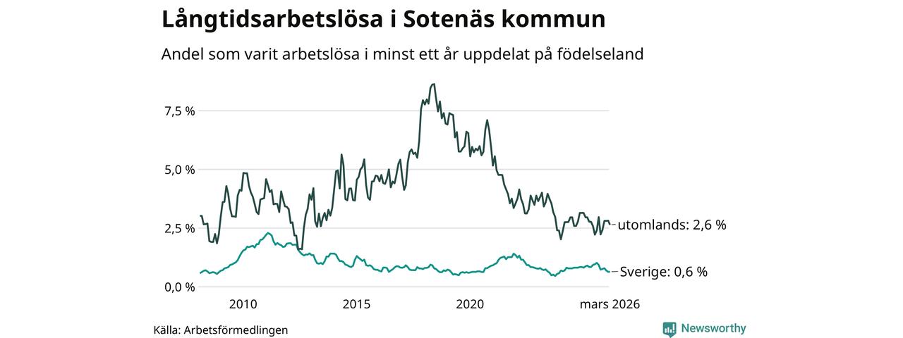 22 av de långtidsarbetslösa i Sotenäs är födda i Sverige, medan 14 är födda utomlands. Det innebär att långtidsarbetslösheten bland Sverigefödda är 0,6 procent, medan den är fyra gånger så hög – 2,6 procent – bland födda utomlands. Även i riket som helhet är arbetslösheten högre bland utrikesfödda.