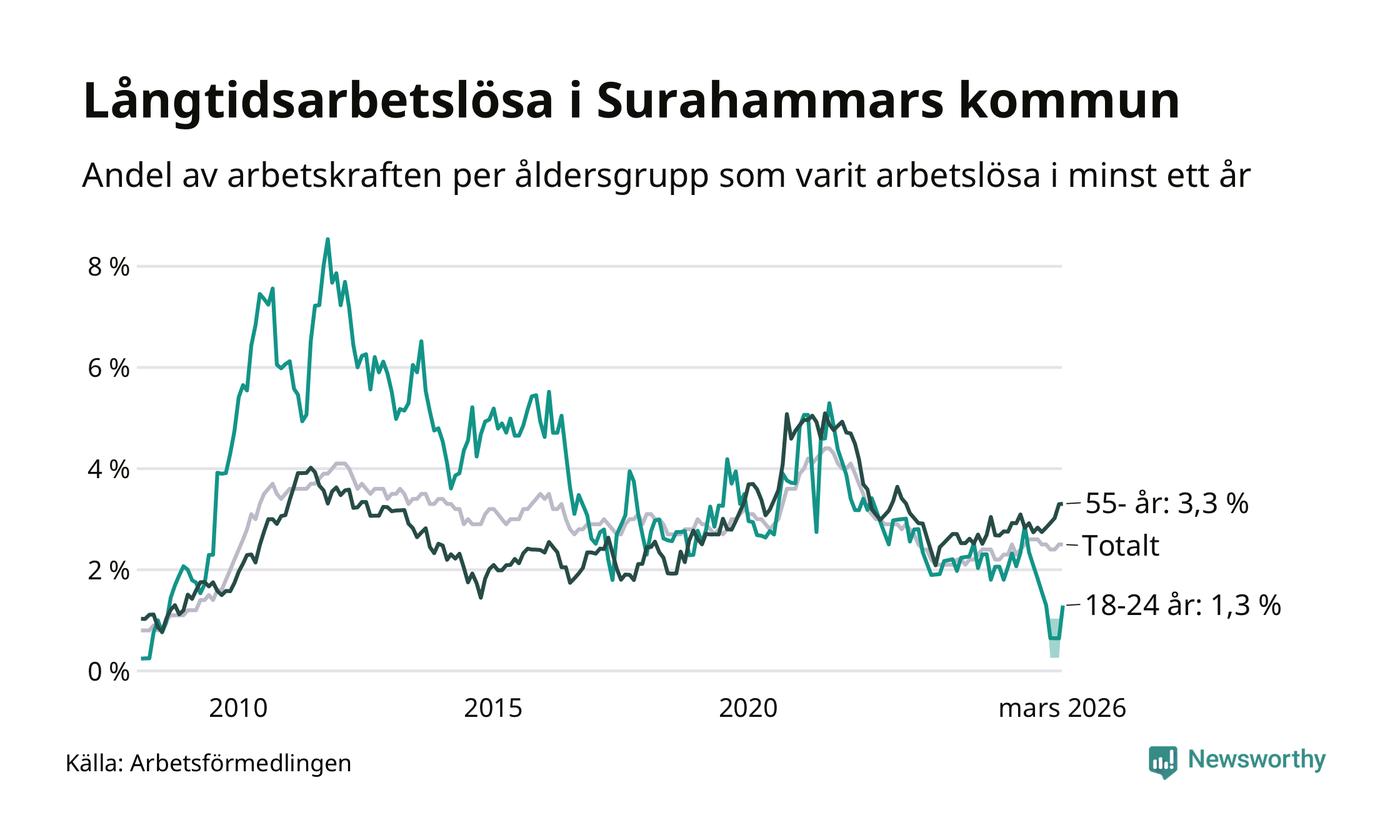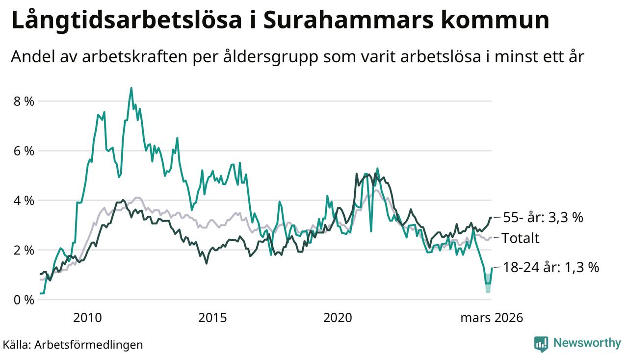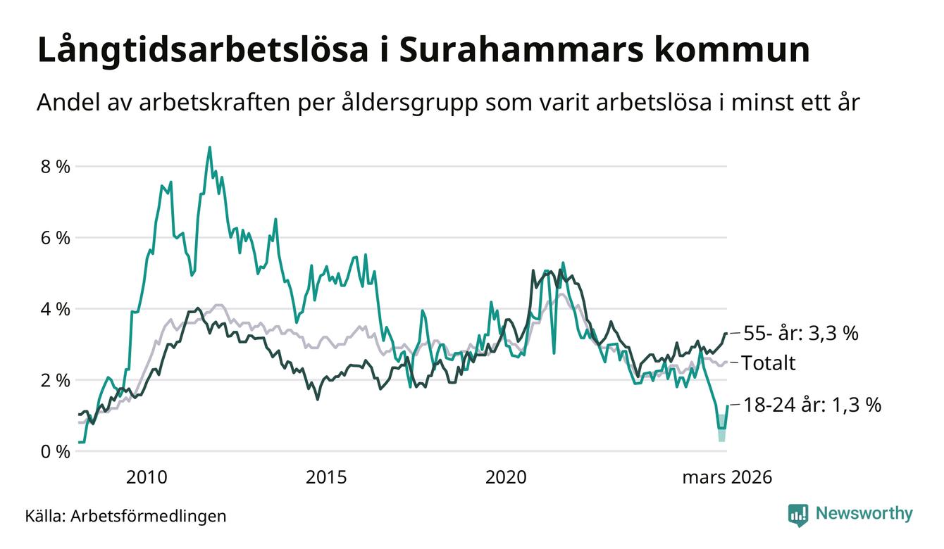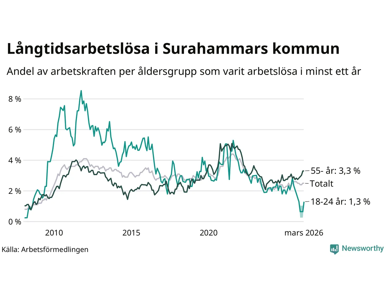 Av de 116 personerna som varit arbetslösa i mer än ett år i Surahammars kommun är 37 personer mellan 55 och 661 år och fem är mellan 18 och 24 år. För den äldre gruppen är andelen arbetslösa 3,3 procent medan den i den yngre gruppen är 1,3 procent. Även i riket som helhet är långtidsarbetslösheten högre i gruppen äldre.