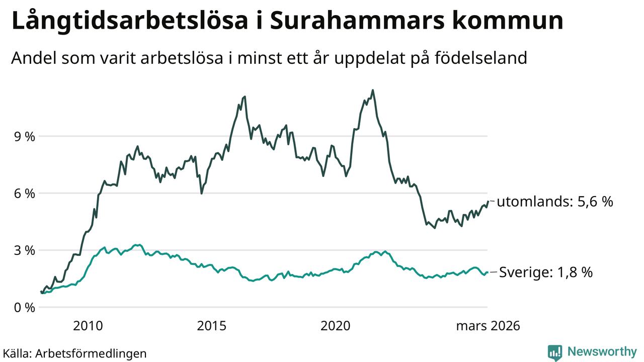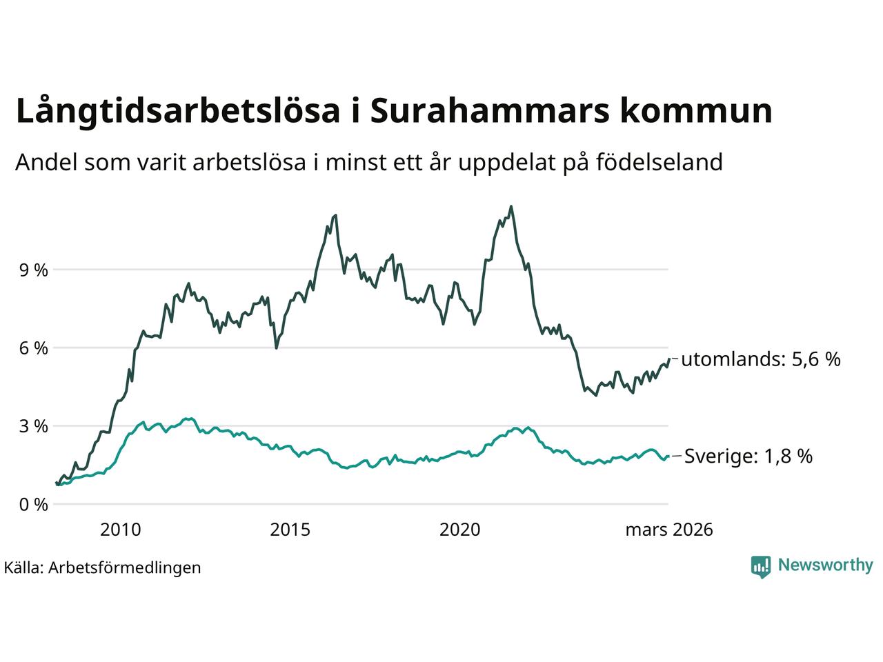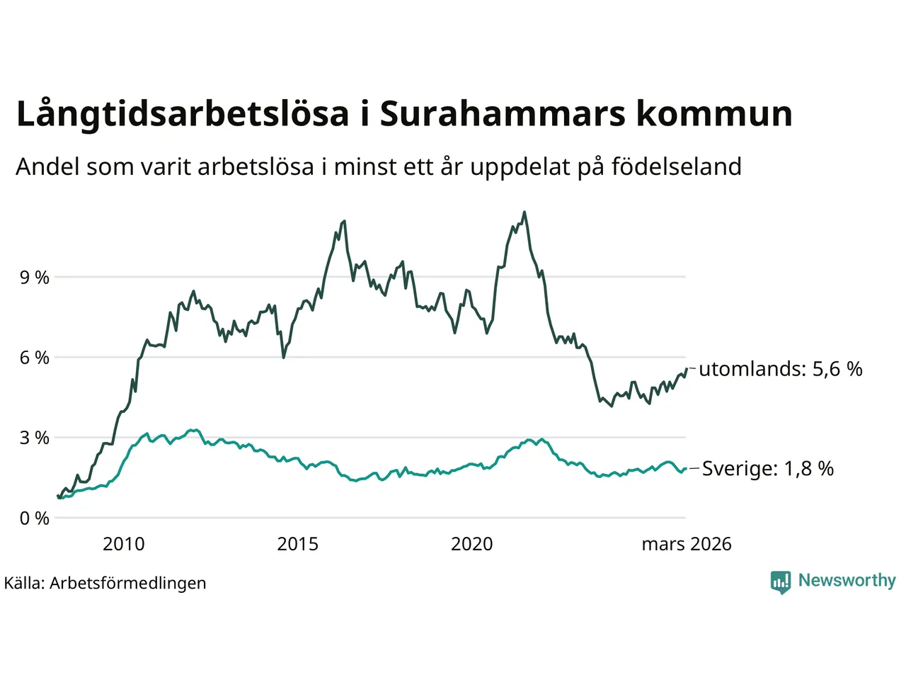 68 av de långtidsarbetslösa i Surahammar är födda i Sverige, medan 48 är födda utomlands. Det innebär att långtidsarbetslösheten bland Sverigefödda är 1,8 procent, medan den är tre gånger så hög – 5,6 procent – bland födda utomlands. Även i riket som helhet är arbetslösheten högre bland utrikesfödda.