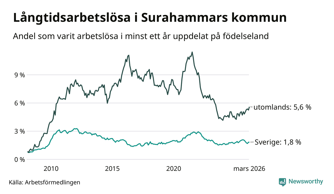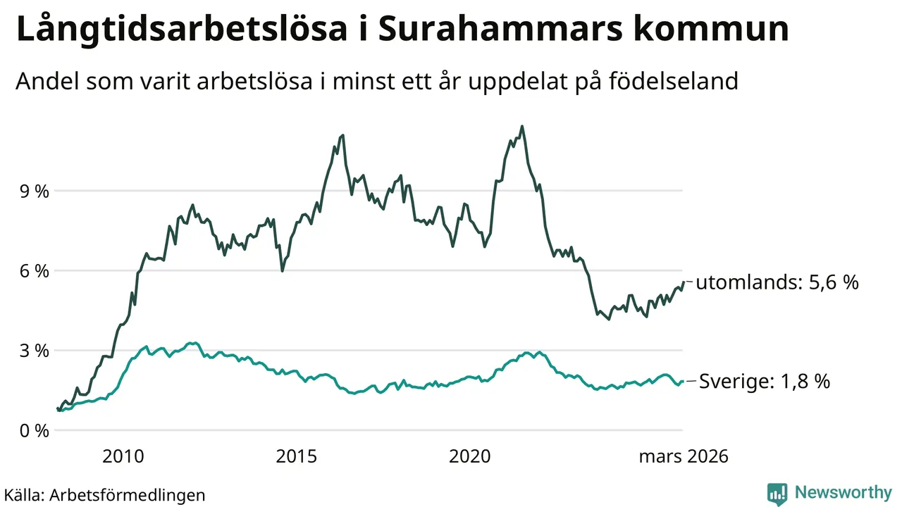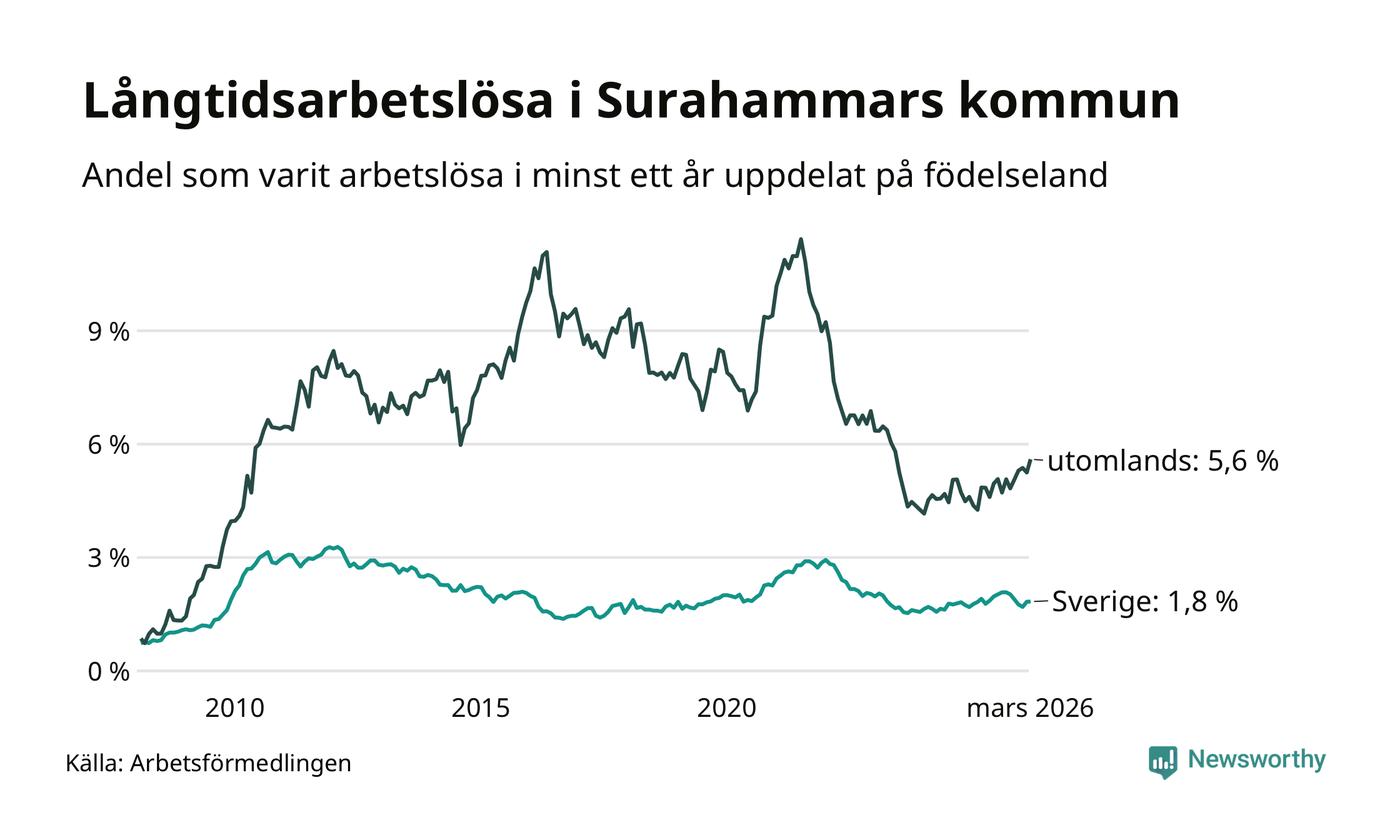 68 av de långtidsarbetslösa i Surahammar är födda i Sverige, medan 48 är födda utomlands. Det innebär att långtidsarbetslösheten bland Sverigefödda är 1,8 procent, medan den är tre gånger så hög – 5,6 procent – bland födda utomlands. Även i riket som helhet är arbetslösheten högre bland utrikesfödda.