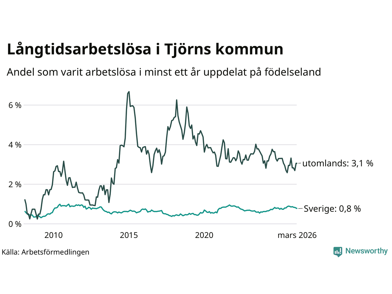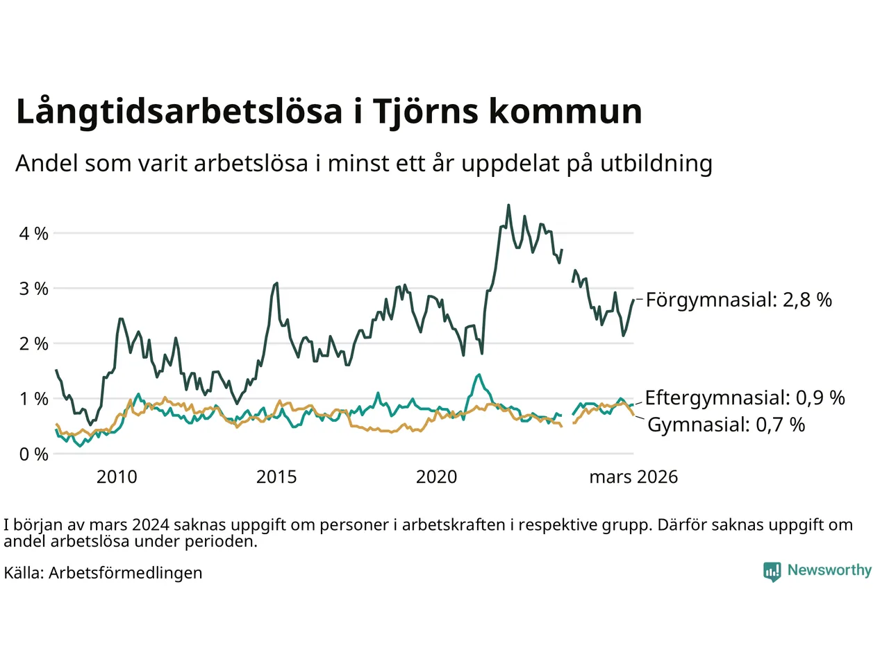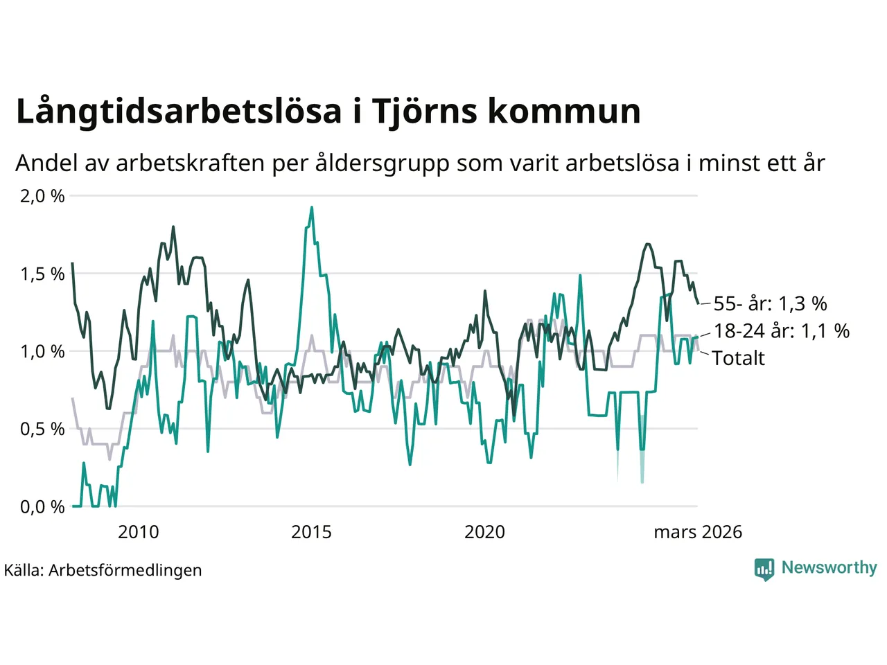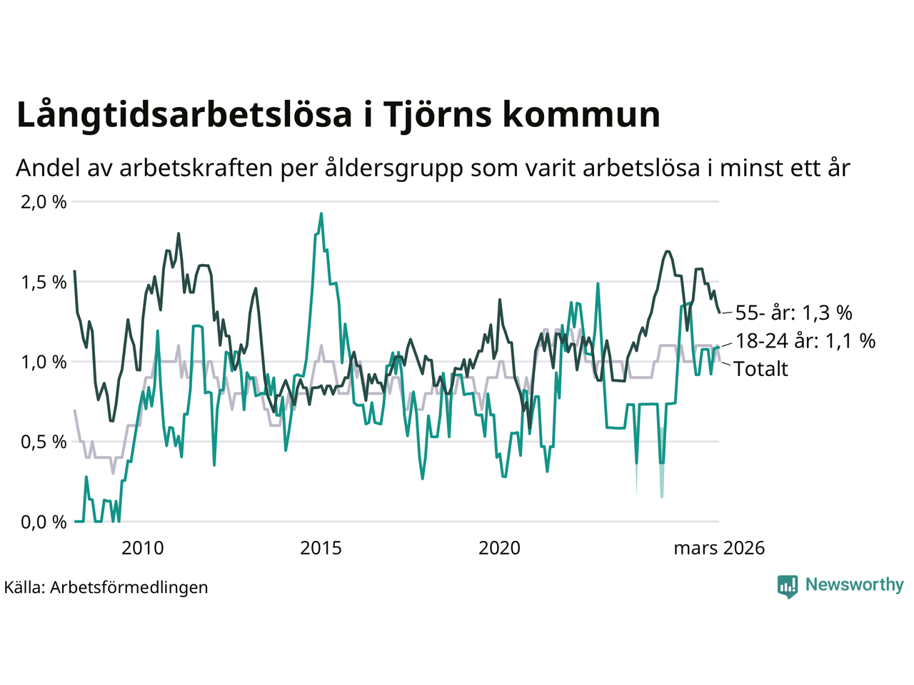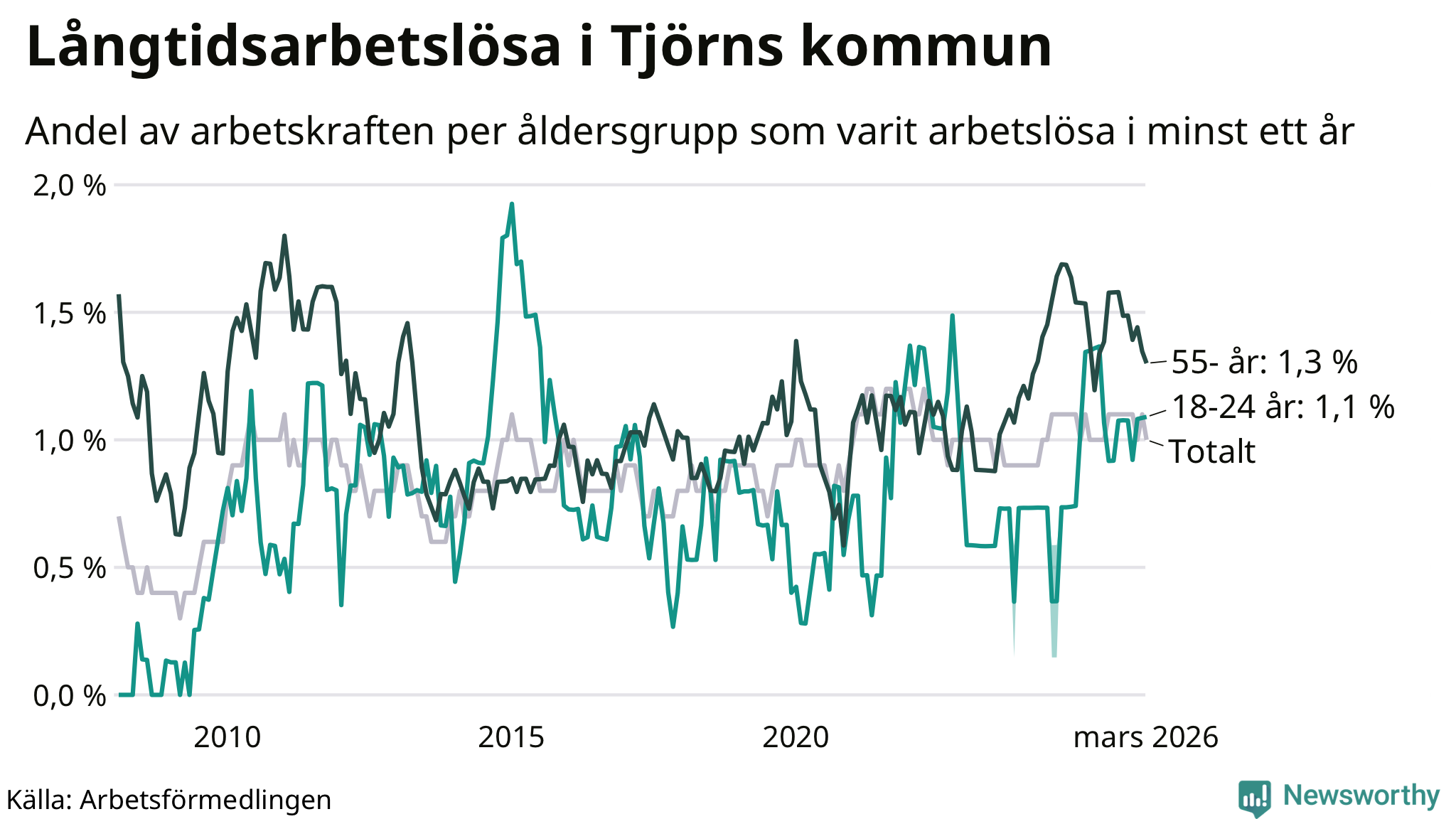 | Andel arbetslösa i minst två år | 0,4 % | 1,3 % | 1,6 % |