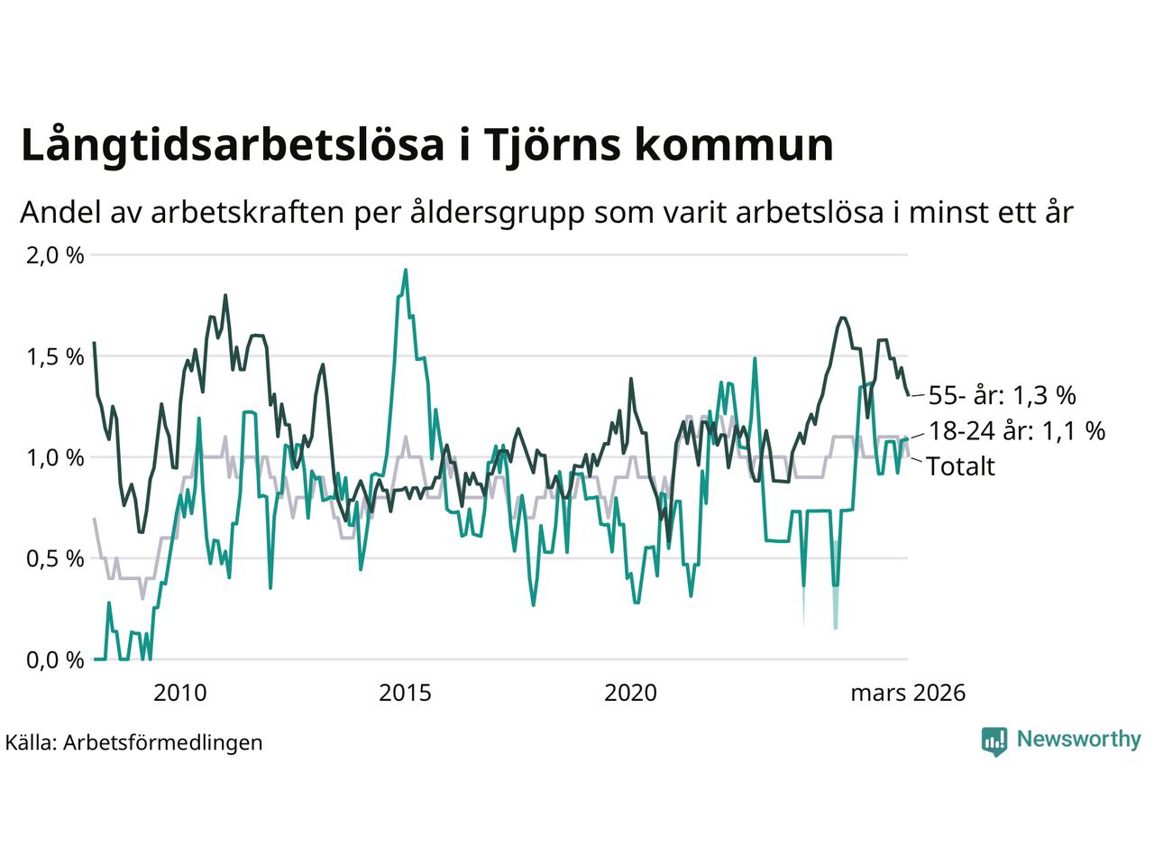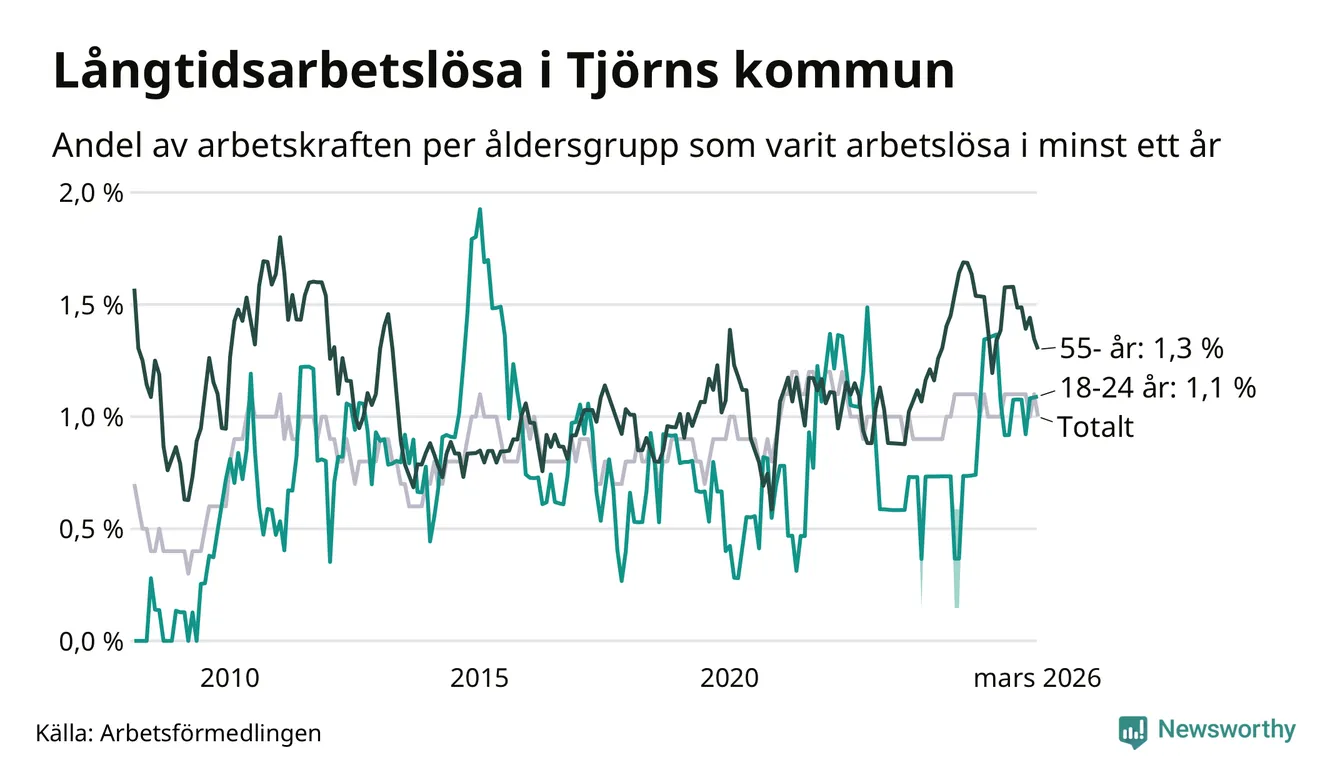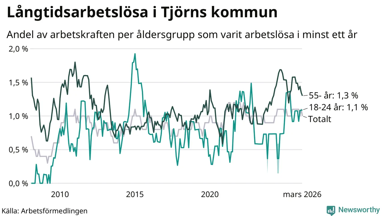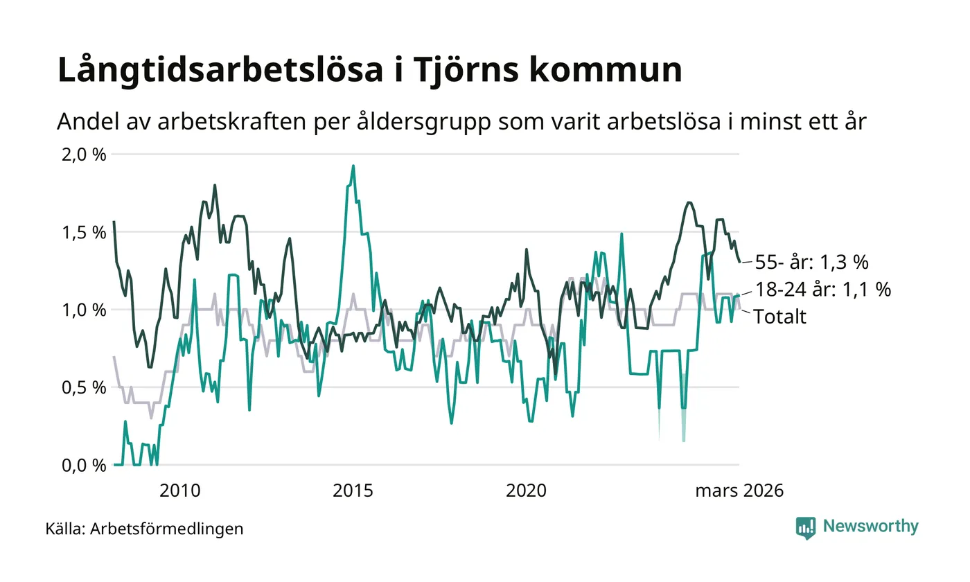 Av de 75 personerna som varit arbetslösa i mer än ett år i Tjörns kommun är 27 personer mellan 55 och 661 år och sju är mellan 18 och 24 år. För den äldre gruppen är andelen arbetslösa 1,3 procent medan den i den yngre gruppen är 1,1 procent. Även i riket som helhet är långtidsarbetslösheten högre i gruppen äldre.