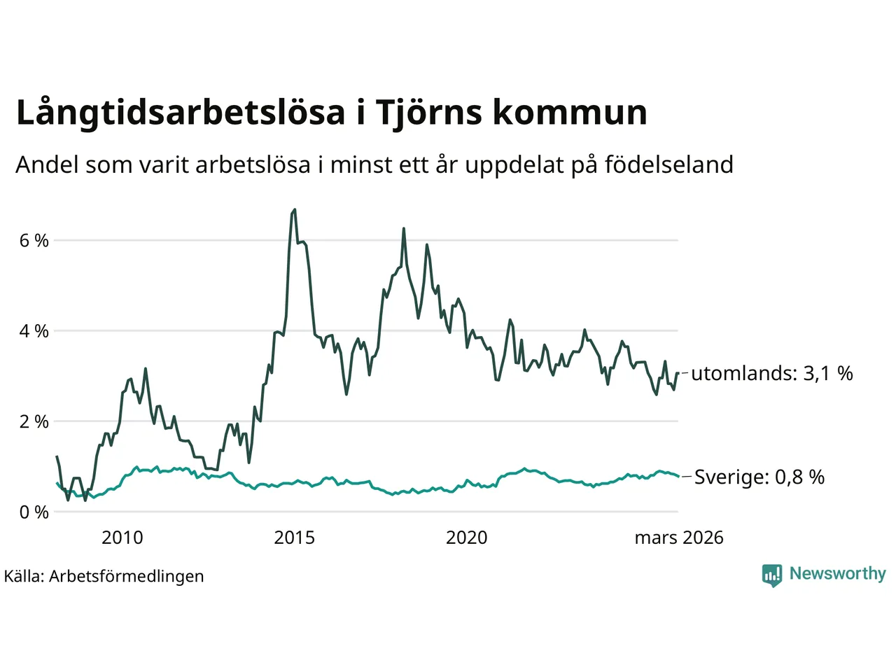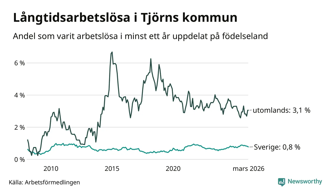50 av de långtidsarbetslösa på Tjörn är födda i Sverige, medan 25 är födda utomlands. Det innebär att långtidsarbetslösheten bland Sverigefödda är 0,8 procent, medan den är fyra gånger så hög – 3,1 procent – bland födda utomlands. Även i riket som helhet är arbetslösheten högre bland utrikesfödda.