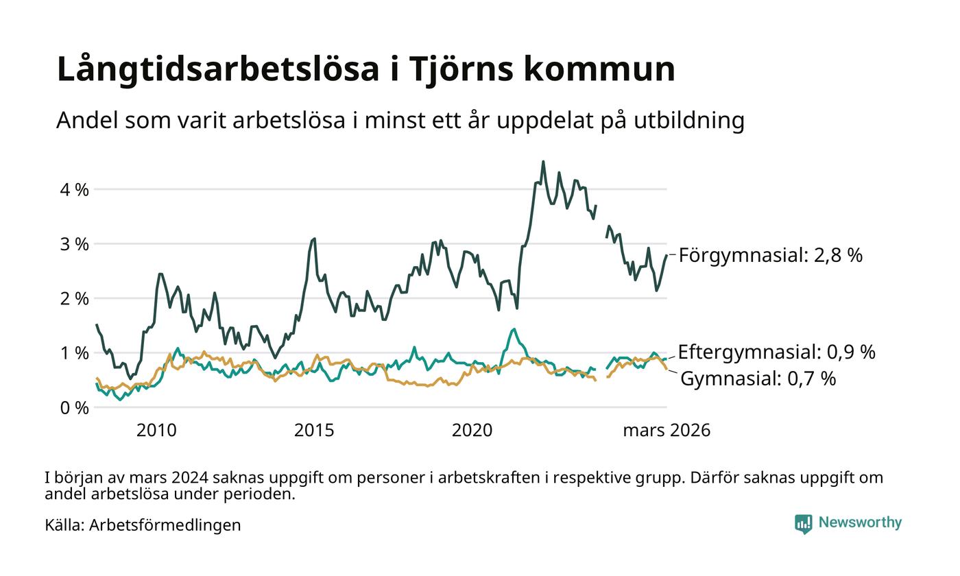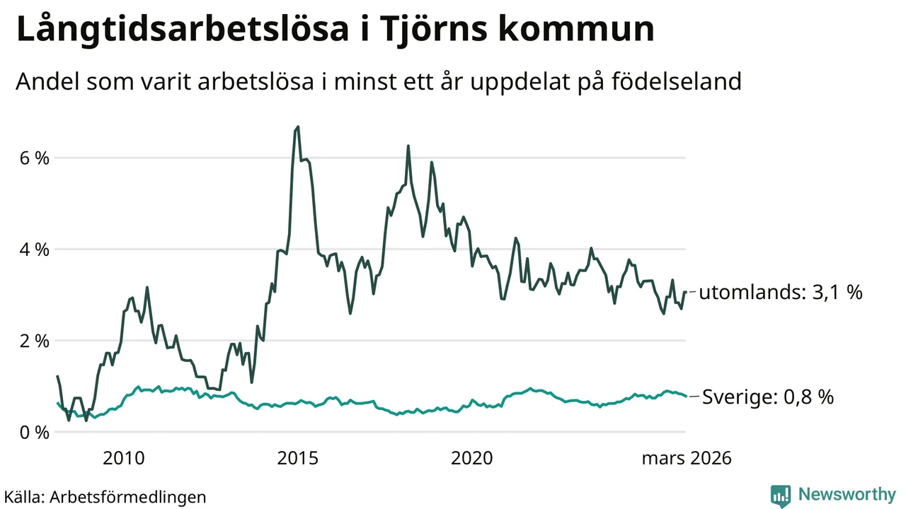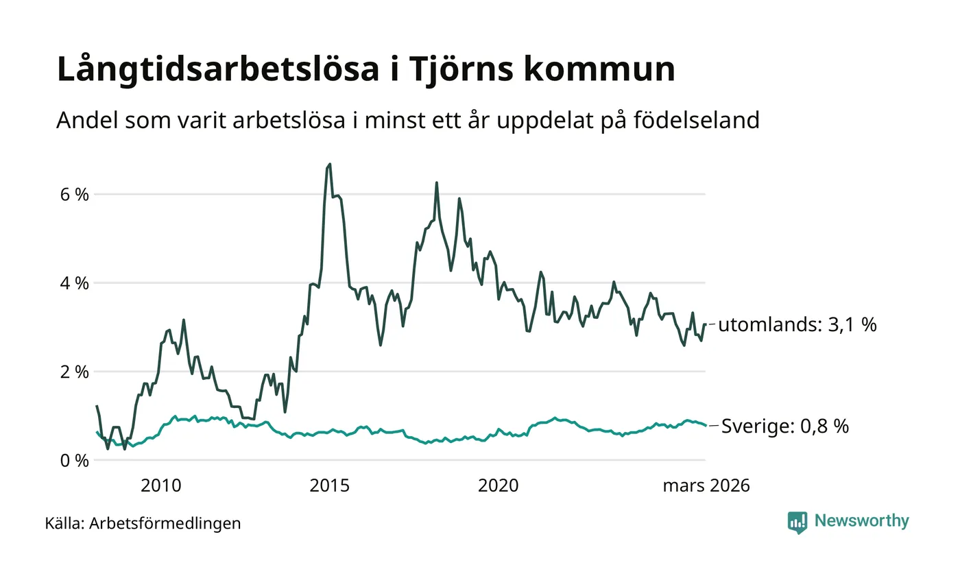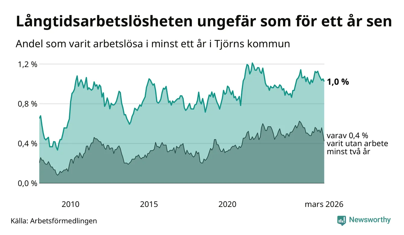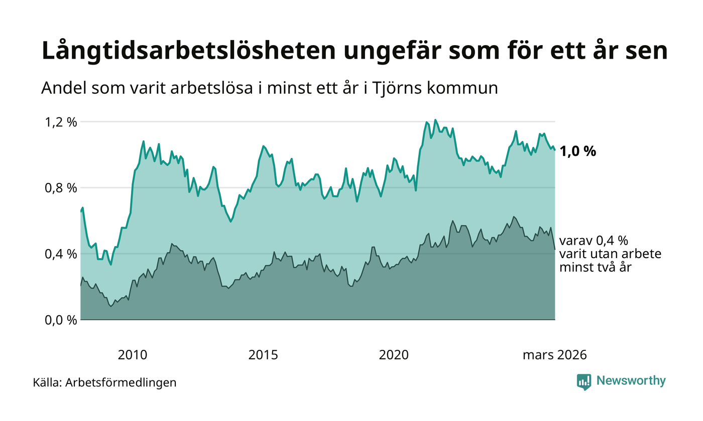 I mars hade 75 Tjörnbor varit arbetslösa i minst ett år, vilket är två färre än månaden innan. 75 personer motsvarar 1,0 procent av arbetskraften i kommunen – andelen långtidsarbetslösa är ungefär på samma nivå som för ett år sedan. Tjörn tillhör de kommuner som har lägst andel långtidsarbetslösa i hela landet just nu.