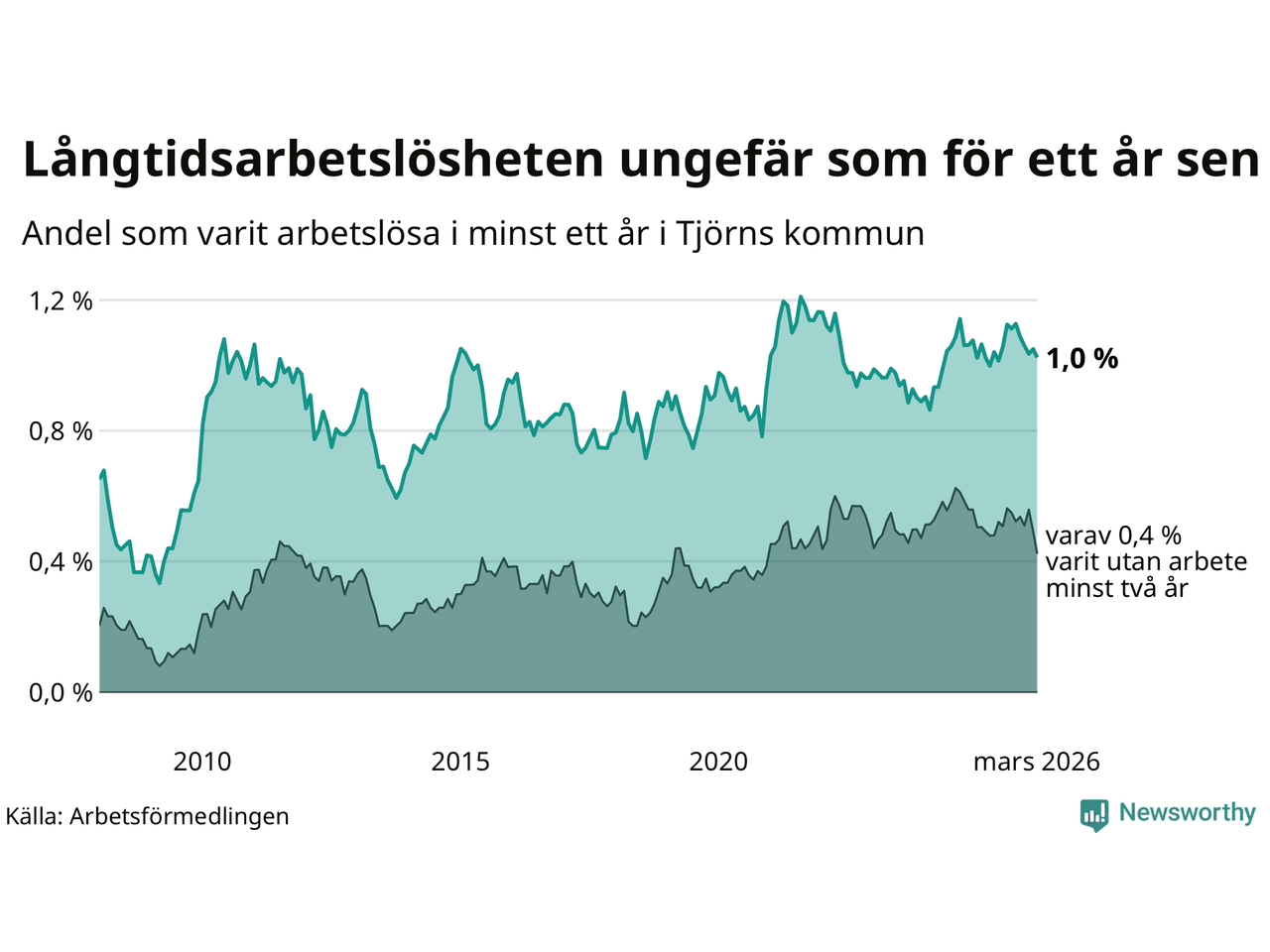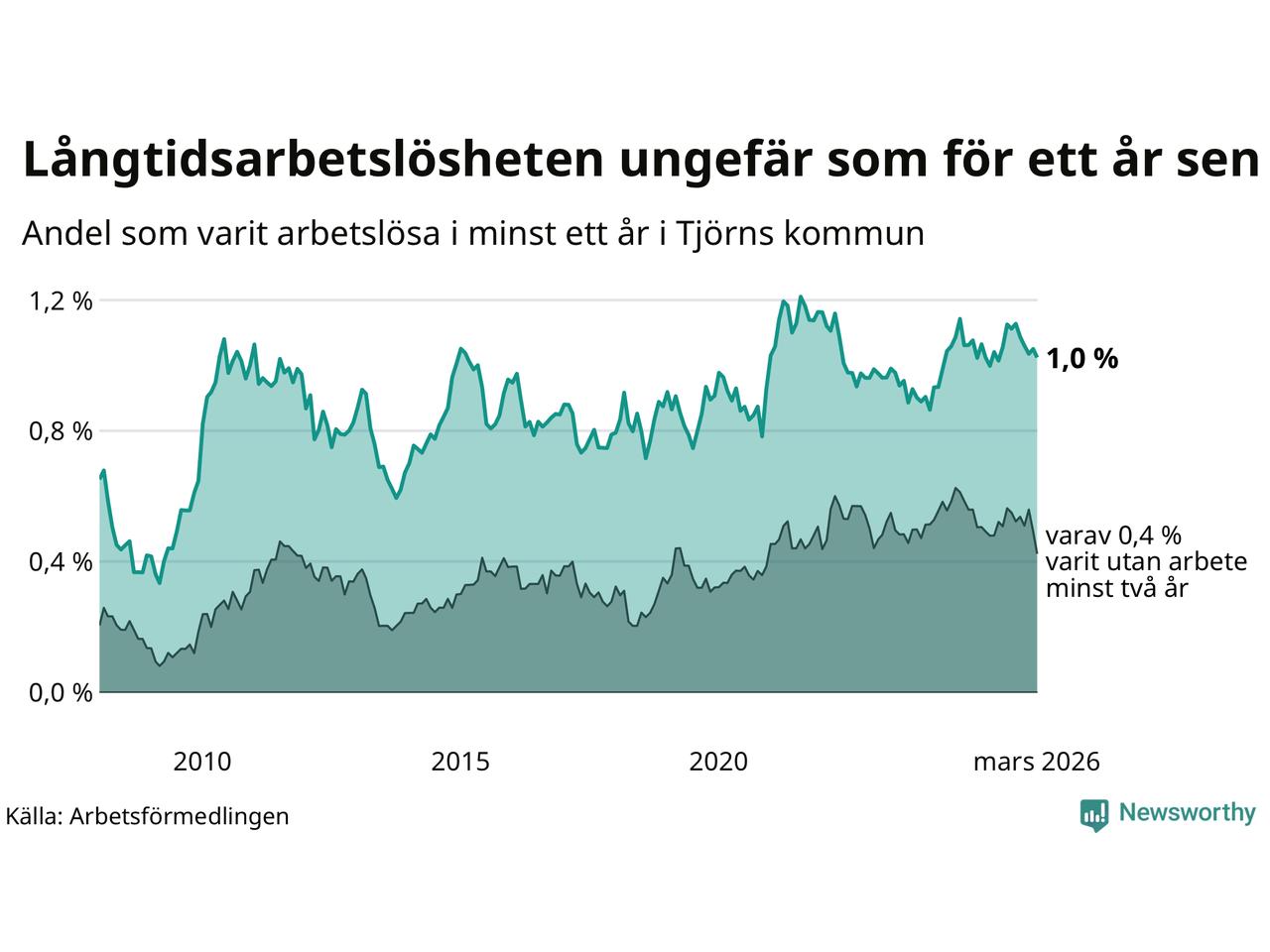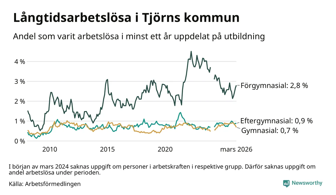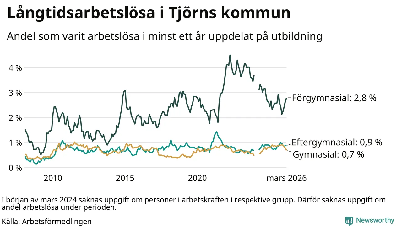 Andelen som varit utan arbete i minst ett år på Tjörn var ungefär lika stor i mars jämfört med samma månad för ett år sedan. Det visar Arbetsfömedlingens senaste månadsstatistik.