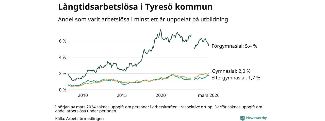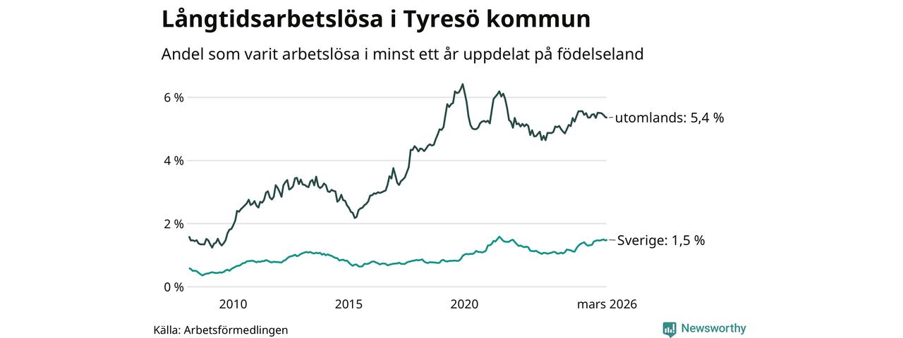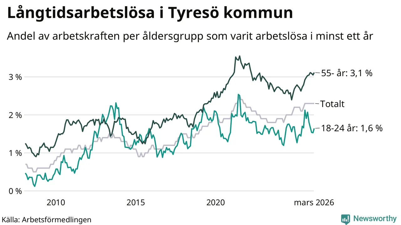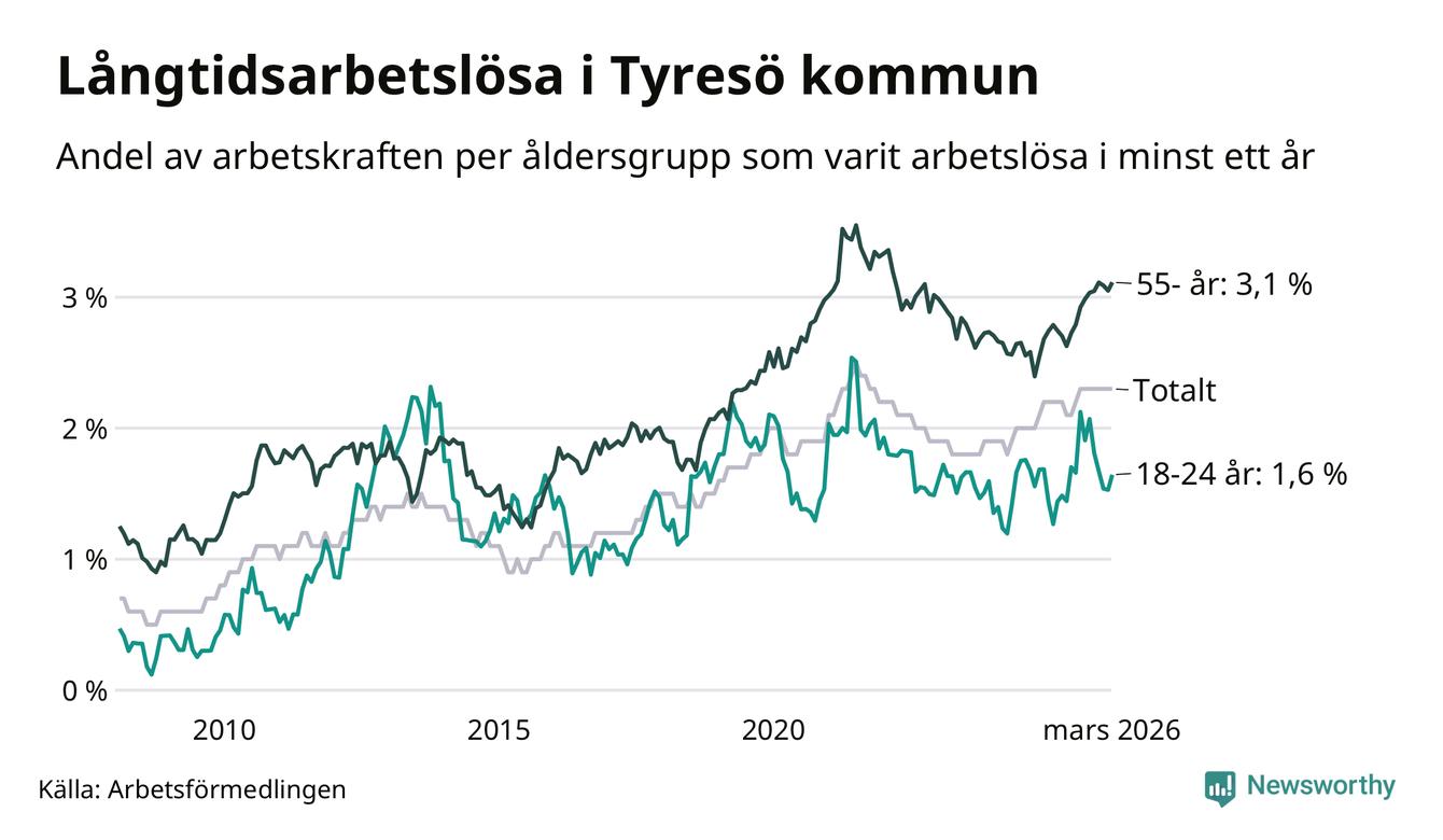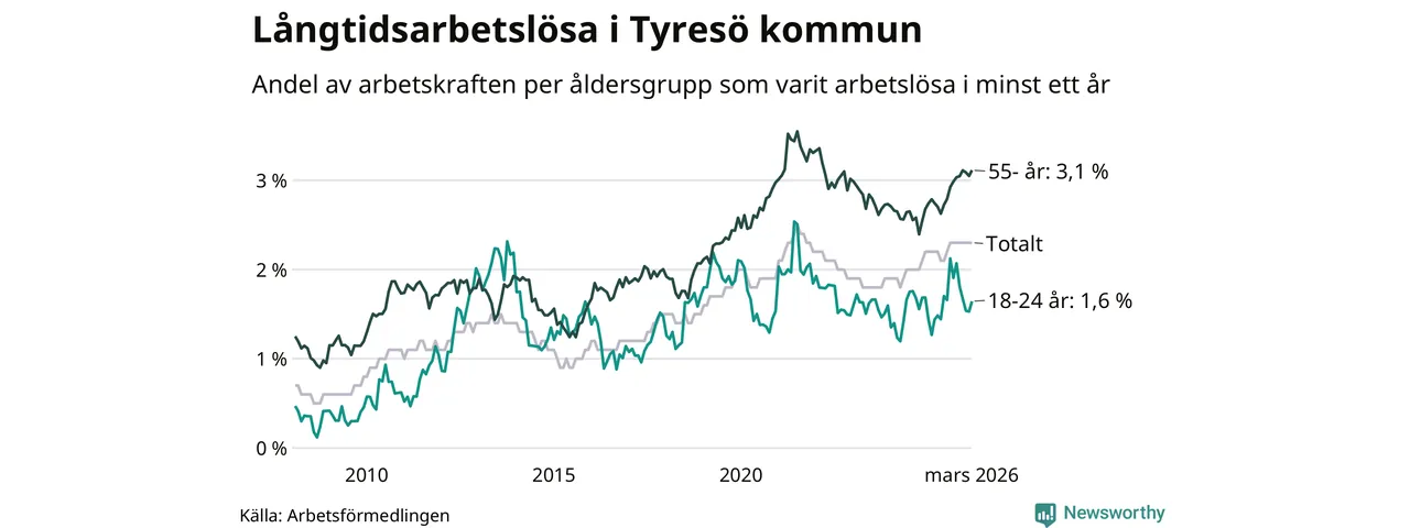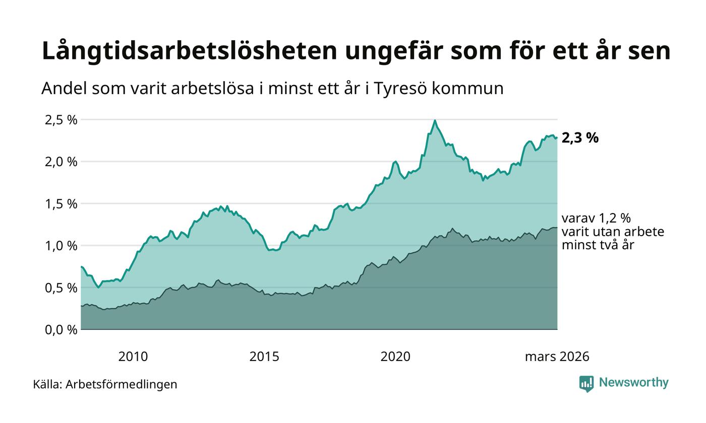 I mars hade 583 Tyresöbor varit arbetslösa i minst ett år, vilket är fem fler än månaden innan. 583 personer motsvarar 2,3 procent av arbetskraften i kommunen – andelen långtidsarbetslösa är ungefär på samma nivå som för ett år sedan.