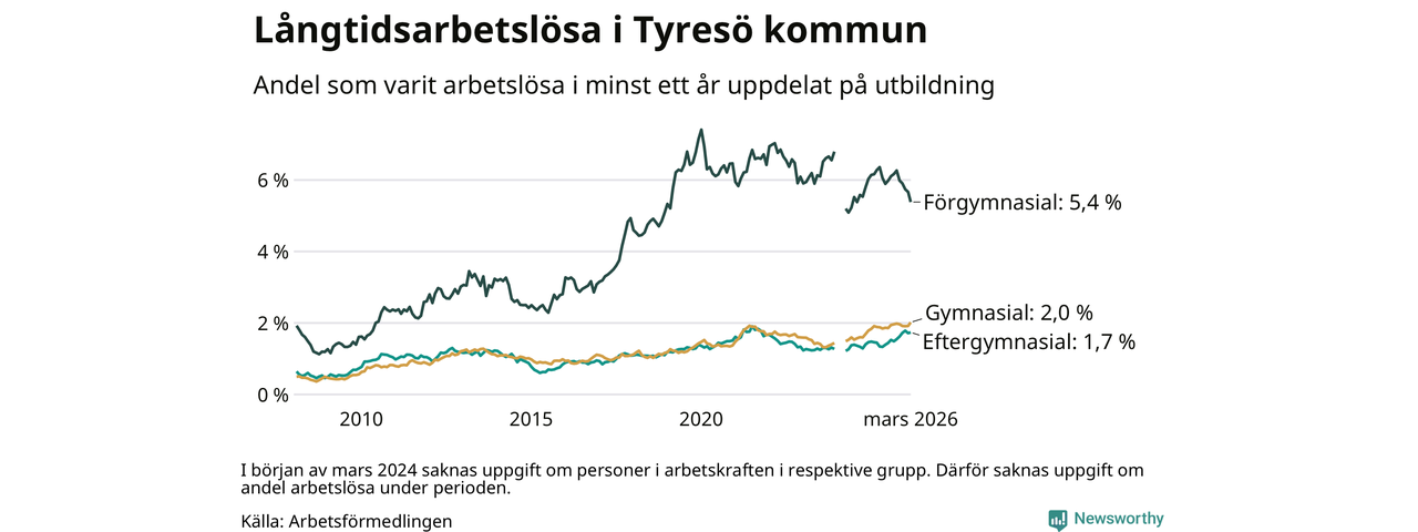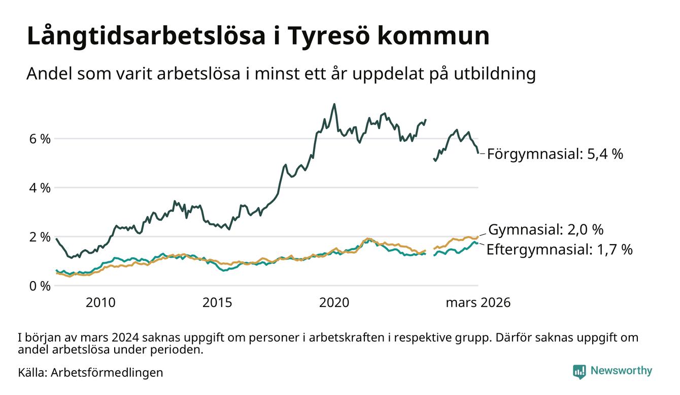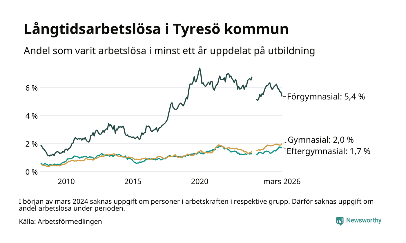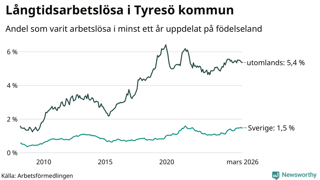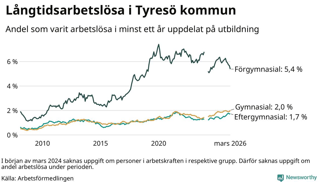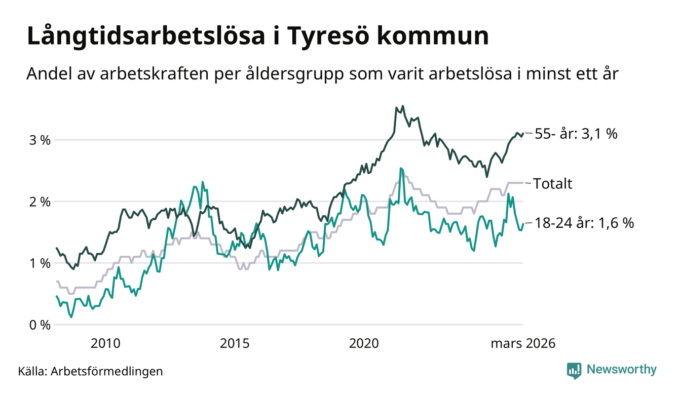 I mars hade 583 Tyresöbor varit arbetslösa i minst ett år, vilket är fem fler än månaden innan. 583 personer motsvarar 2,3 procent av arbetskraften i kommunen – andelen långtidsarbetslösa är ungefär på samma nivå som för ett år sedan.