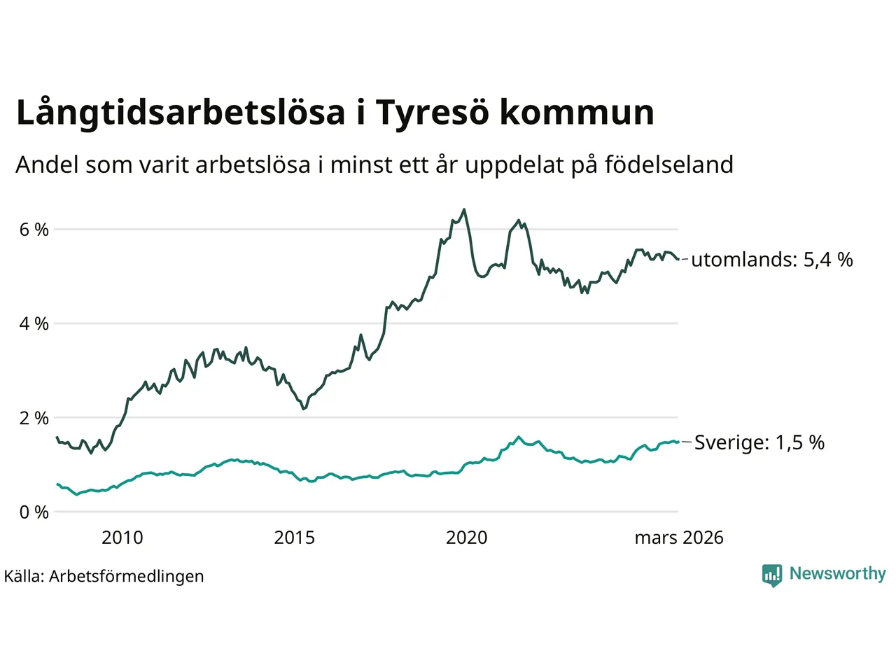 301 av de långtidsarbetslösa i Tyresö är födda i Sverige, medan 282 är födda utomlands. Det innebär att långtidsarbetslösheten bland Sverigefödda är 1,5 procent, medan den är fyra gånger så hög – 5,4 procent – bland födda utomlands. Även i riket som helhet är arbetslösheten högre bland utrikesfödda.