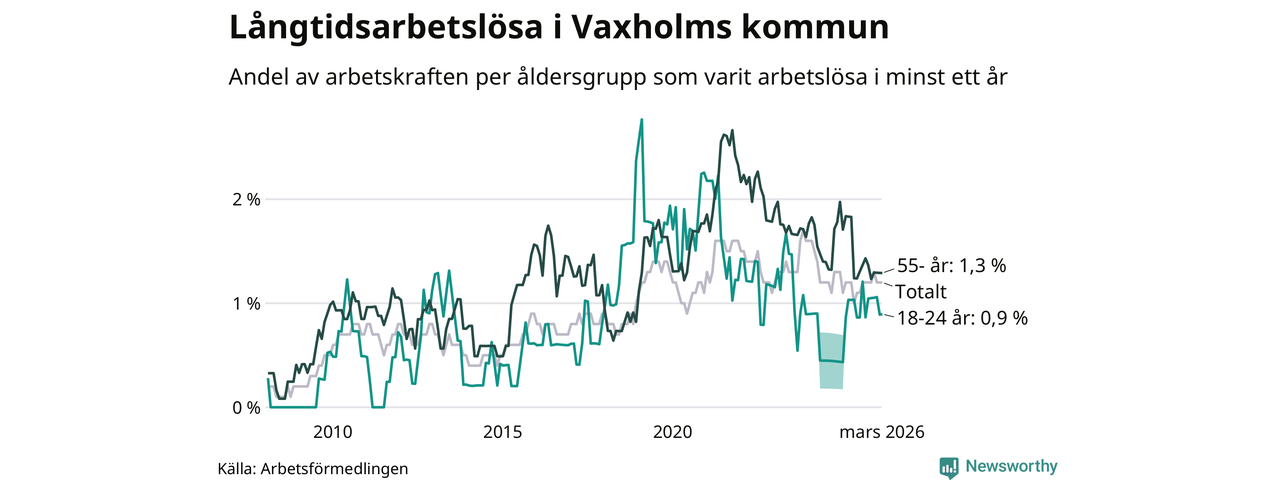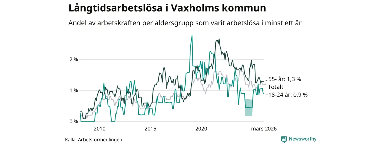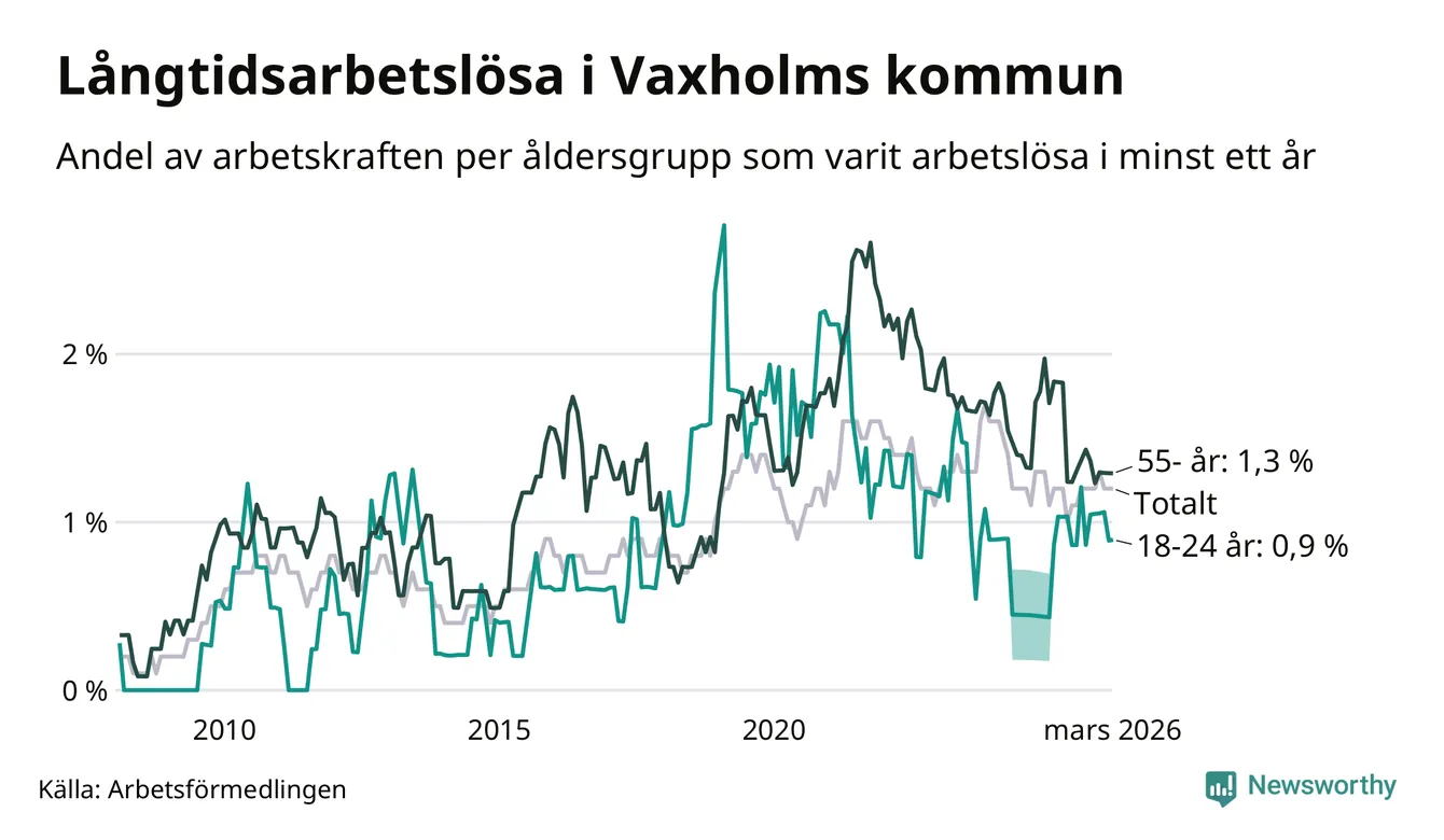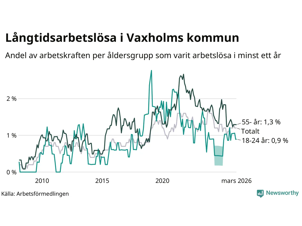 Av de 65 personerna som varit arbetslösa i mer än ett år i Vaxholms kommun är 20 personer mellan 55 och 661 år och fem är mellan 18 och 24 år. För den äldre gruppen är andelen arbetslösa 1,3 procent medan den i den yngre gruppen är 0,9 procent. Även i riket som helhet är långtidsarbetslösheten högre i gruppen äldre.