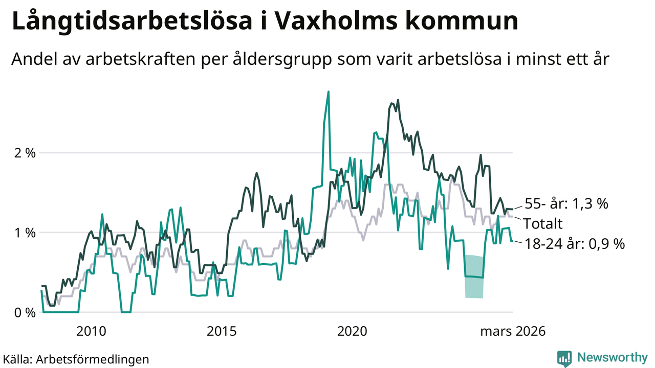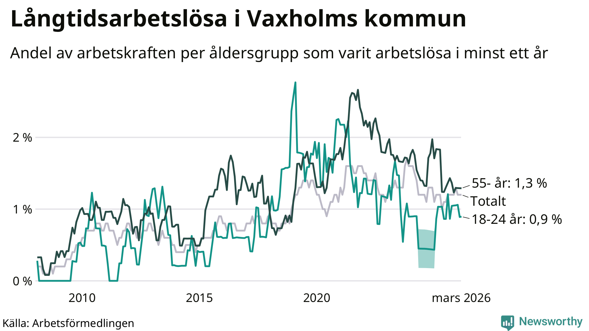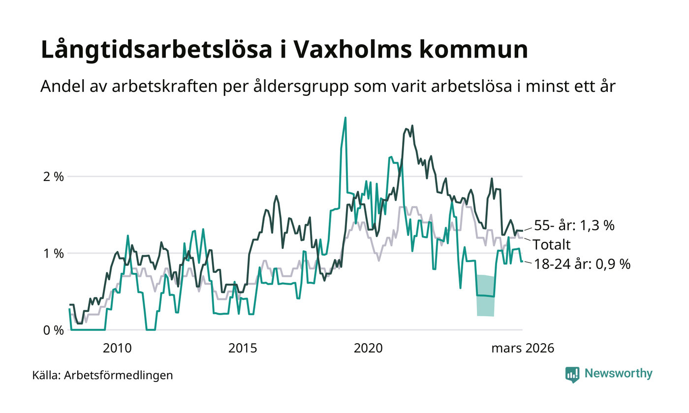Av de 65 personerna som varit arbetslösa i mer än ett år i Vaxholms kommun är 20 personer mellan 55 och 661 år och fem är mellan 18 och 24 år. För den äldre gruppen är andelen arbetslösa 1,3 procent medan den i den yngre gruppen är 0,9 procent. Även i riket som helhet är långtidsarbetslösheten högre i gruppen äldre.