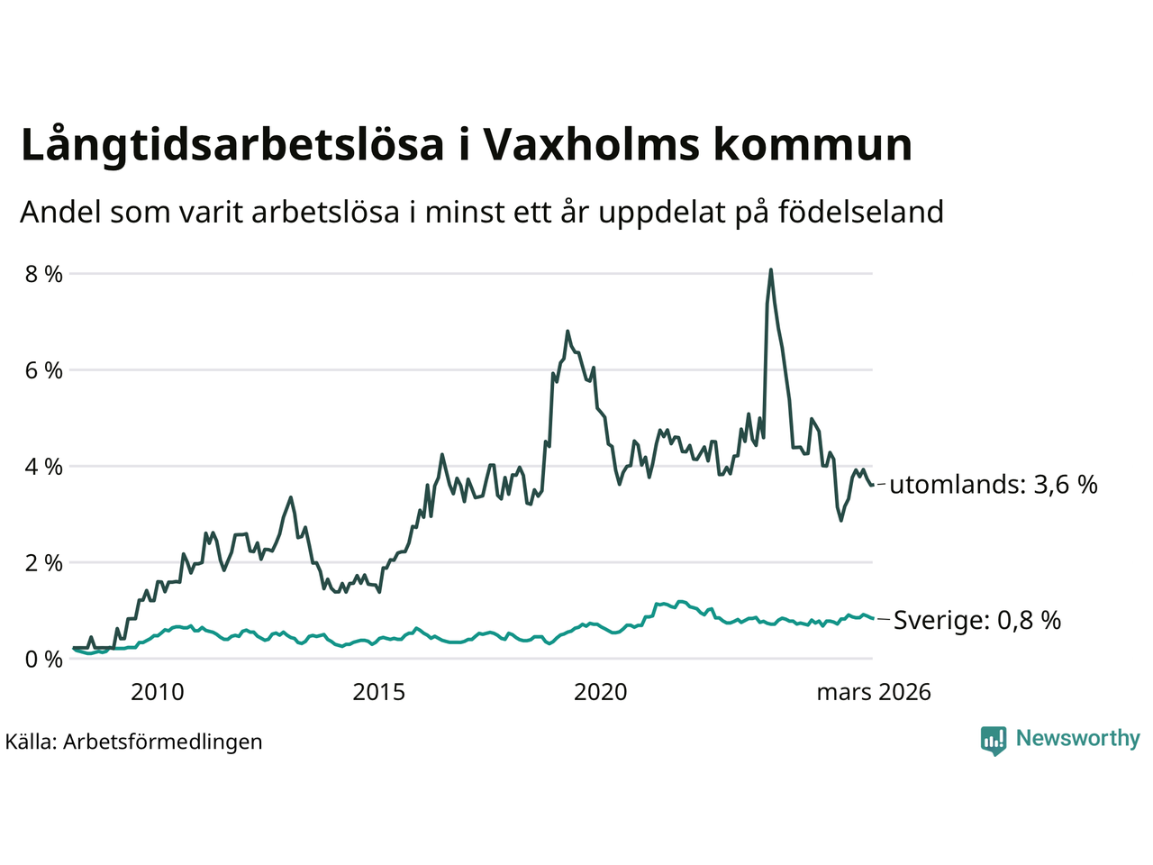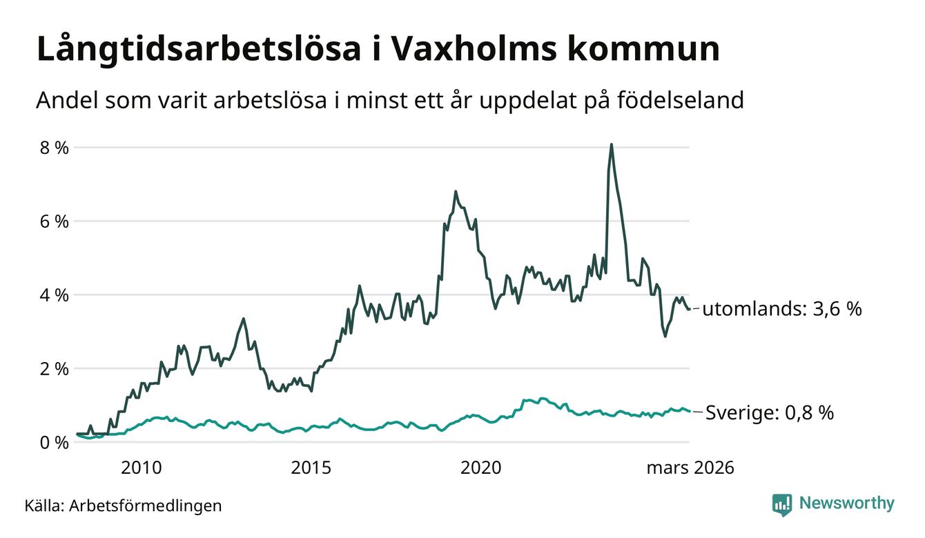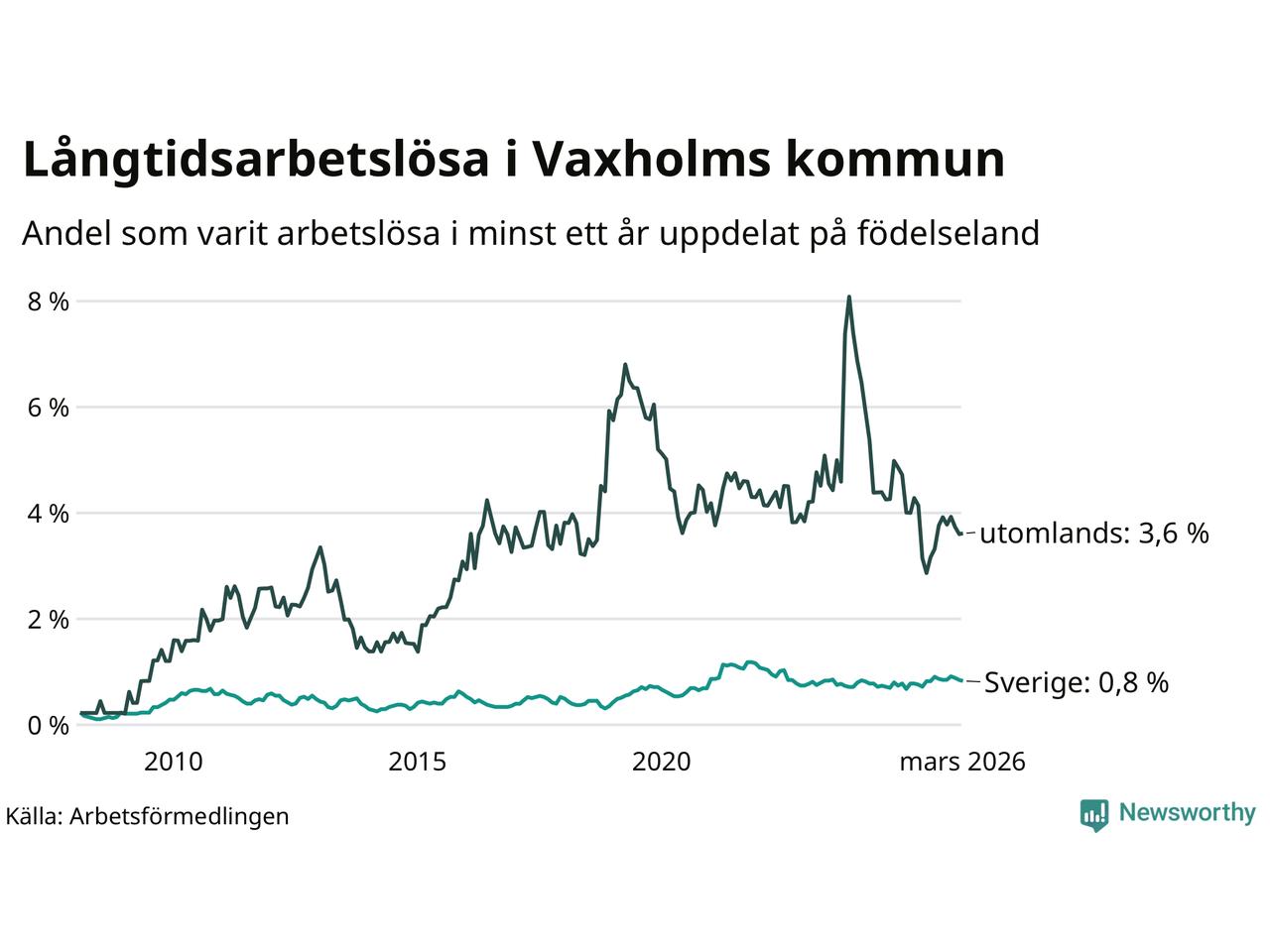 40 av de långtidsarbetslösa i Vaxholm är födda i Sverige, medan 25 är födda utomlands. Det innebär att långtidsarbetslösheten bland Sverigefödda är 0,8 procent, medan den är fyra gånger så hög – 3,6 procent – bland födda utomlands. Även i riket som helhet är arbetslösheten högre bland utrikesfödda.