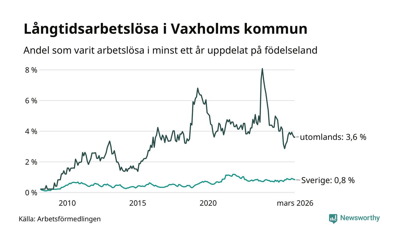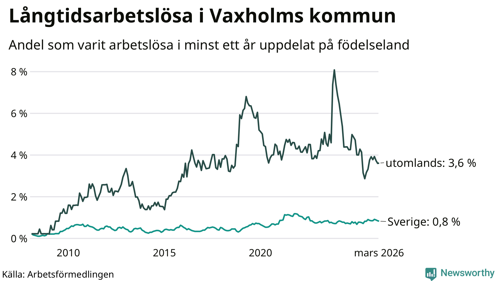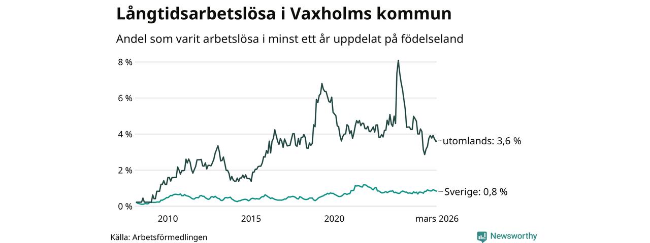 40 av de långtidsarbetslösa i Vaxholm är födda i Sverige, medan 25 är födda utomlands. Det innebär att långtidsarbetslösheten bland Sverigefödda är 0,8 procent, medan den är fyra gånger så hög – 3,6 procent – bland födda utomlands. Även i riket som helhet är arbetslösheten högre bland utrikesfödda.