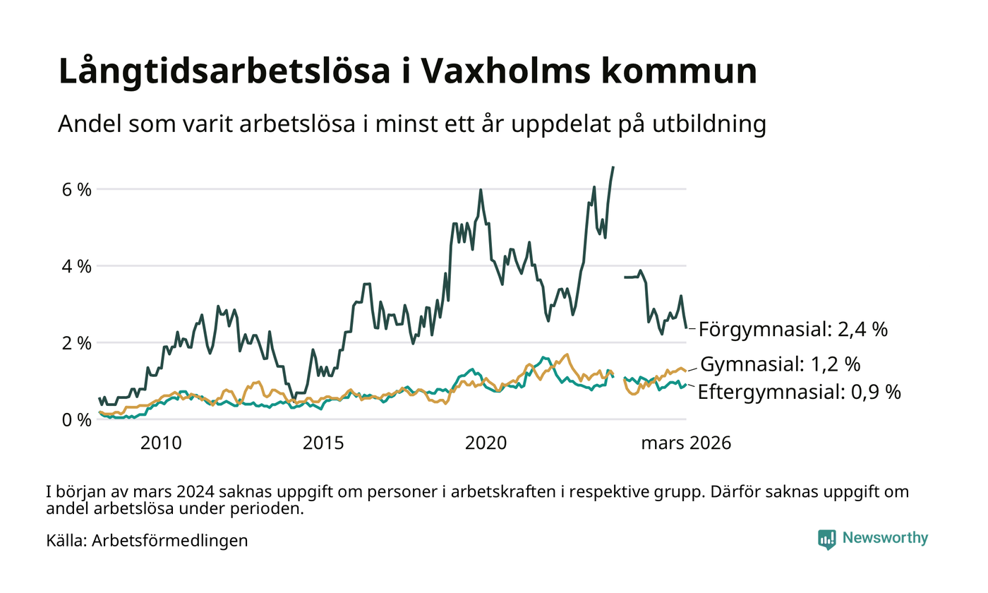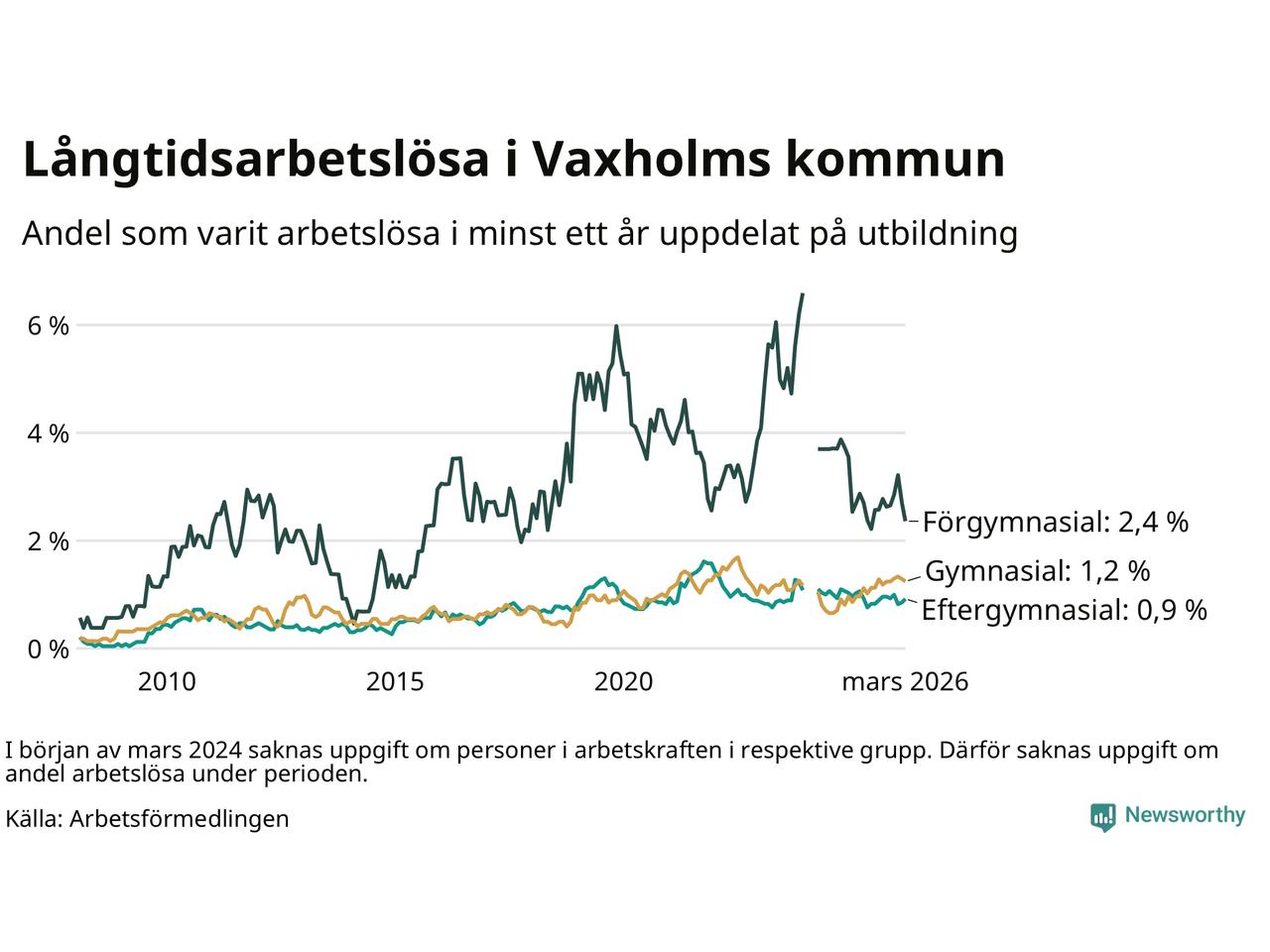I mars hade 65 Vaxholmsbor varit arbetslösa i minst ett år, vilket är en färre än månaden innan. 65 personer motsvarar 1,2 procent av arbetskraften i kommunen – andelen långtidsarbetslösa är ungefär på samma nivå som för ett år sedan. Vaxholm tillhör de kommuner som har lägst andel långtidsarbetslösa i hela landet just nu.