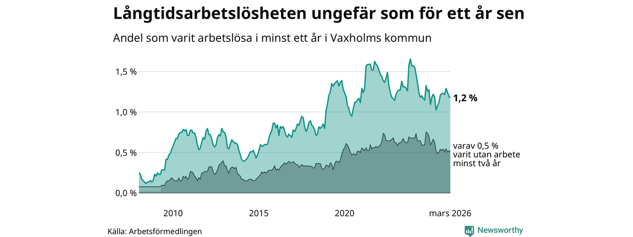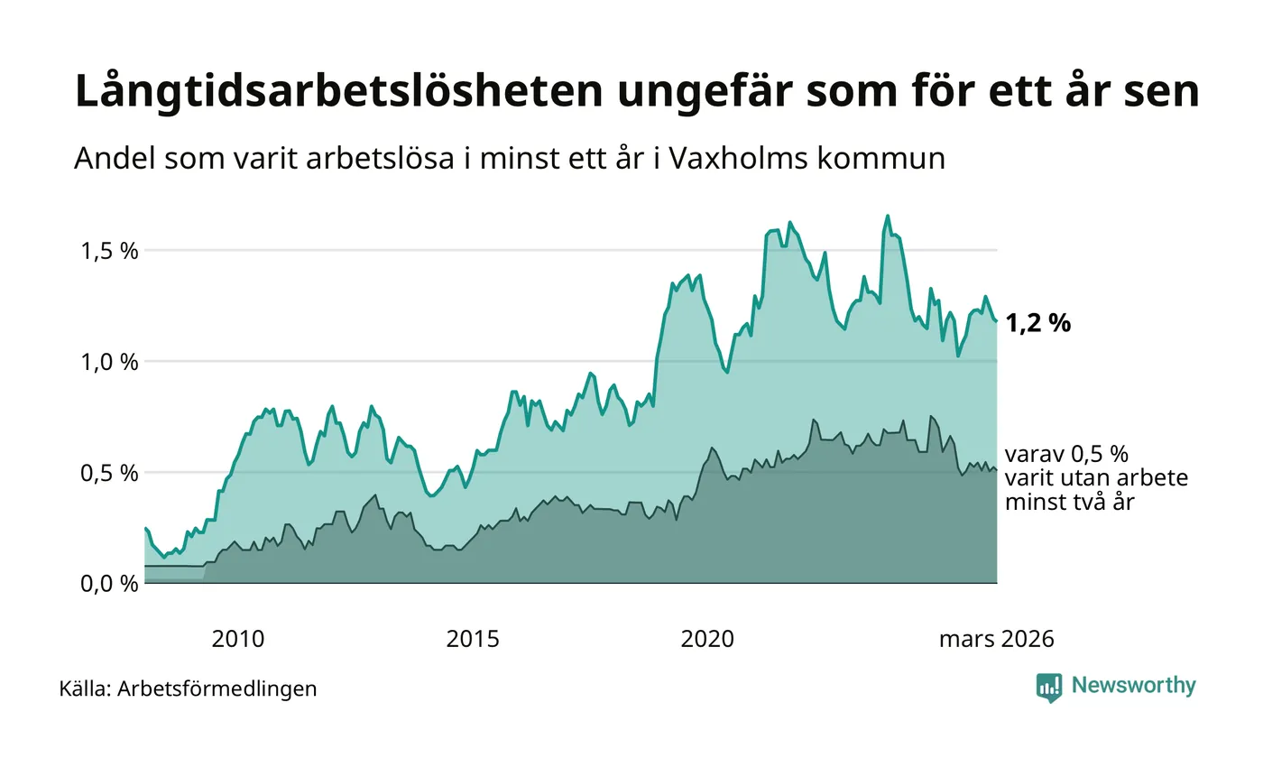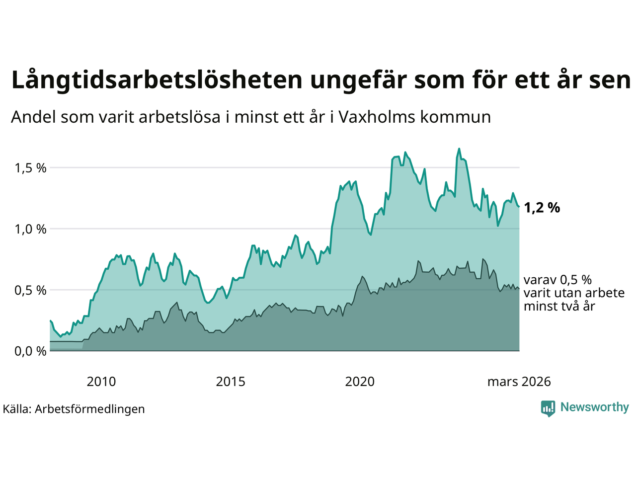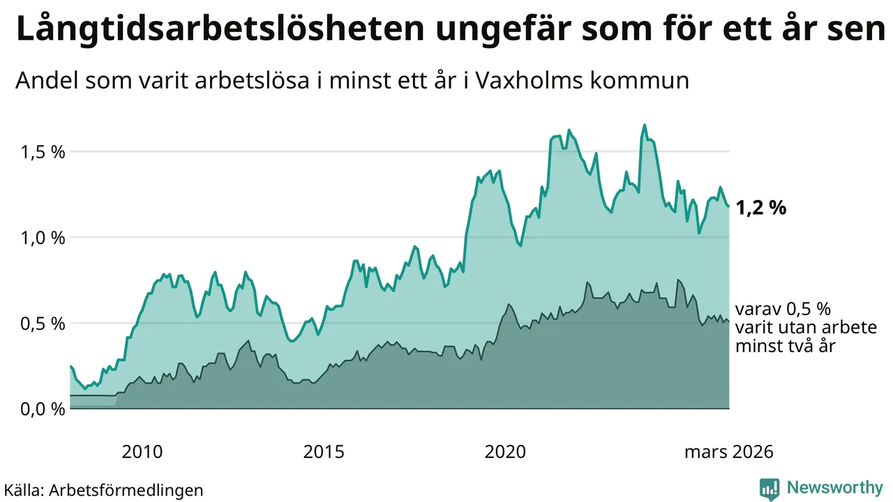 Andelen som varit utan arbete i minst ett år i Vaxholm var ungefär lika stor i mars jämfört med samma månad för ett år sedan. Det visar Arbetsfömedlingens senaste månadsstatistik.