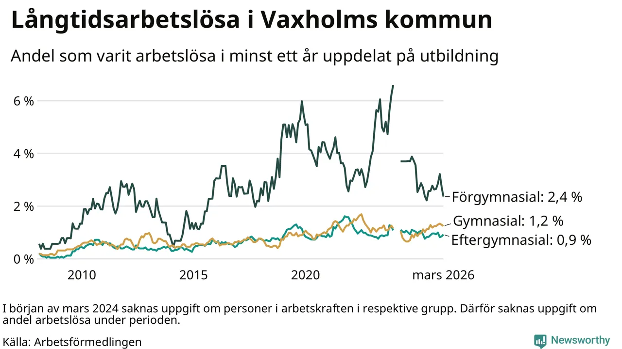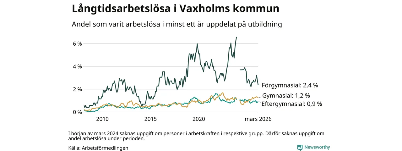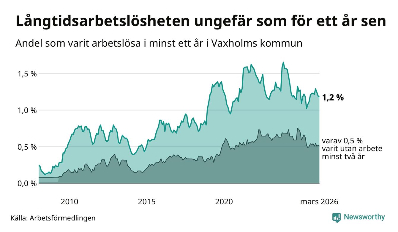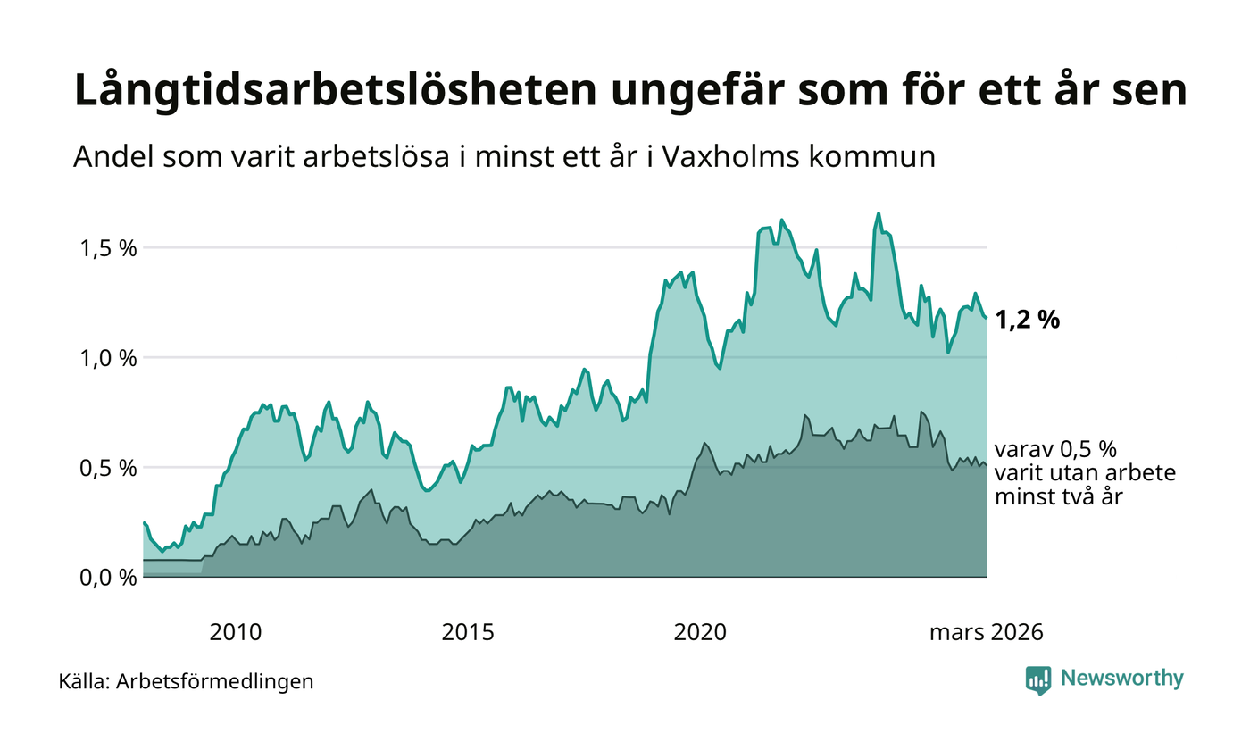 Andelen som varit utan arbete i minst ett år i Vaxholm var ungefär lika stor i mars jämfört med samma månad för ett år sedan. Det visar Arbetsfömedlingens senaste månadsstatistik.