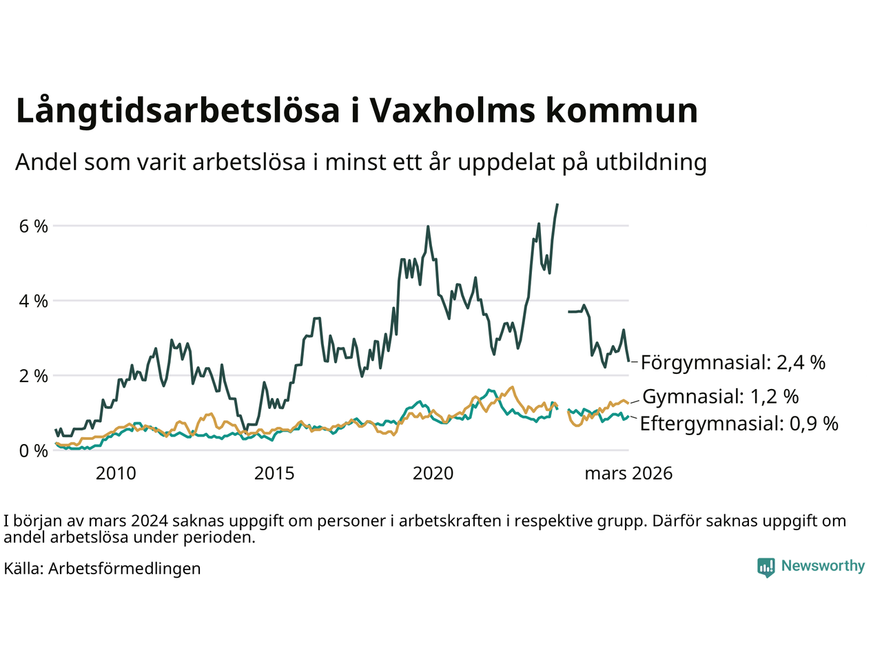 | Andel arbetslösa i minst ett år | 1,2 % | 2,9 % | 2,9 % |