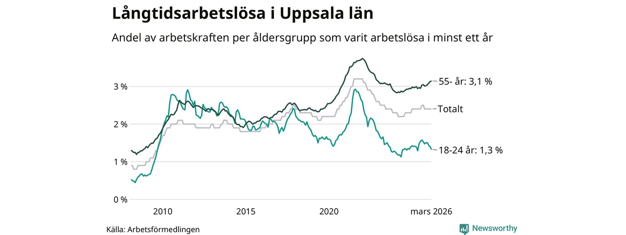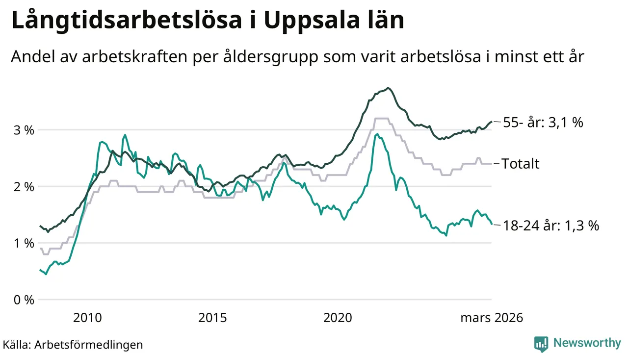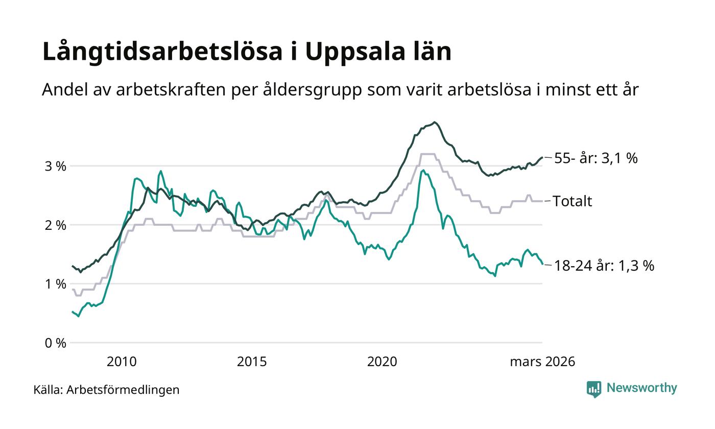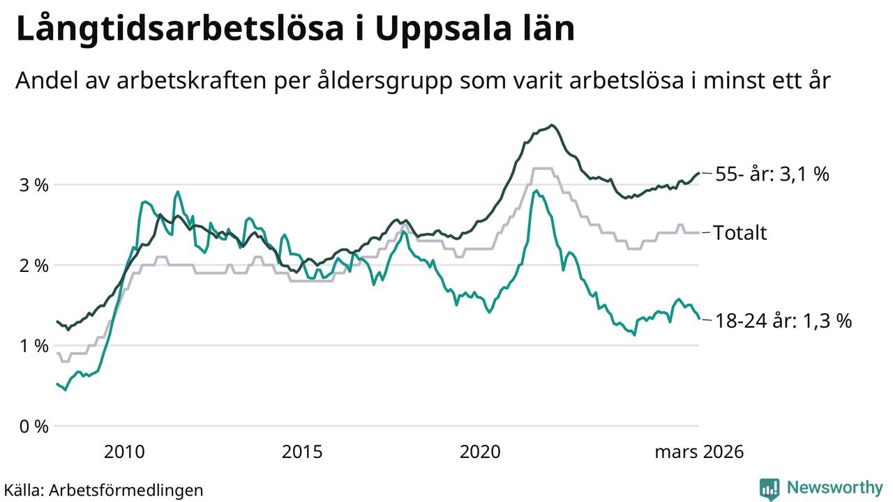 Av de 4 945 personerna som varit arbetslösa i mer än ett år i Uppsala län är 1 276 personer mellan 55 och 661 år och 315 är mellan 18 och 24 år. För den äldre gruppen är andelen arbetslösa 3,1 procent medan den i den yngre gruppen är 1,3 procent. Även i riket som helhet är långtidsarbetslösheten högre i gruppen äldre.