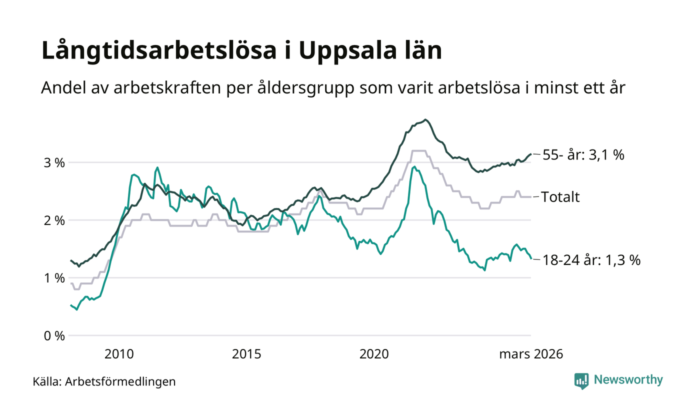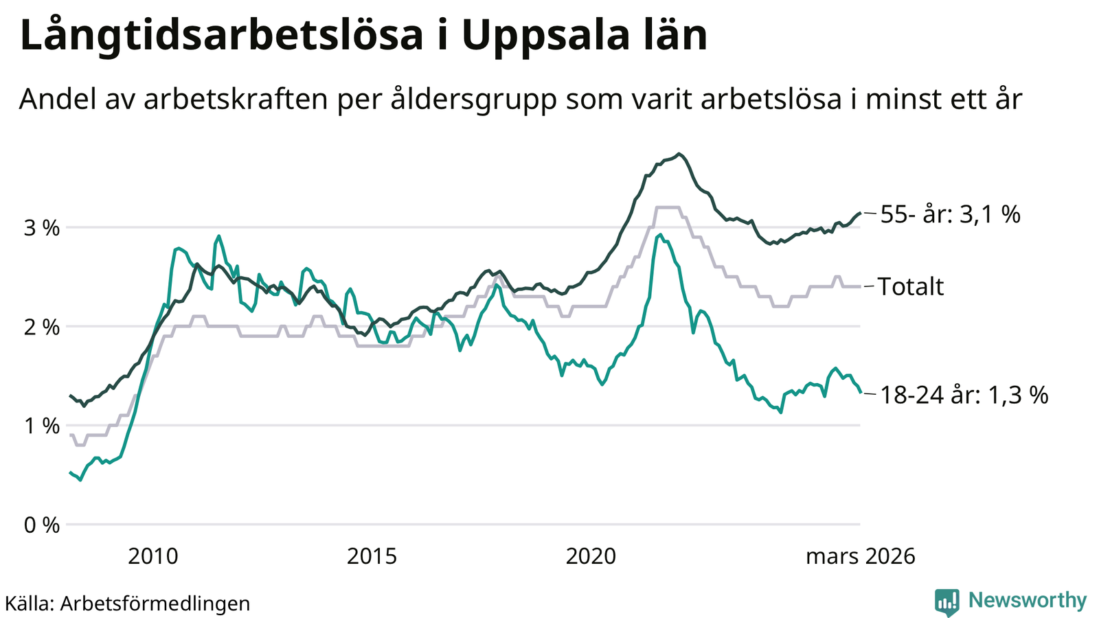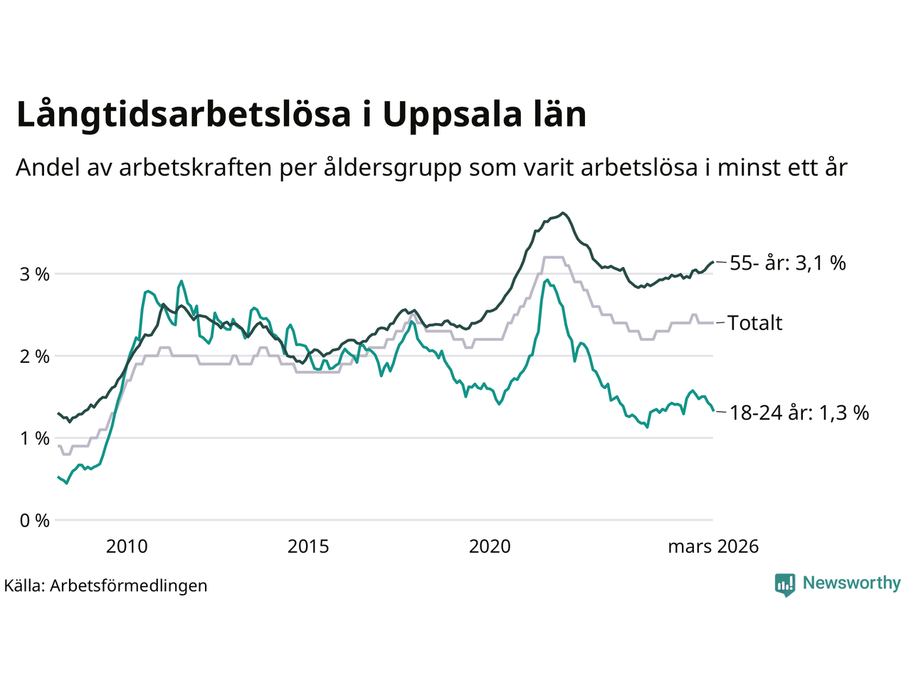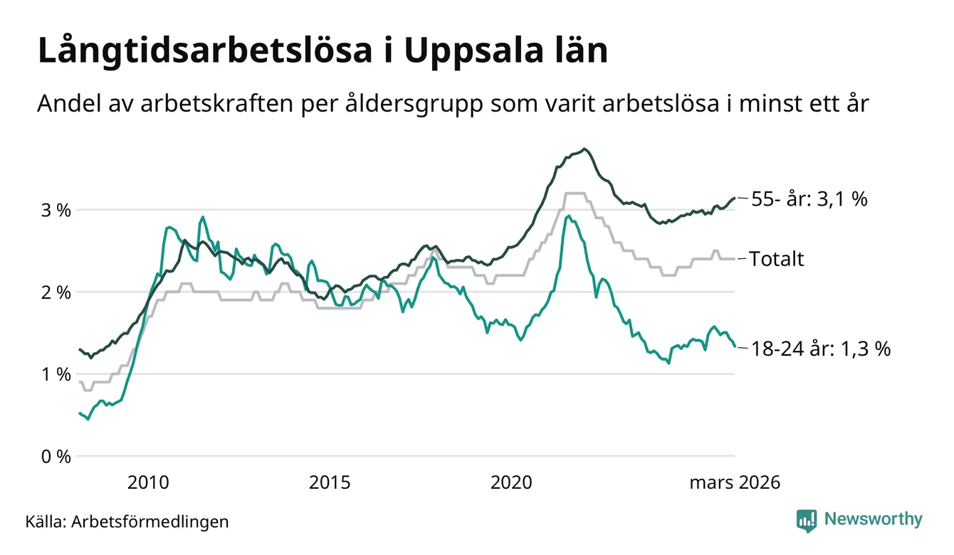 Av de 4 945 personerna som varit arbetslösa i mer än ett år i Uppsala län är 1 276 personer mellan 55 och 661 år och 315 är mellan 18 och 24 år. För den äldre gruppen är andelen arbetslösa 3,1 procent medan den i den yngre gruppen är 1,3 procent. Även i riket som helhet är långtidsarbetslösheten högre i gruppen äldre.