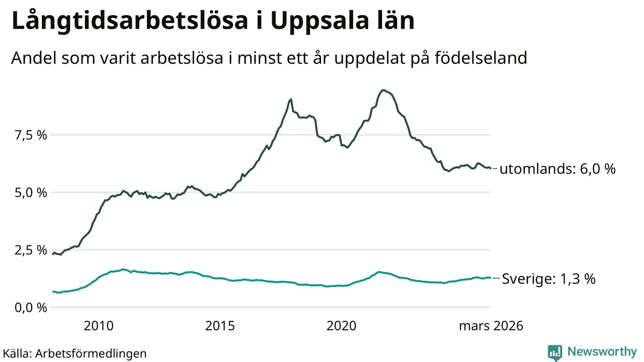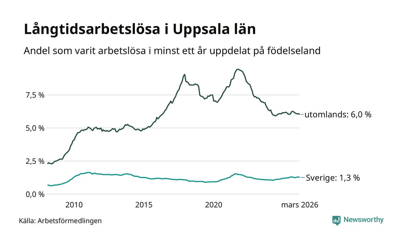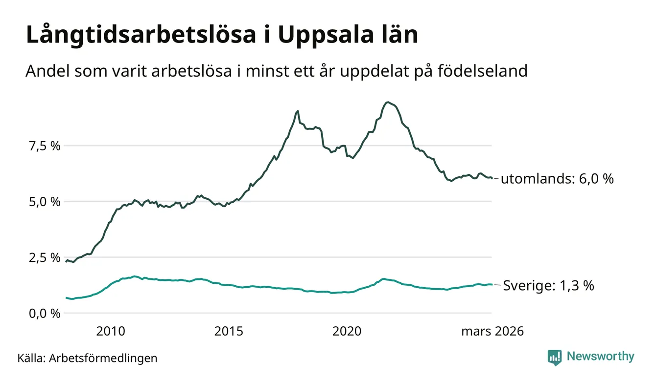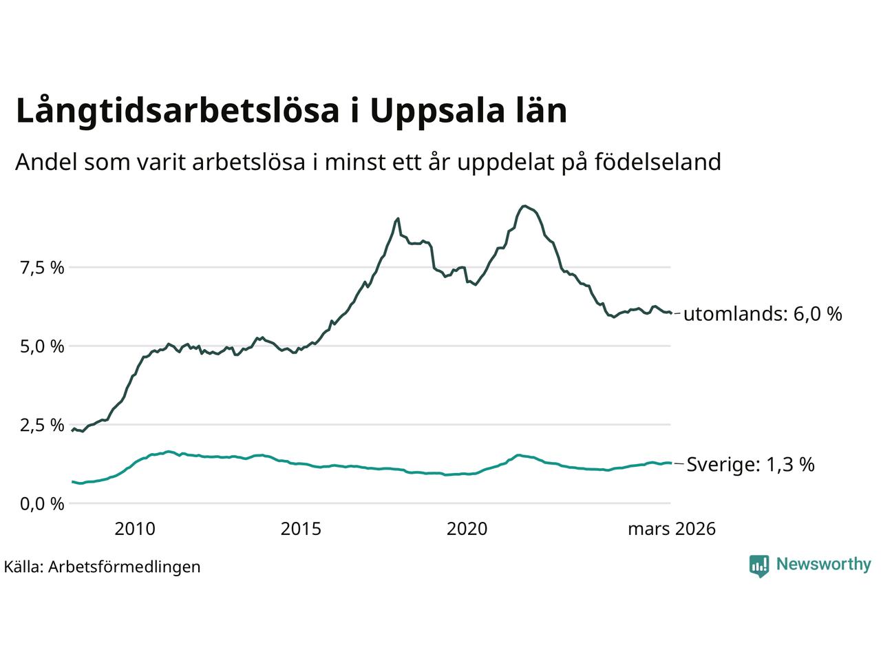 1 999 av de långtidsarbetslösa i Uppsala län är födda i Sverige och mellan 2 947 och 2 950 är födda utomlands. Det innebär att långtidsarbetslösheten bland Sverigefödda är 1,3 procent, medan den ligger på 6,0 procent för utlandsfödda.