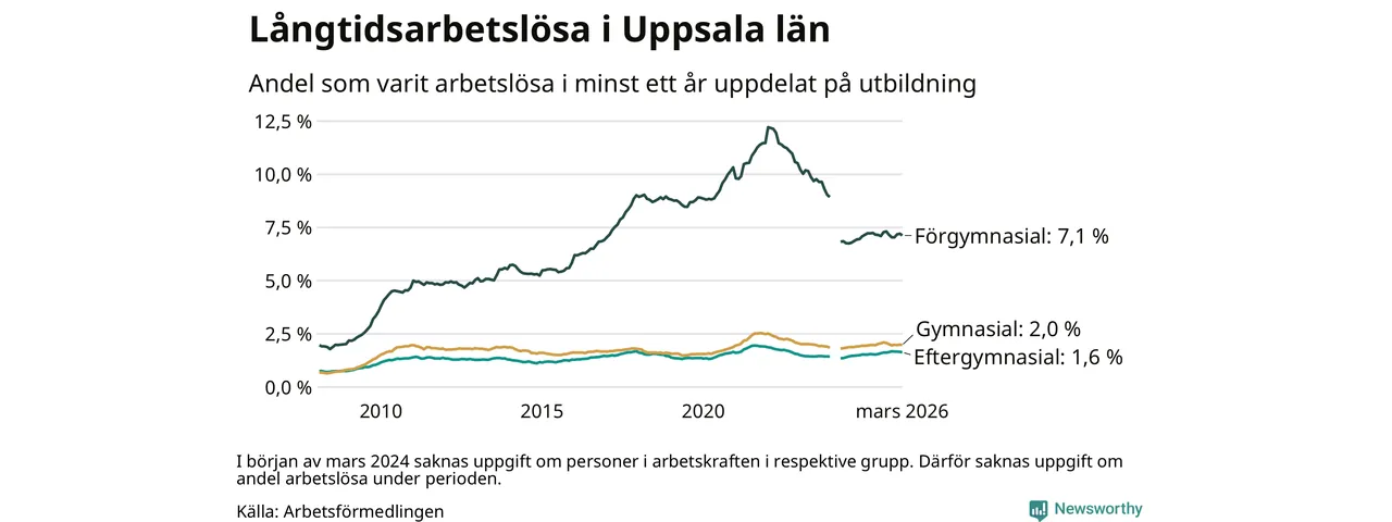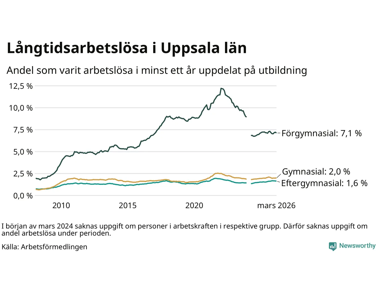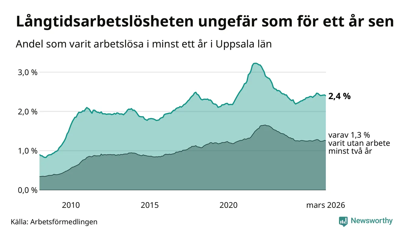I mars hade 4 945 Uppsalabor varit arbetslösa i minst ett år, vilket är 51 färre än månaden innan. 4 945 personer motsvarar 2,4 procent av arbetskraften i länet – andelen långtidsarbetslösa är ungefär på samma nivå som för ett år sedan.