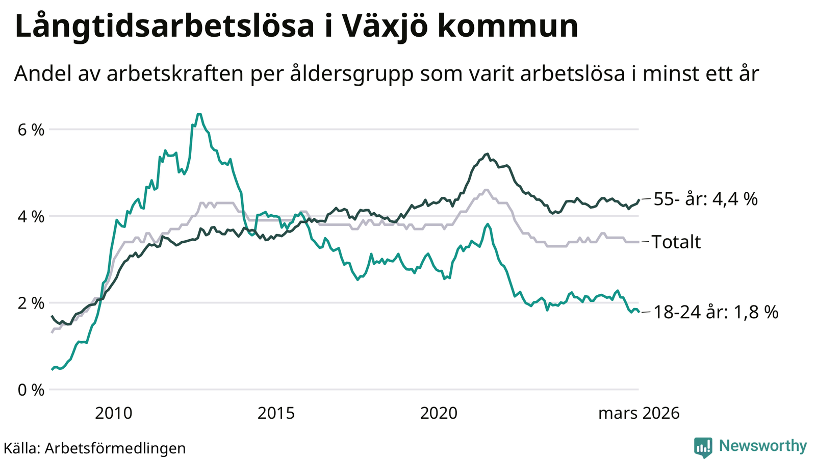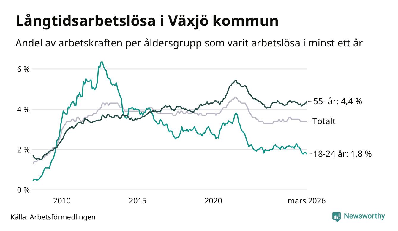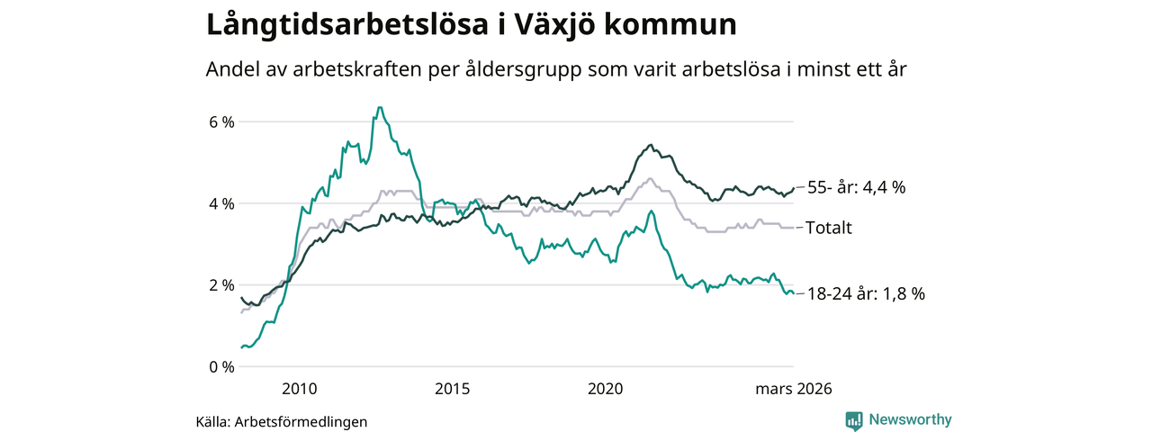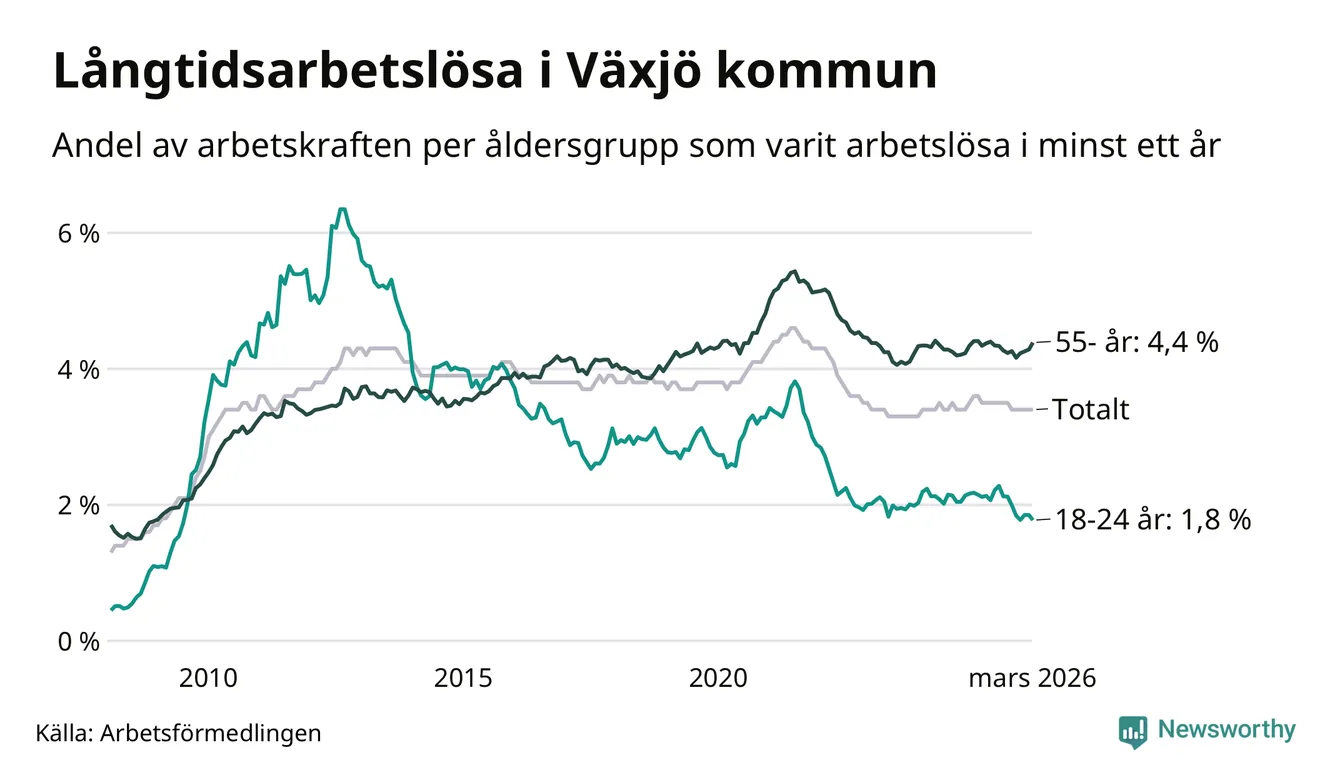 Av de 1 709 personerna som varit arbetslösa i mer än ett år i Växjö kommun är 421 personer mellan 55 och 661 år och 119 är mellan 18 och 24 år. För den äldre gruppen är andelen arbetslösa 4,4 procent medan den i den yngre gruppen är 1,8 procent. Även i riket som helhet är långtidsarbetslösheten högre i gruppen äldre.