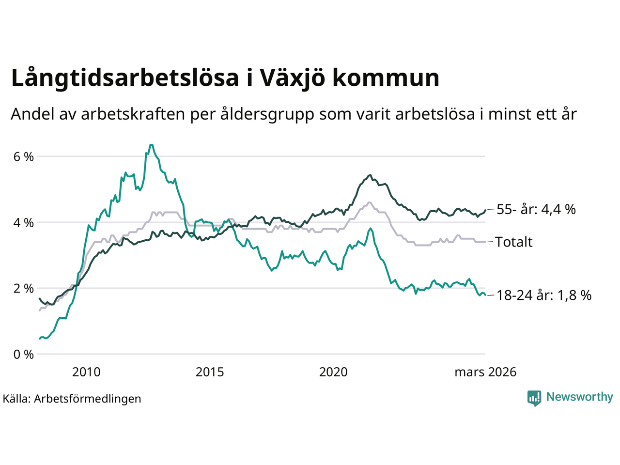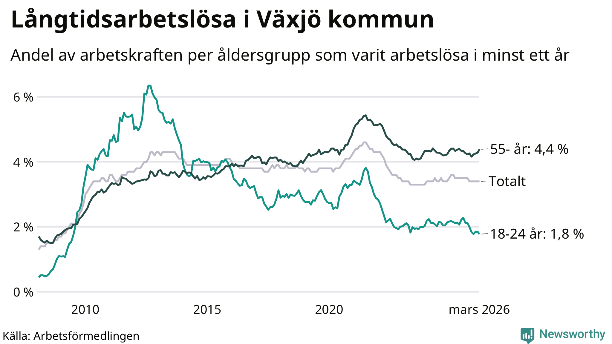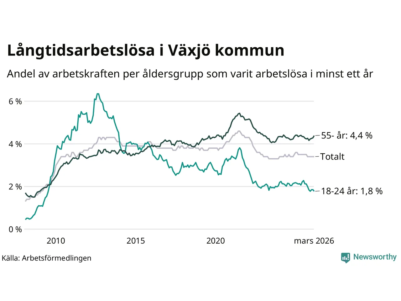 Av de 1 709 personerna som varit arbetslösa i mer än ett år i Växjö kommun är 421 personer mellan 55 och 661 år och 119 är mellan 18 och 24 år. För den äldre gruppen är andelen arbetslösa 4,4 procent medan den i den yngre gruppen är 1,8 procent. Även i riket som helhet är långtidsarbetslösheten högre i gruppen äldre.