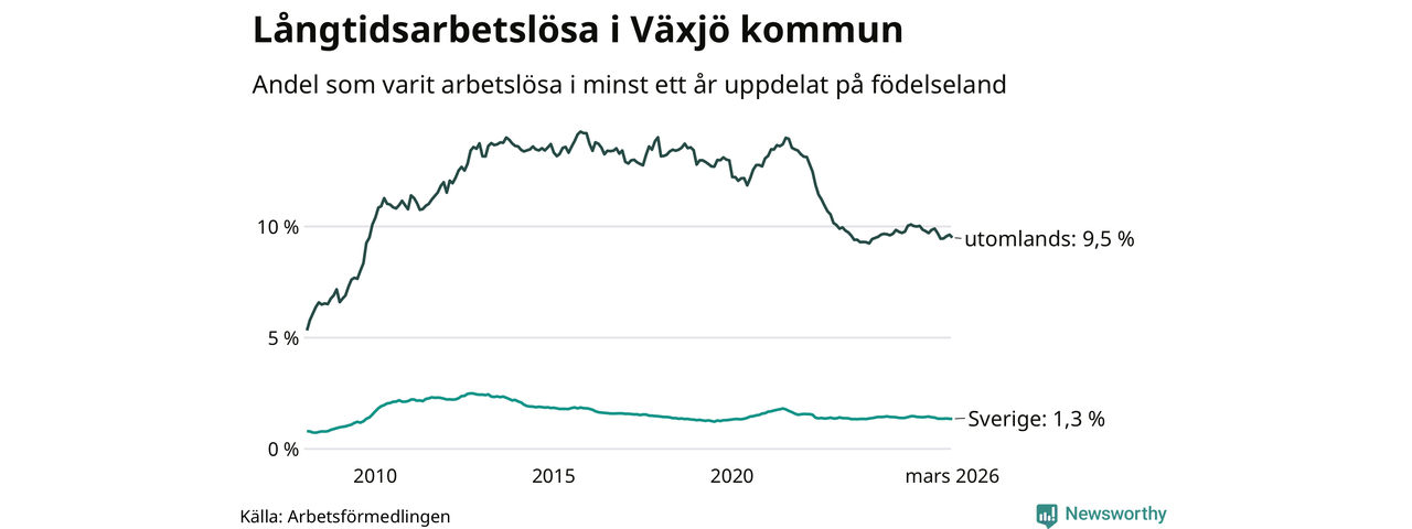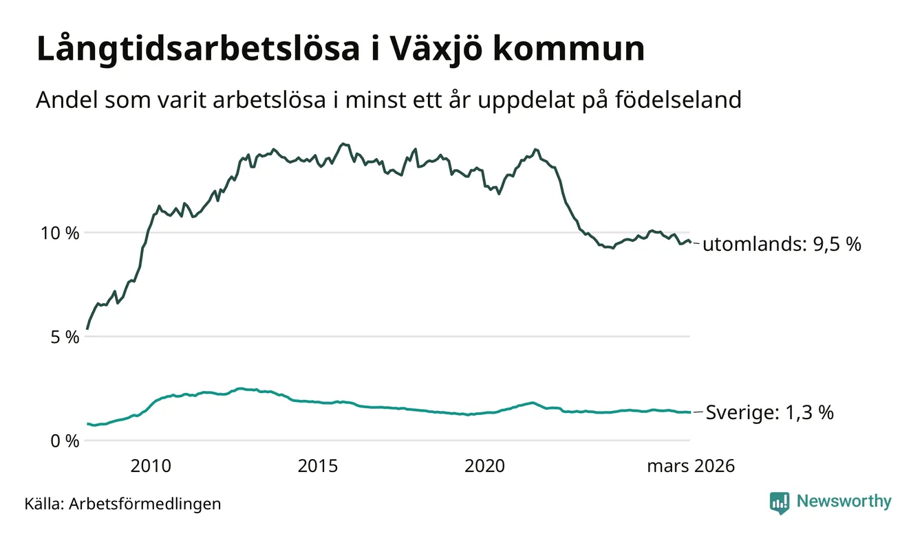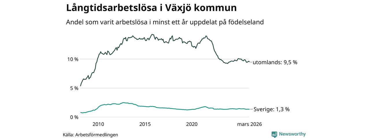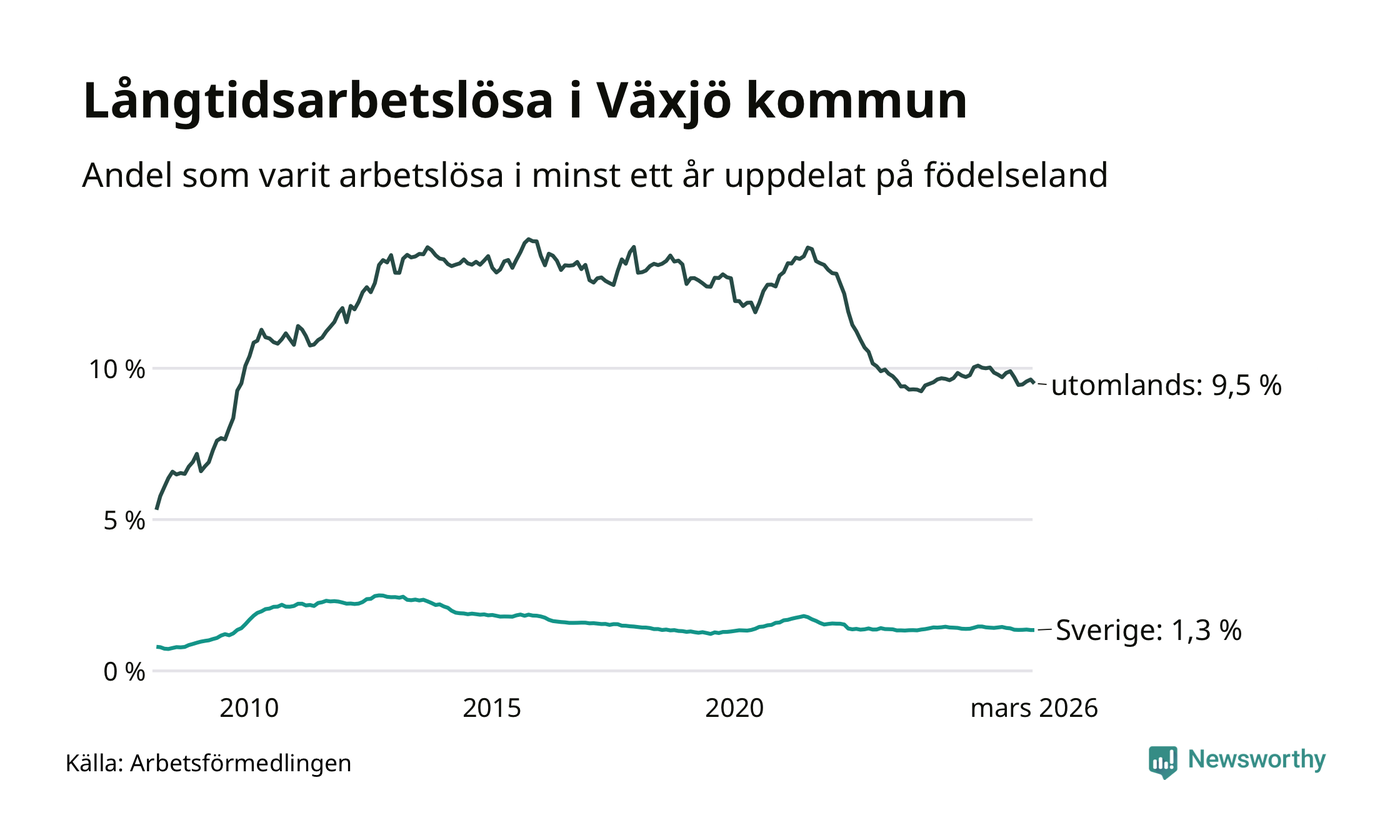 511 av de långtidsarbetslösa i Växjö är födda i Sverige, medan 1 198 är födda utomlands. Det innebär att långtidsarbetslösheten bland Sverigefödda är 1,3 procent, medan den är sju gånger så hög – 9,5 procent – bland födda utomlands. Även i riket som helhet är arbetslösheten högre bland utrikesfödda.