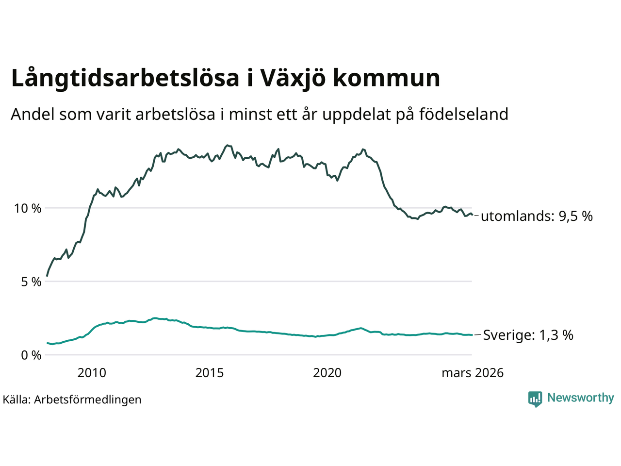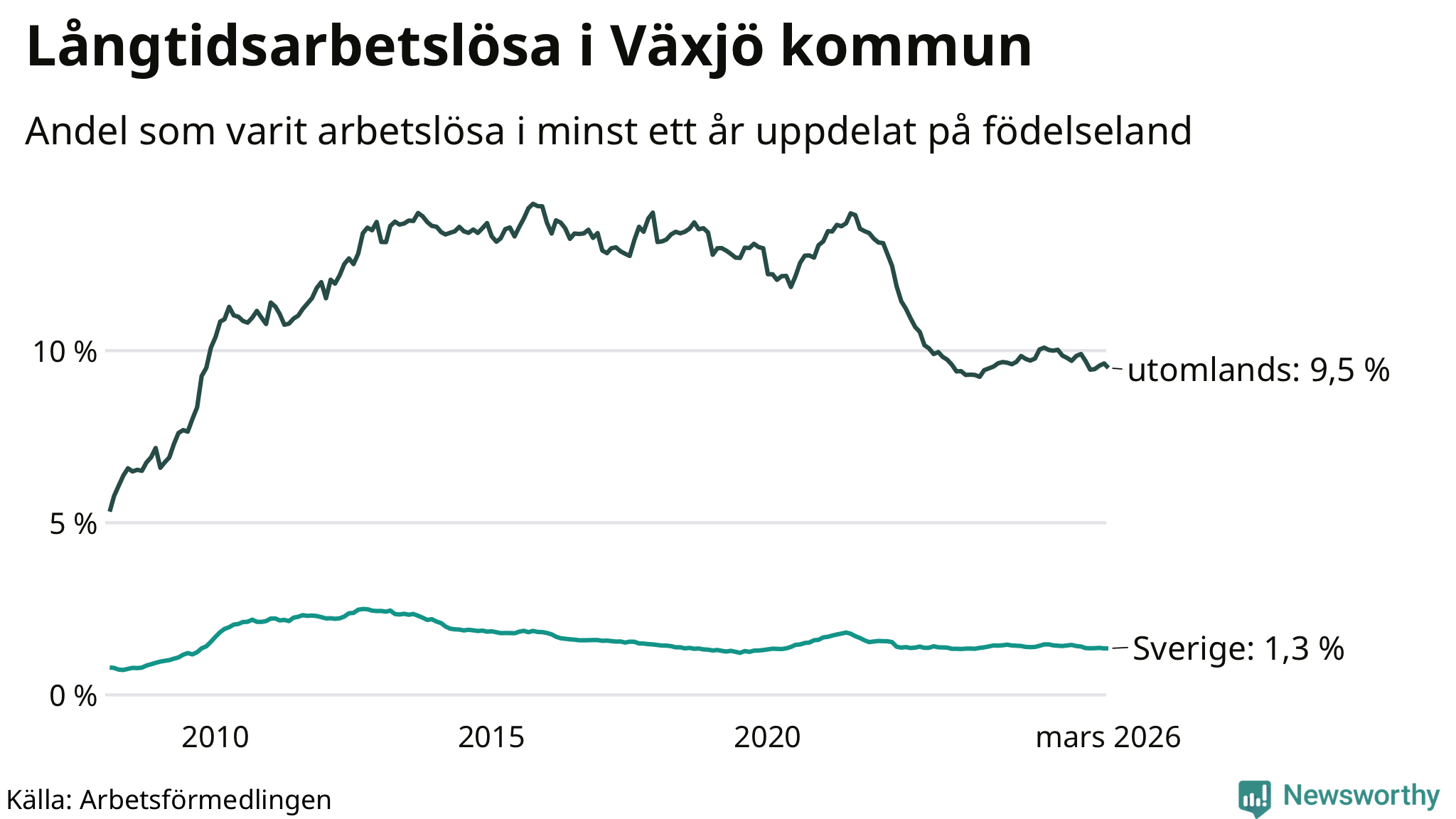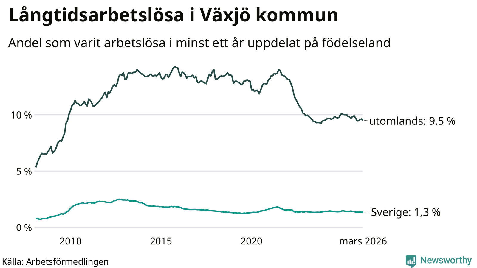 511 av de långtidsarbetslösa i Växjö är födda i Sverige, medan 1 198 är födda utomlands. Det innebär att långtidsarbetslösheten bland Sverigefödda är 1,3 procent, medan den är sju gånger så hög – 9,5 procent – bland födda utomlands. Även i riket som helhet är arbetslösheten högre bland utrikesfödda.