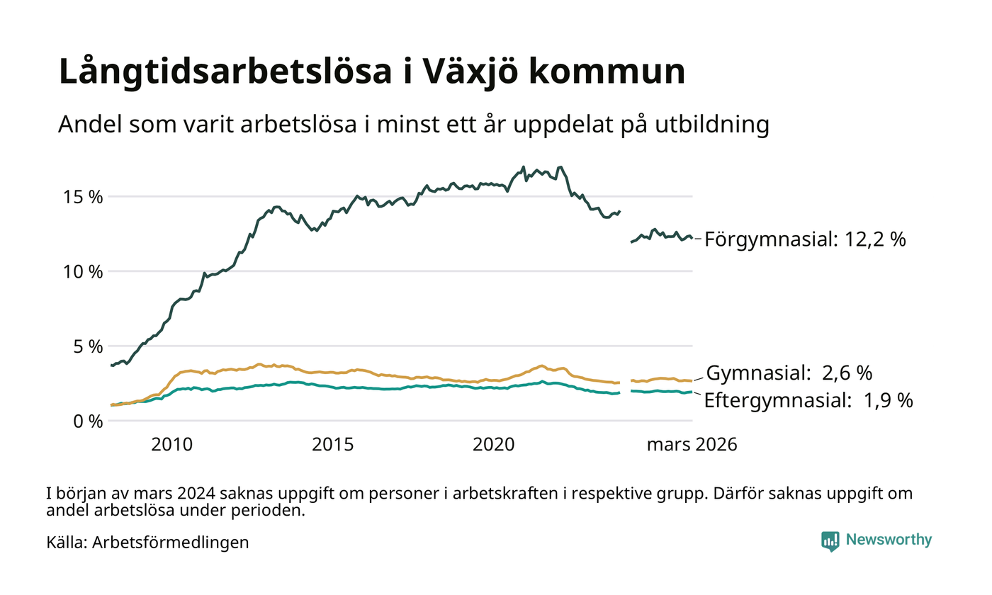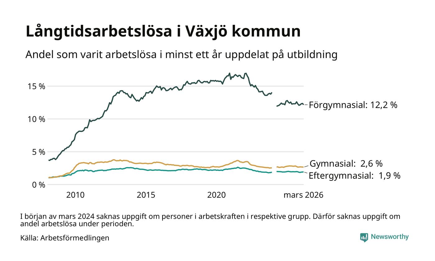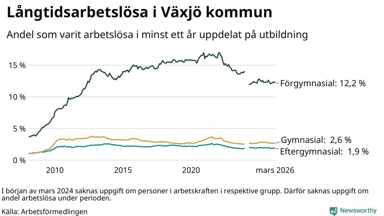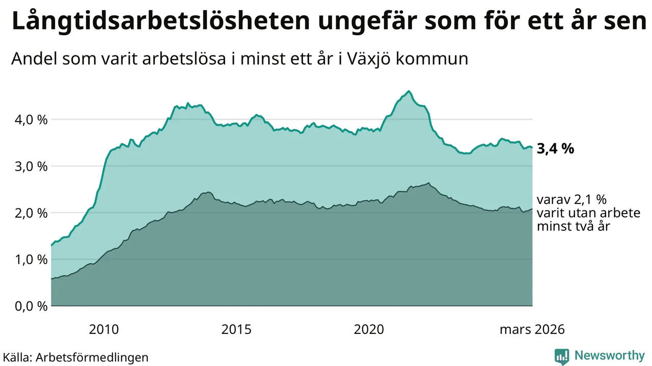 I mars hade 1 709 Växjöbor varit arbetslösa i minst ett år, vilket är 15 färre än månaden innan. 1 709 personer motsvarar 3,4 procent av arbetskraften i kommunen – andelen långtidsarbetslösa är ungefär på samma nivå som för ett år sedan.