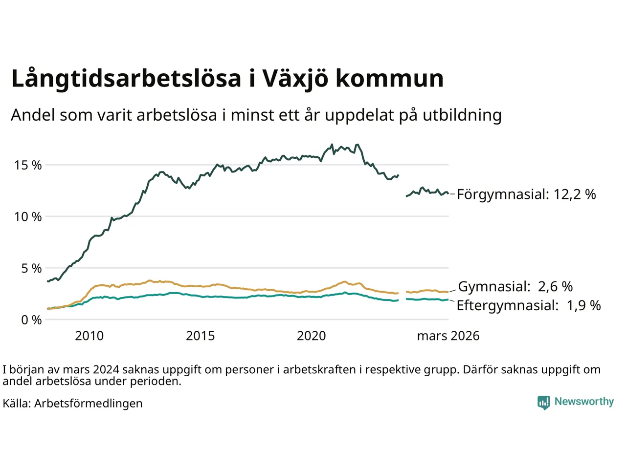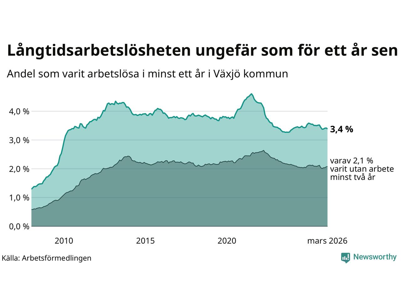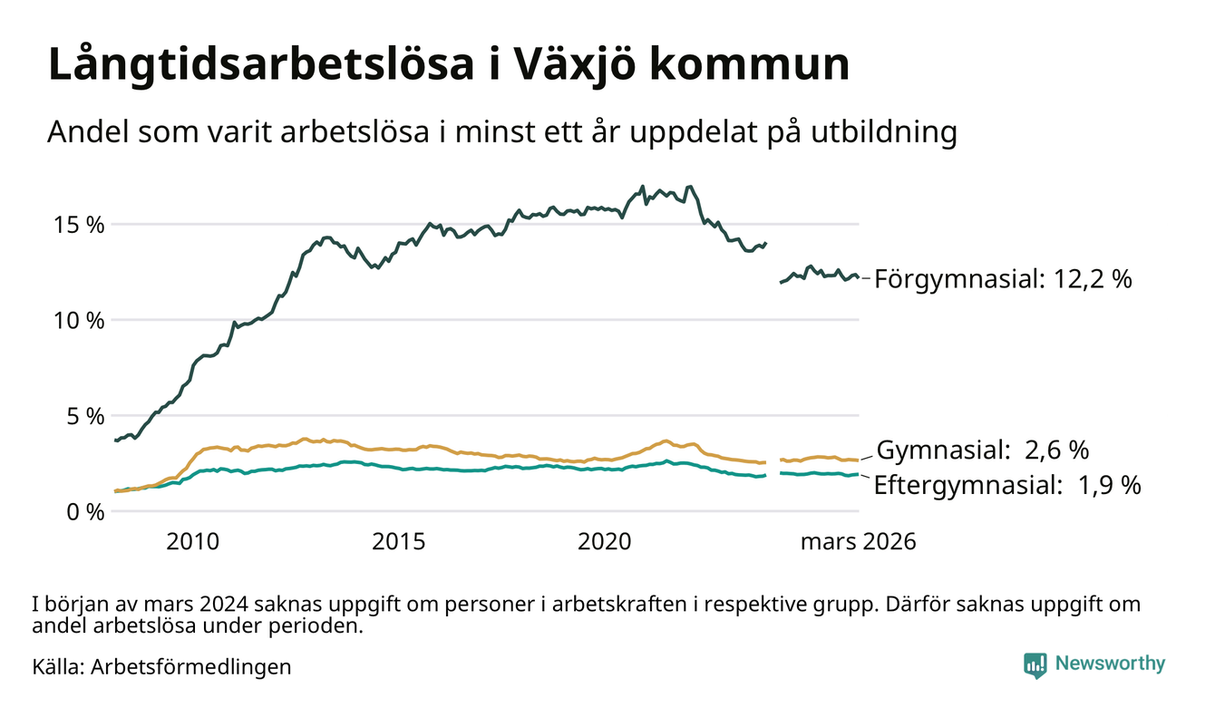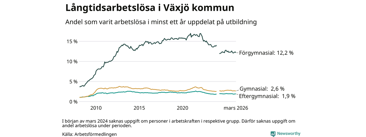 I mars hade 1 709 Växjöbor varit arbetslösa i minst ett år, vilket är 15 färre än månaden innan. 1 709 personer motsvarar 3,4 procent av arbetskraften i kommunen – andelen långtidsarbetslösa är ungefär på samma nivå som för ett år sedan.