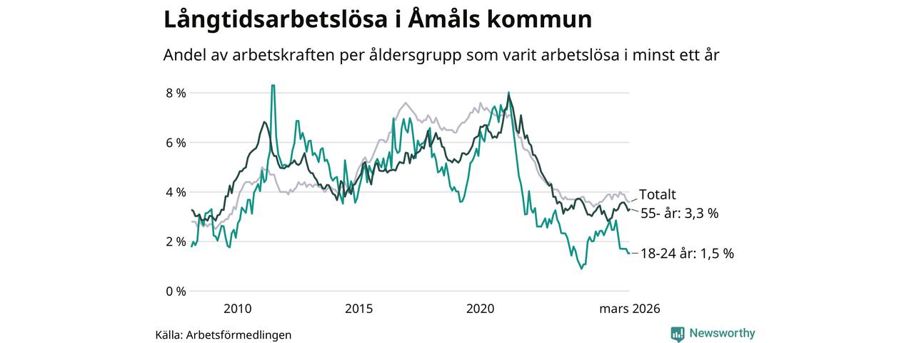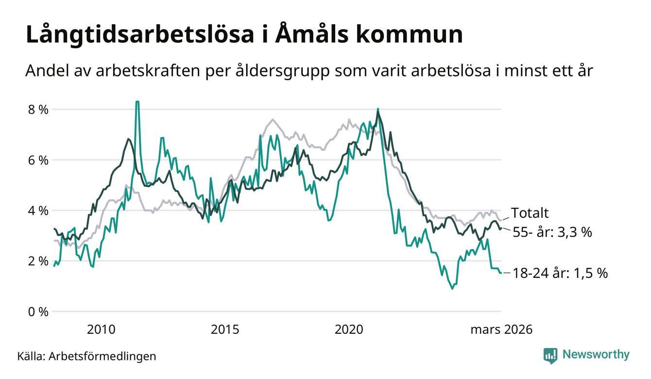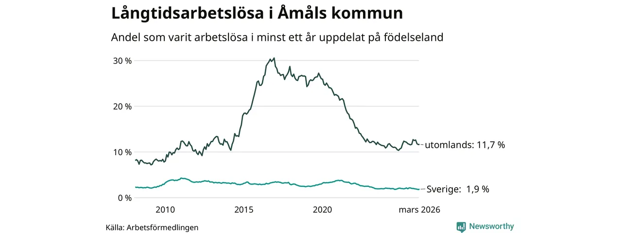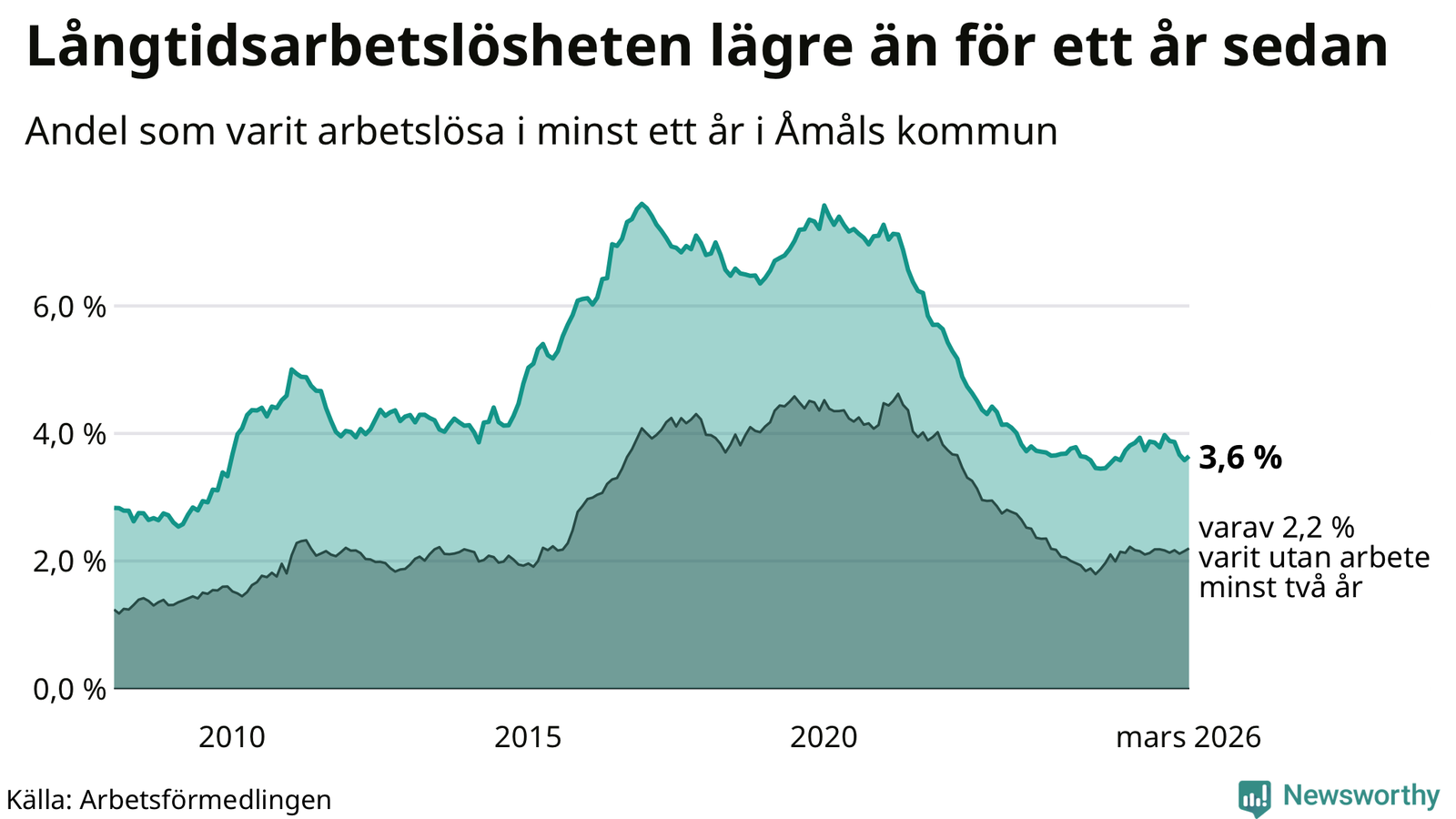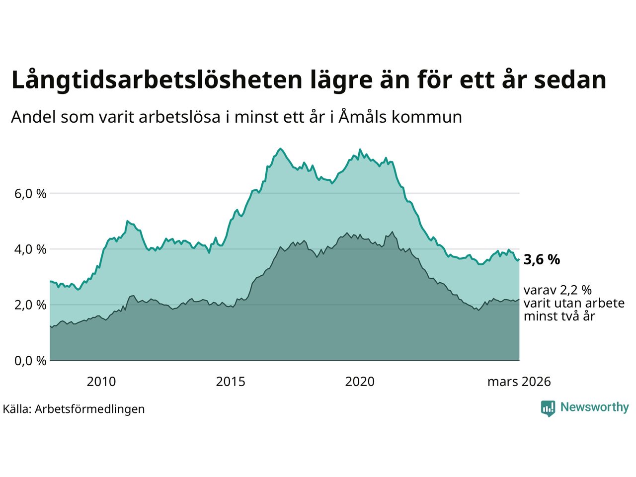 I mars hade 194 Åmålsbor varit arbetslösa i minst ett år, vilket är tre fler än månaden innan. Det är den första månaden sedan oktober 2025 som antalet arbetslösa ökar. 194 personer motsvarar 3,6 procent av arbetskraften i kommunen – andelen långtidsarbetslösa är 0,2 procentenheter lägre än samma månad för ett år sedan.