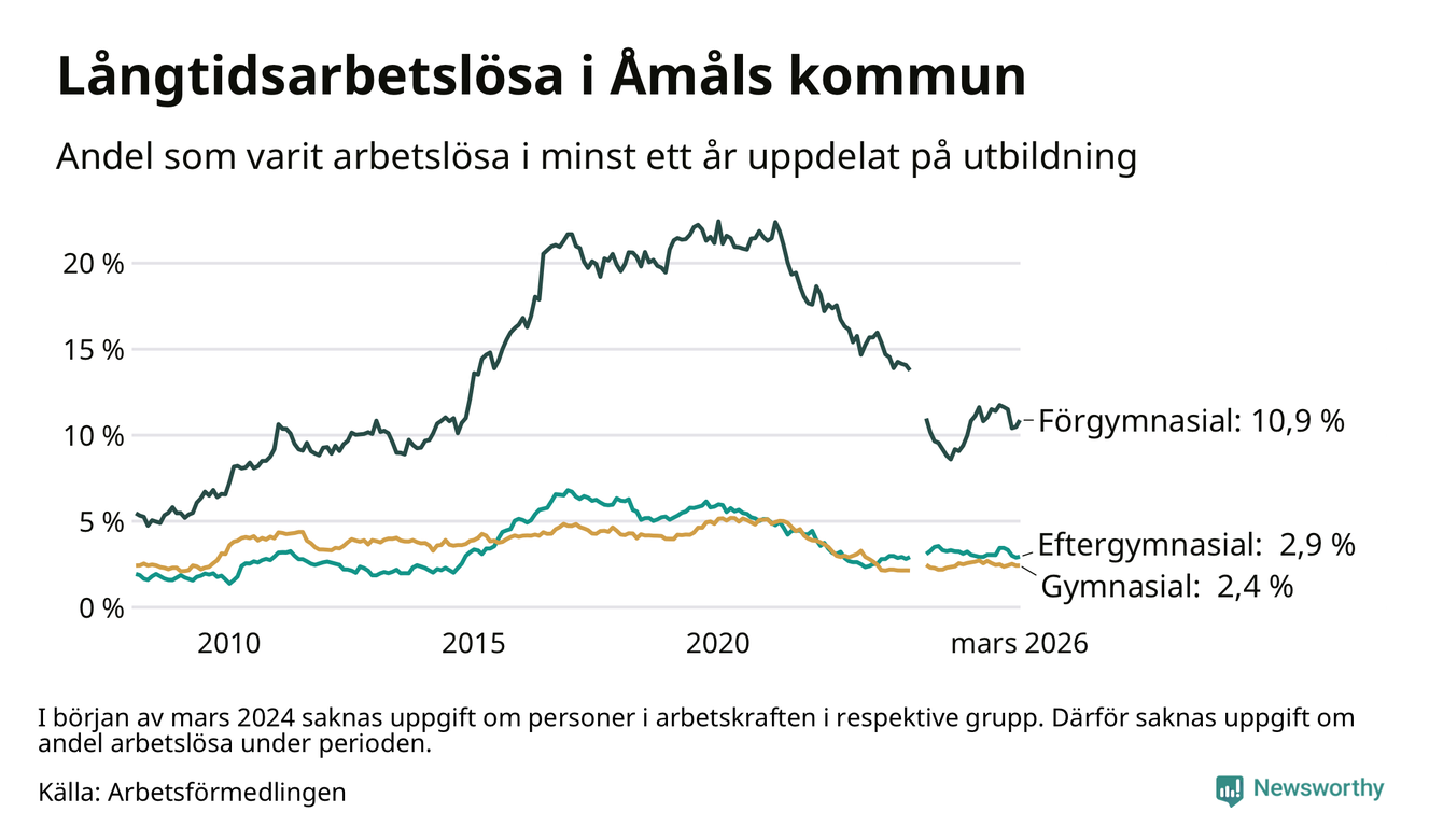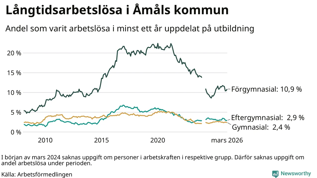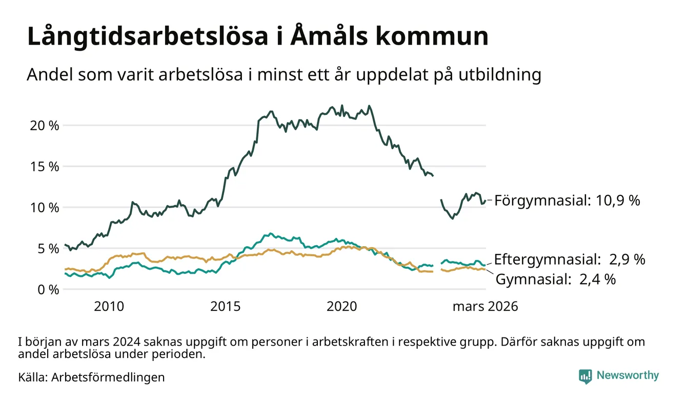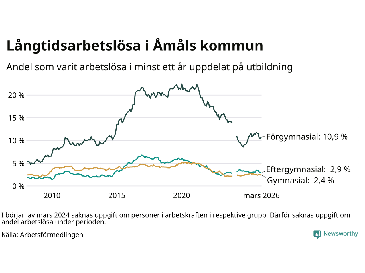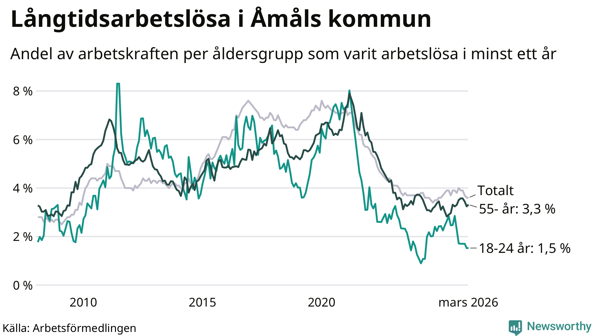 I mars hade 194 Åmålsbor varit arbetslösa i minst ett år, vilket är tre fler än månaden innan. Det är den första månaden sedan oktober 2025 som antalet arbetslösa ökar. 194 personer motsvarar 3,6 procent av arbetskraften i kommunen – andelen långtidsarbetslösa är 0,2 procentenheter lägre än samma månad för ett år sedan.