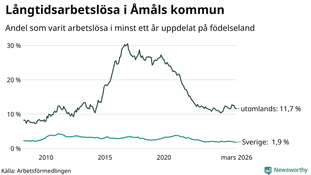 81 av de långtidsarbetslösa i Åmål är födda i Sverige, medan 113 är födda utomlands. Det innebär att långtidsarbetslösheten bland Sverigefödda är 1,9 procent, medan den är sex gånger så hög – 11,7 procent – bland födda utomlands. Även i riket som helhet är arbetslösheten högre bland utrikesfödda.
