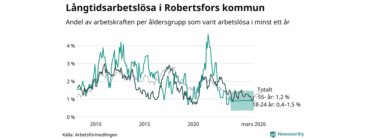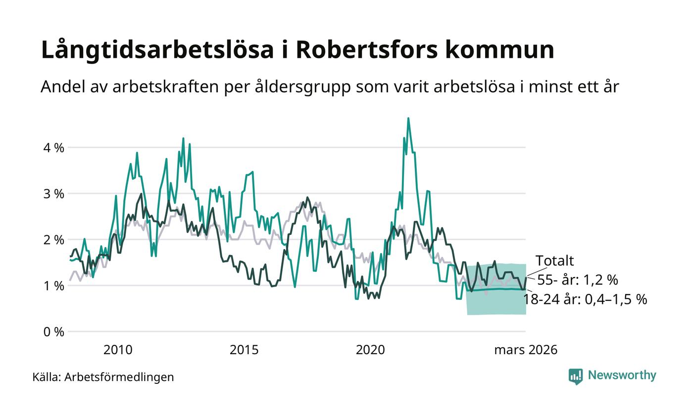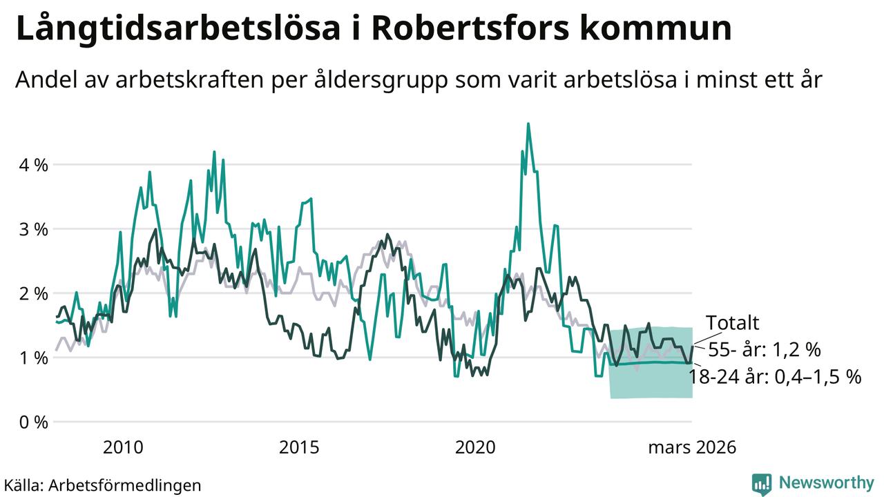 Av de 36 personerna som varit arbetslösa i mer än ett år i Robertsfors kommun är nio personer mellan 55 och 661 år och mellan en och fyra är mellan 18 och 24 år. För den äldre gruppen är andelen arbetslösa 1,2 procent medan den i den yngre gruppen är mellan 0,4 och 1,5 procent. Även i riket som helhet är långtidsarbetslösheten högre i gruppen äldre.