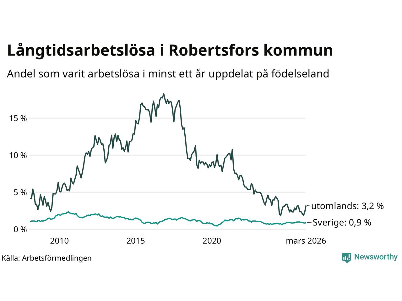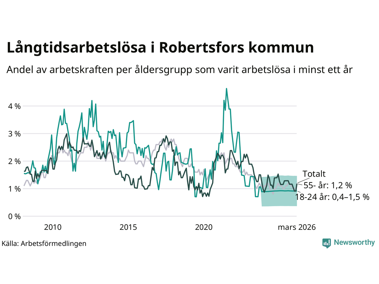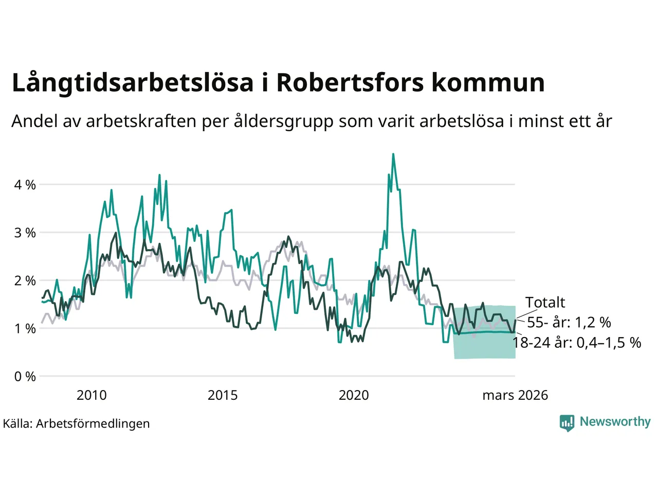 | Andel arbetslösa i minst ett år | 1,2 % | 1,4 % | 2,9 % |